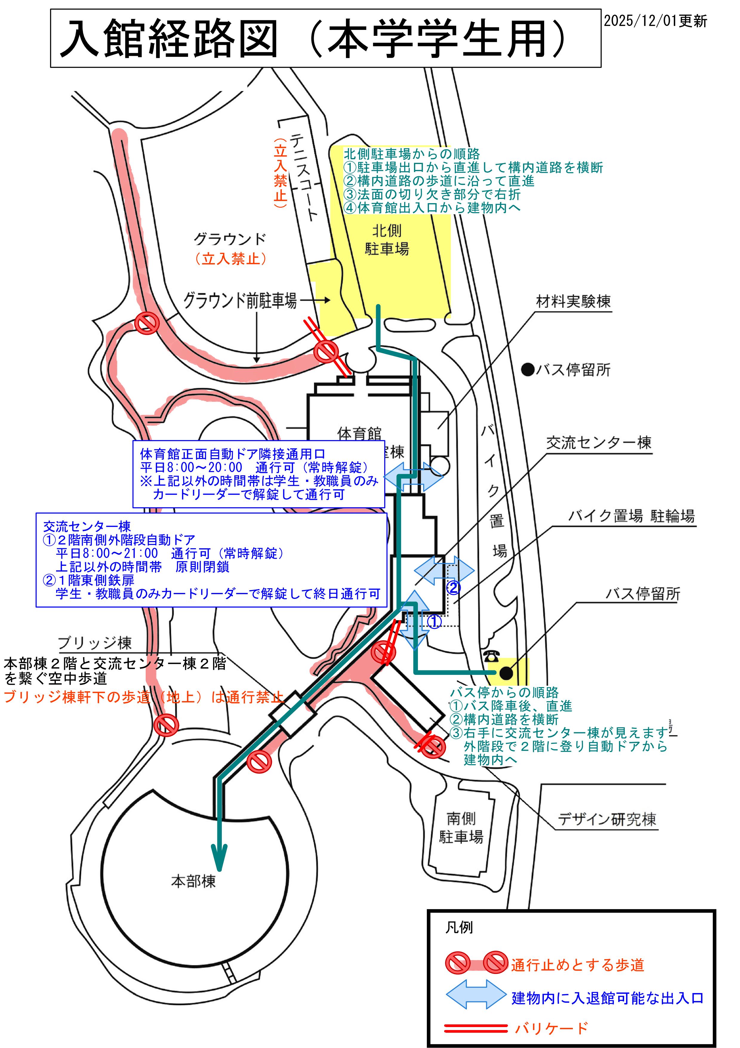 - 大学構内の移動(本部棟、交流棟、デザイン研究棟間の移動や駐車場及びバス停までの移動)については、屋外の移動を一部制限し、2階のブリッジ棟(連絡通路)を利用する屋内ルートとしています。