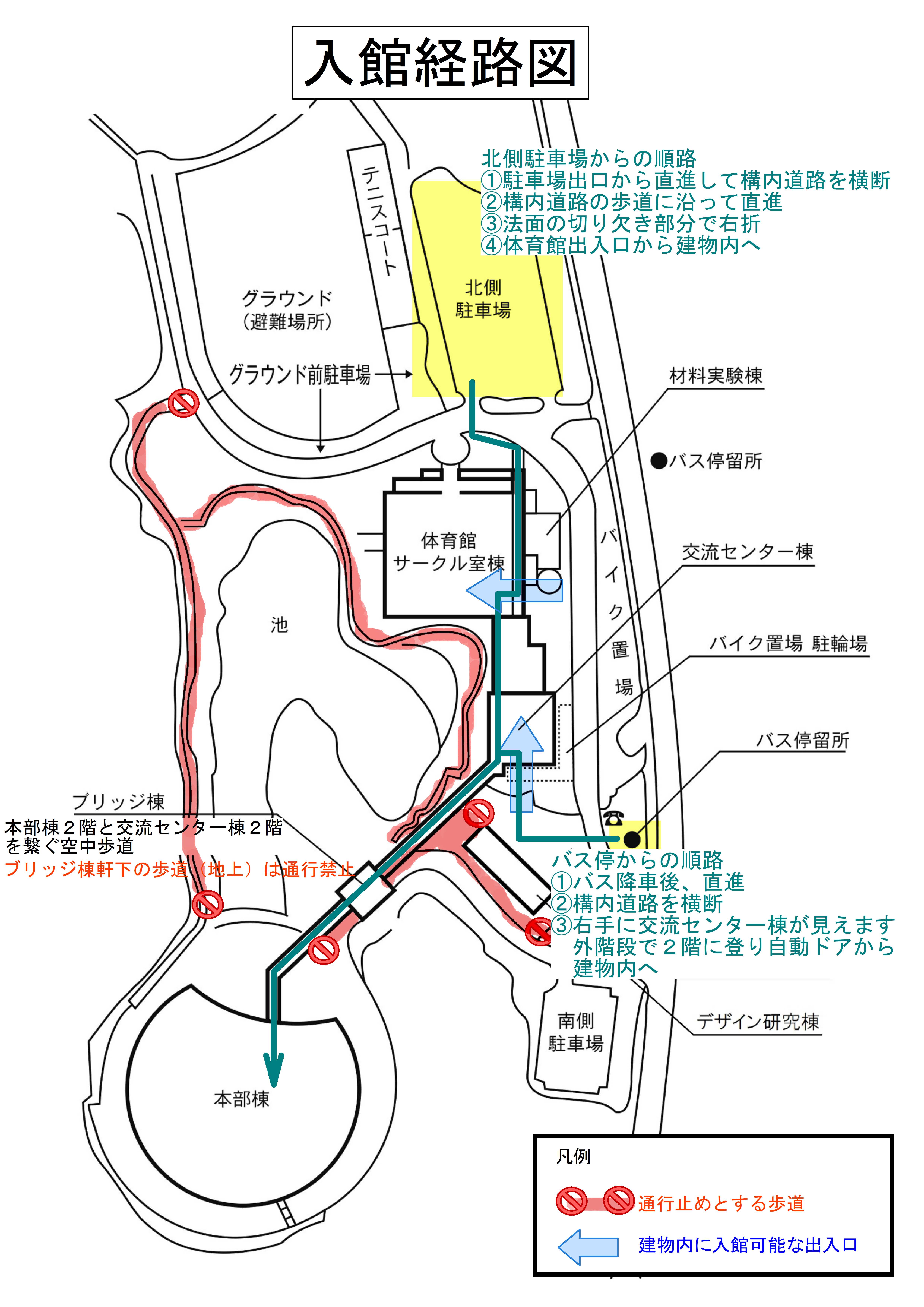 - 大学構内の移動(本部棟、交流棟、デザイン研究棟間の移動や駐車場及びバス停までの移動)については、屋外の移動を一部制限し、2階のブリッジ棟(連絡通路)を利用する屋内ルートとしています