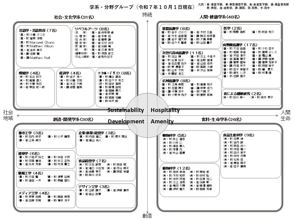看護 学群 | 事業構想 学群 | 食産業 学群 | 基盤 教育群 | 研究推進・地域 未来共創センター | |||