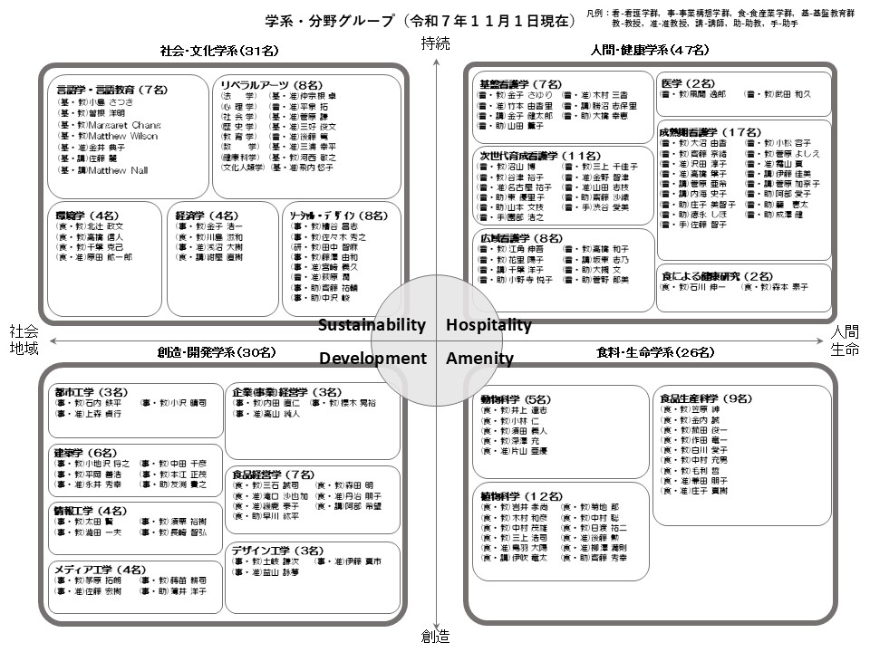 | 看護 学群 | 事業構想 学群 | 食産業 学群 | 基盤 教育群 | 研究推進・地域 未来共創センター | |||