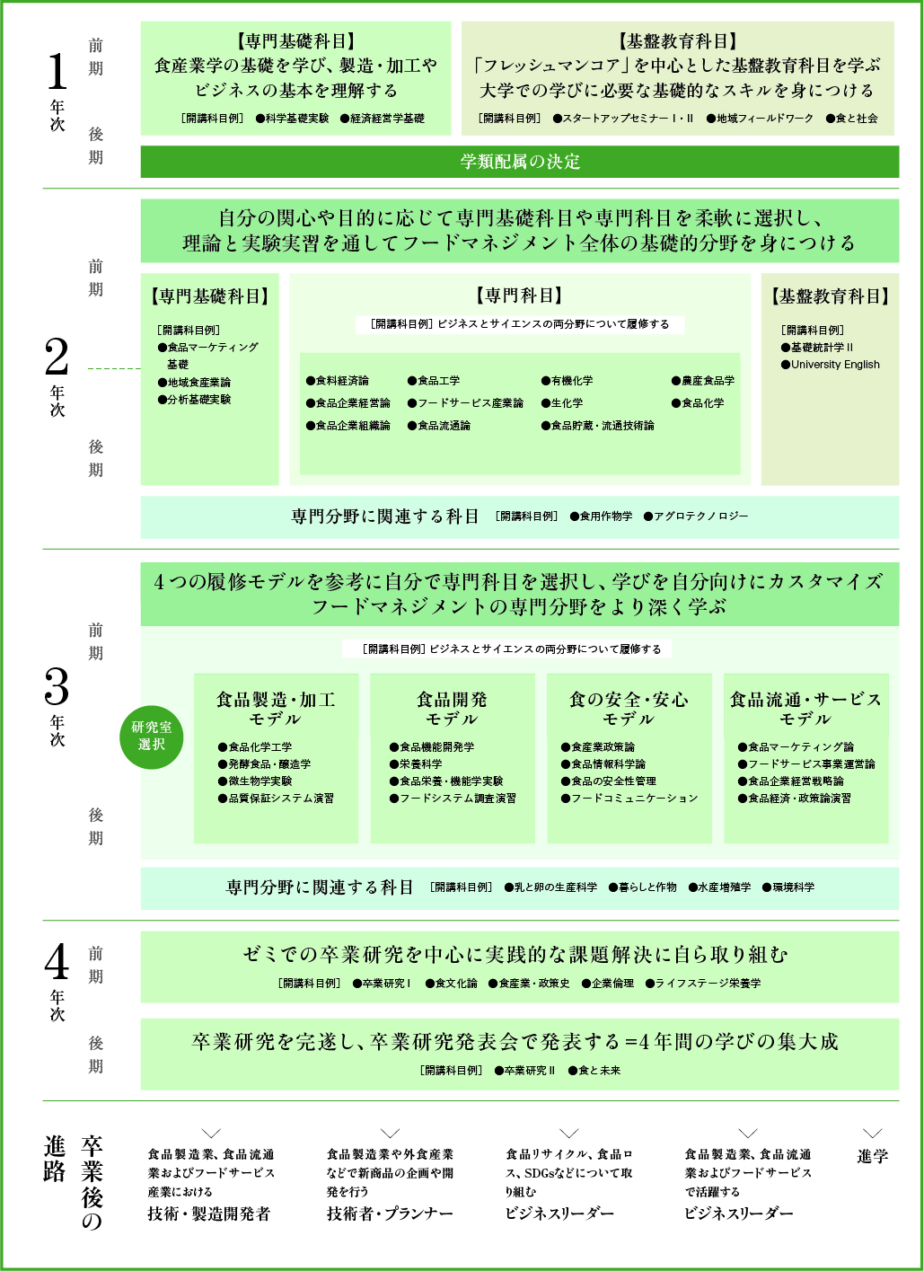 「食との関係」と聞いて何を思い浮かべますか?我々が口にする食材は世界中で生まれ、運ばれ、調理され、生きる糧となります。一口に食と言ってもとても広い分野が関わります。フードマネジメント学類では「文理融合」を掲げ、食に関わる科学技術から社会現象に至るまで広く学ぶことができます。1年次では基礎を、学年が上がるに伴い「食品製造・加工」「食品開発」「食の安全・安心」「食品流通・サービス」の4つの履修モデルに基づき専門性の高い科目を学びますが、モデルを超えた履修も可能です。4年次には集大成としての卒業研究に取り組み、学類全員参加の発表会では活発な質疑応答が行われます。また授業や課外活動の一環として県内外の企業と清酒やお土産品などの商品開発も行っており、実践的な学びを得ることもできます。