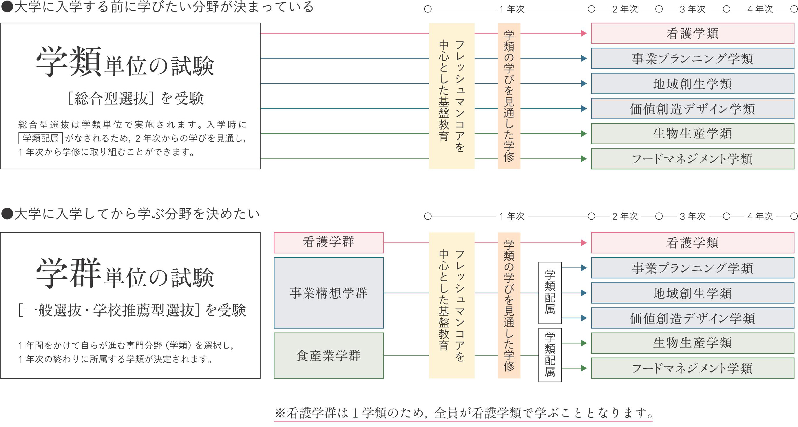 また、入学者の募集単位も「学群単位」「学類単位」の2つを設定しています。一般選抜と学校推薦型選抜は、「学群単位」の募集となりますので、事業構想学群と食産業学群の学生は、入学後1年間をかけてじっくりと自らが進む専門分野(学類)を選択し、1年次の終わりに所属する学類が決定されます。(看護学群は1学類のため、全員が看護学類で学ぶこととなります。)