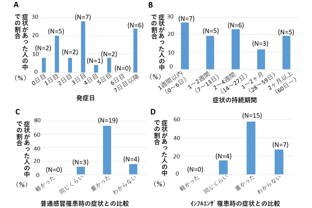 さらに、これらの長引く症状は、喉の痛みや発熱などの初発症状より少し遅れて出現することが多く(図3、4)、自覚症状の程度は、普通感冒やインフルエンザに罹患時よりも重い傾向にありました。