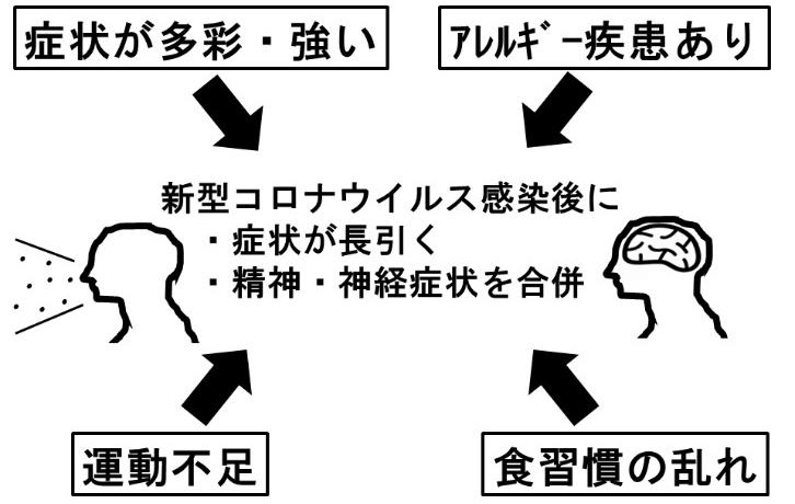 新型コロナウイルス感染後、急性期を過ぎても症状が長引く場合、または精神・神経症状を合併した場合には、日常生活への支障が大きくなります。しかしこれらの症状に対しては、未だに対症療法が主に行われており、時間の経過とともに自然治癒するのを辛抱強く待つしかありません。本研究の結果から、運動習慣や健康的な食習慣への改善によっても、長いびく症状や精神・神経症状を予防できる可能性が高いことが明らかになりました(図6)。また、感染後に強く多彩な症状を呈したり、もともとアレルギー疾患があったりする場合には、症状の長期化や精神・神経症状の合併を予測することもできます(図6)。新しい治療薬を開発する以外にも、病態生理にもとづき、日常生活の中で実践可能な予防手段を考えていくことも、医療従事者にとって大切な務めであるといえます。