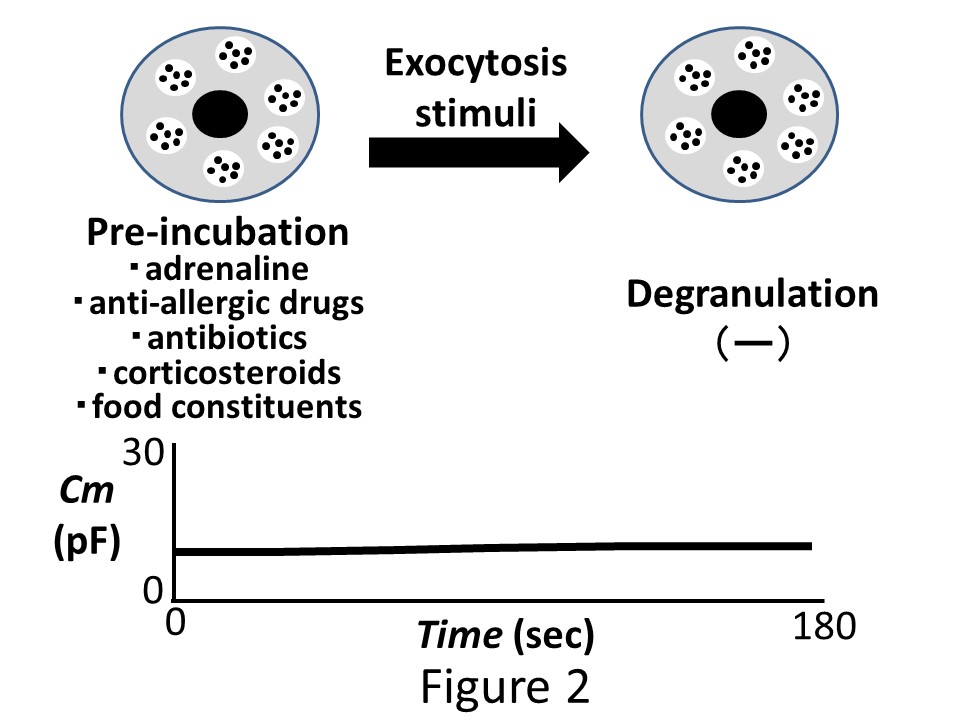 風間教授は、肥満細胞の脱顆粒現象(エキソサイトーシス)を電気生理学的な膜容量の増加として捉え、それを抑える薬の作用を明らかにする独自の手法を開発してきました。これにより、日常診療の中で多くの患者さんたちに使われている抗アレルギー薬(オロパタジンなど)や抗生物質(クラリスロマイシンなど)、ステロイド薬(デキサメタゾンなど)の中に、肥満細胞の活性化を強力に予防する薬があることを発見してきました【図3】。これらの薬は、安全性が十分に確かめられているので、副作用を心配することなく、今後、実臨床への応用が期待できる可能性があります。