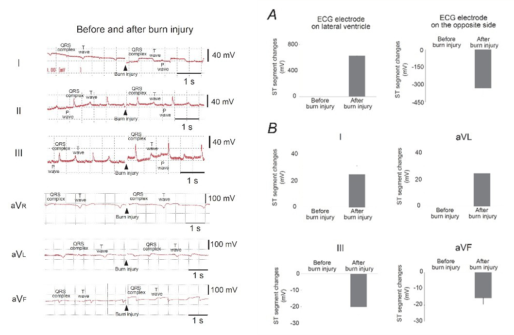 今回の研究では、ウシガエルの心臓を用いて、急性側壁心筋梗塞で起きるのと似た心電図異常を再現し、メカニズムの解析まで行ったものです。実験の結果、心臓の側壁部分を焼灼することにより、肢誘導(手足につけた電極による誘導)のI, aVLではST部分が上昇したのに対し、対側の肢誘導III, aVFでは逆にST部分が下降し、実際の急性側壁心筋梗塞に特徴的な心電図変化に加え、鏡像変化まで再現できることを明らかにしました。(図2)。本研究ではさらに、これらの心電図変化についての定量的な解析も行い、有意差まで明らかにしました(図2)。