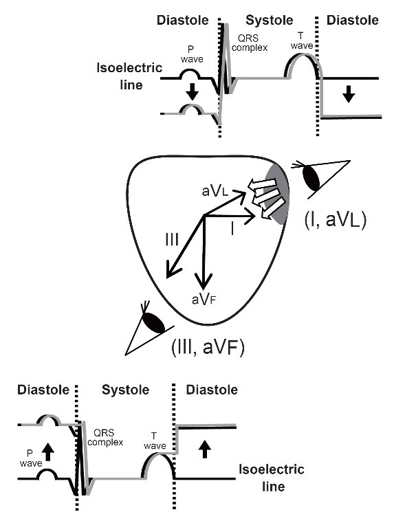 急性側壁心筋梗塞モデルでは、主に拡張期に生じる傷害電流が、肢誘導のI、aVLから見れば、遠ざかる方向へ向かうために心電図の基線が下がり、相対的にST部分が上昇すると考えられました(図3)。