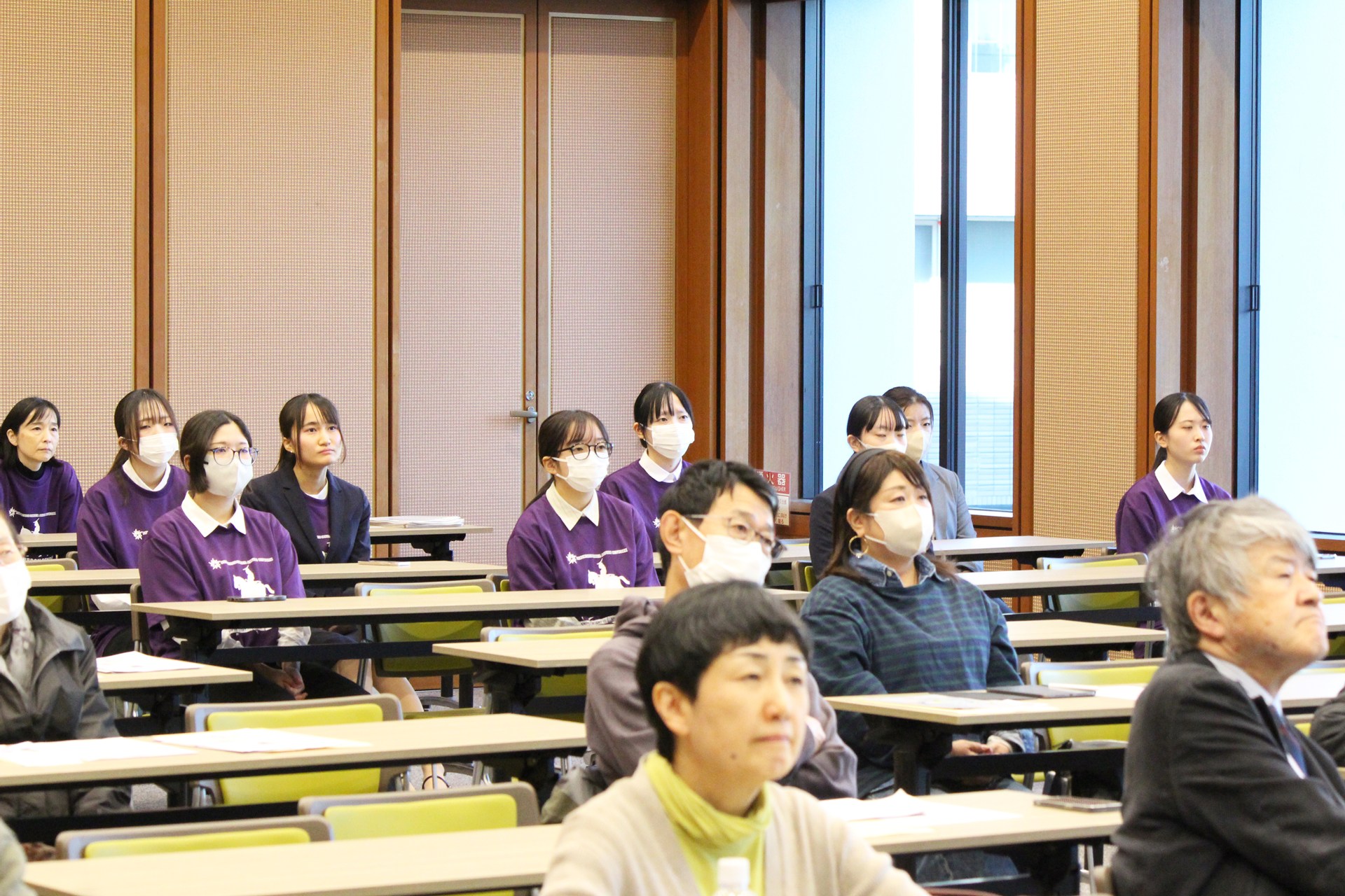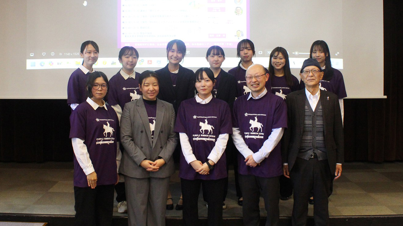 2025年11月29日(土)、パンキャンジャパン宮城支部とNPO法人NEXTSURG(ネクストサージ:東北外科臨床研究推進機構)の共催により「膵がん市民セミナー -患者・家族に希望の光を-」が開催され、本学看護学群の学生10名が運営ボランティアとして参加しました。本セミナーは市民を対象として企画されており、東北大学医学系研究科の専門医による早期発見に向けた最新の取り組み、外科治療に関する知見、膵がんサバイバーによる体験談など、膵がんを多面的に学べる内容で構成されています。企画内では、本学学生3名が霜山准教授とともに登壇し、宮城大学看護学群でこれまで実施してきた膵がん関連ボランティア活動の紹介を行いました。