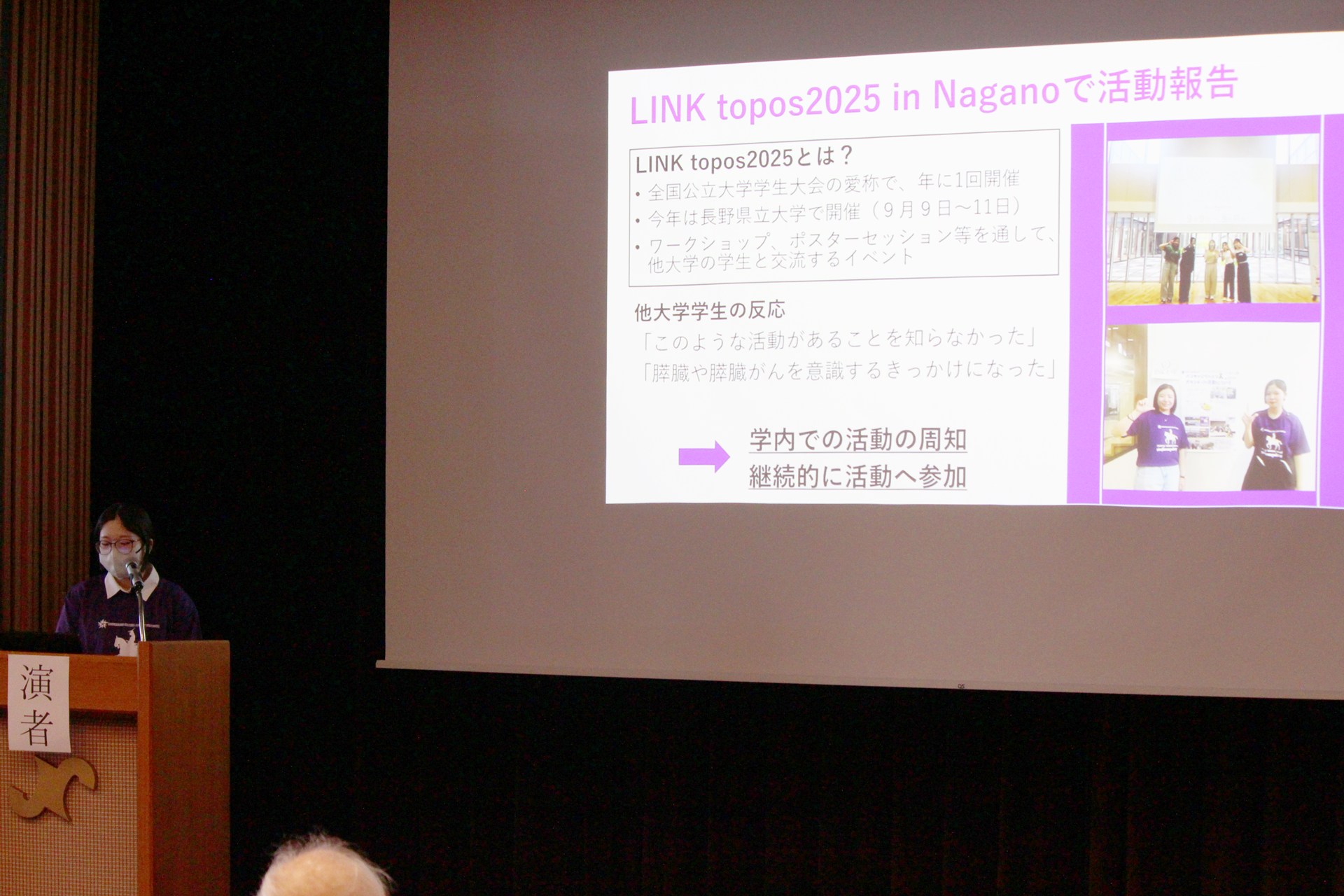 続いて、看護学群学生と霜山准教授が、本学における膵がんボランティア活動の紹介を行いました。宮城大学看護学群では 2020 年より、霜山准教授を中心にパンキャンジャパン宮城支部の活動支援に取り組んでいます。今回は、これまでの活動の経緯に加え、2025年4月に開催された「パープルリボンウォーク仙台2025」で得られた学び、さらに LINK topos(全国公立大学学生大会)2025 in Nagano での活動を、学生(看護学群2年 佐山さん・飯塚さん・松田さん)が報告しました。