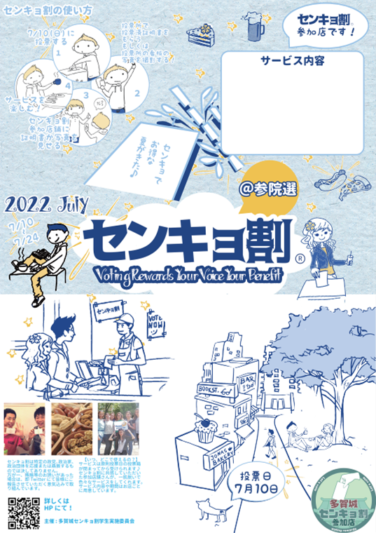 選挙に行き投票したことを証明する「投票証明書」を提示することで、参加する店舗や企業で割引やサービスが受けられるキャンペーンです。センキョ割は、国内にとどまらず海外にも広がりを見せている活動です。宮城大学地域資源マネジメント研究室では、宮城県内においてセンキョ割で若者の投票率の向上と地域経済の活性化の流れを生み出そうと考え「センキョ割 in 宮城県多賀城市」を企画しました。ただし、宮城県全体となると広範であるため、今回は、政庁を有する政治のまちであり、かつ中心になって企画した研究室の学生の出身地である多賀城市をフィールドとし、2022 年 7 月 10 日(日)の参議院選挙に向けて活動の準備を進めています。