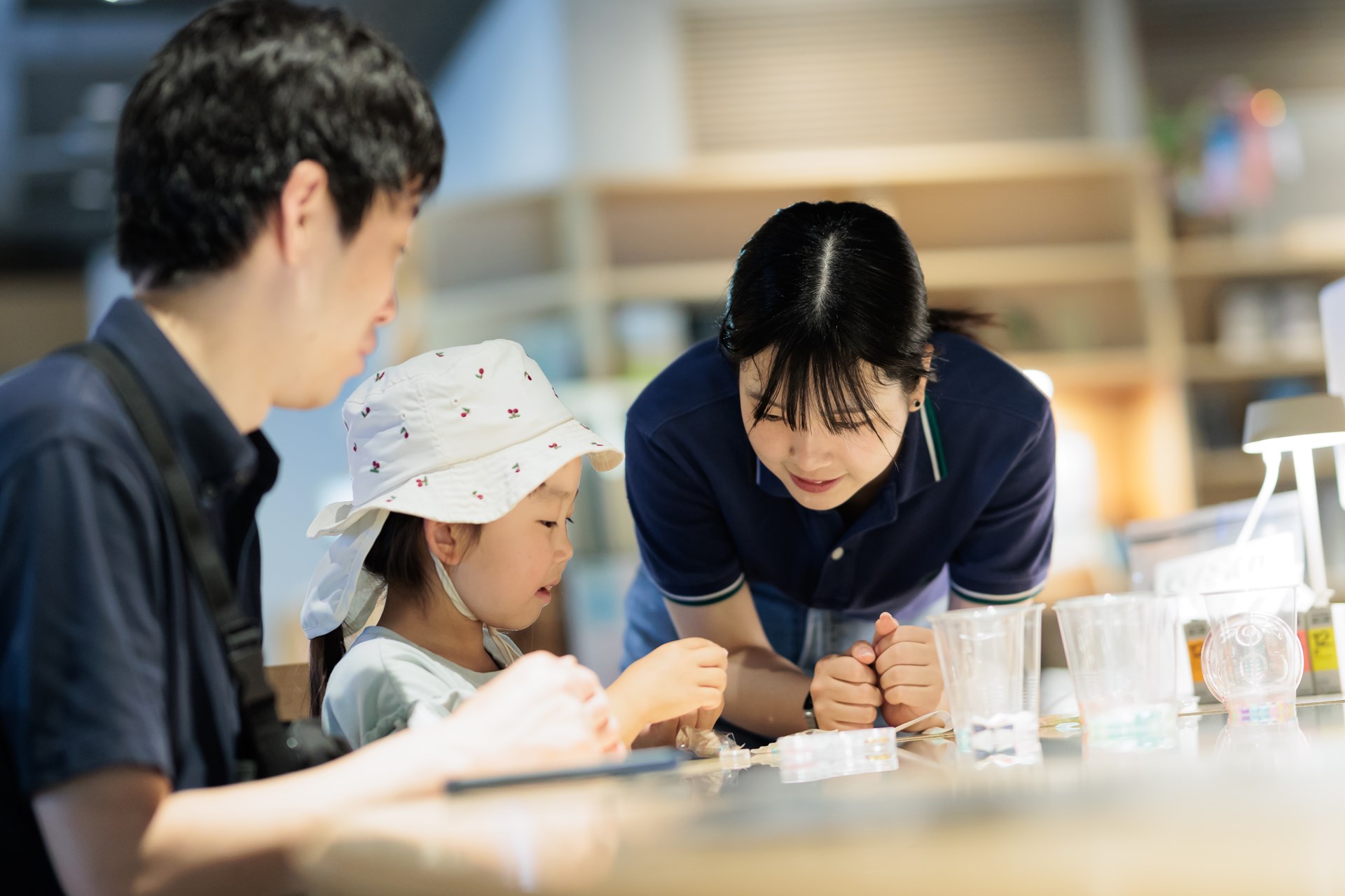 今回展示を行ったのは、8BOOKsでの企画に引き続き、ぬいぐるみを使ったリズムゲームと、専用のシミュレーター人形で大人と子どもが心肺蘇生の一連の行動を体験しながら学ぶ作品です。制作者の中嶋瑞季さん(価値創造デザイン学類4年生)、出展サポートに髙橋栞奈さん(看護学類4年生)により、作品体験と心肺蘇生に関するクイズも合わせてお楽しみいただきました。イベント内では、8BOOKs学生メンバーによる工作WS、「災強のすけっと」メンバーによる防災バッグワークショップも実施。若い世代からご家族連れも楽しめる展示となりました。