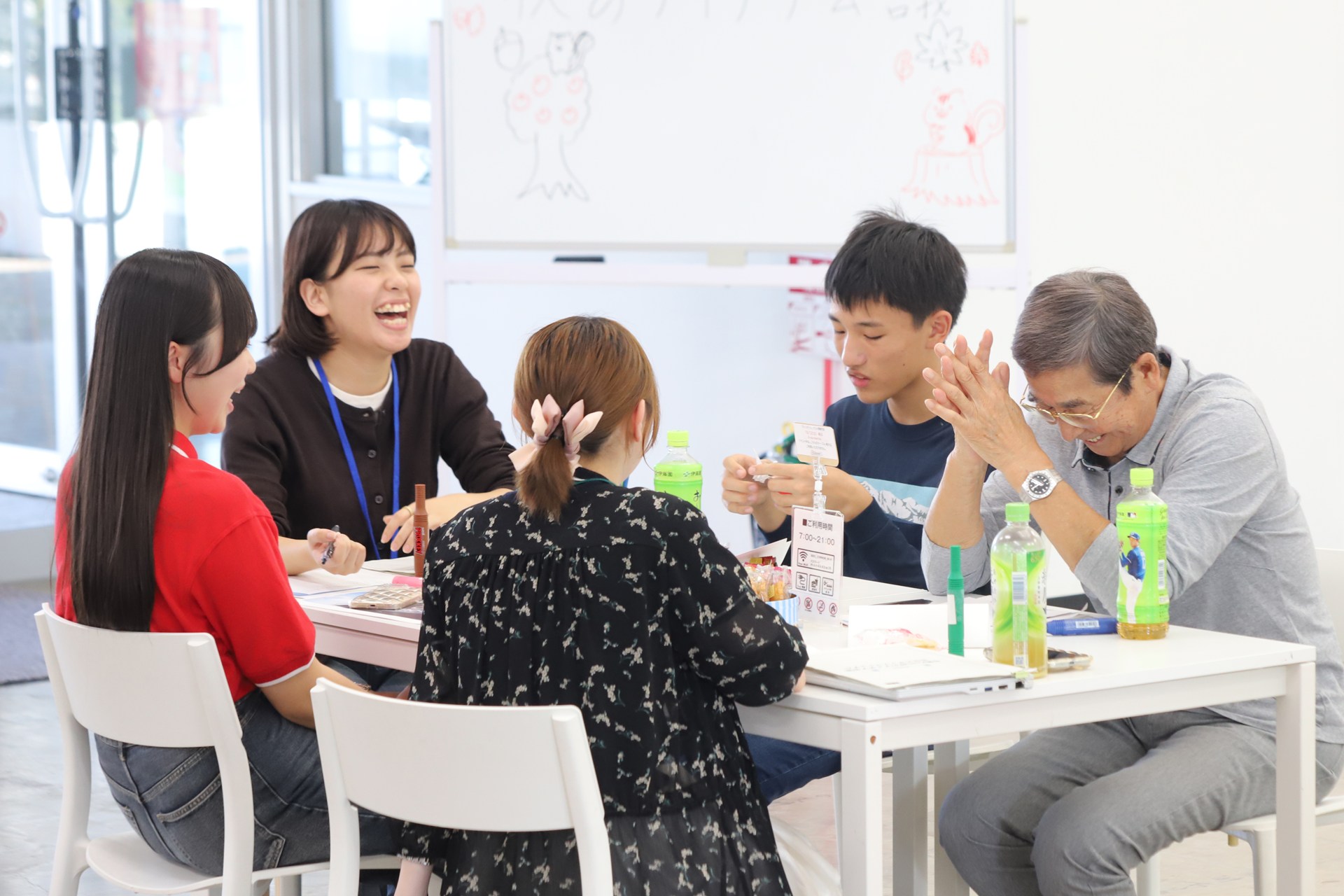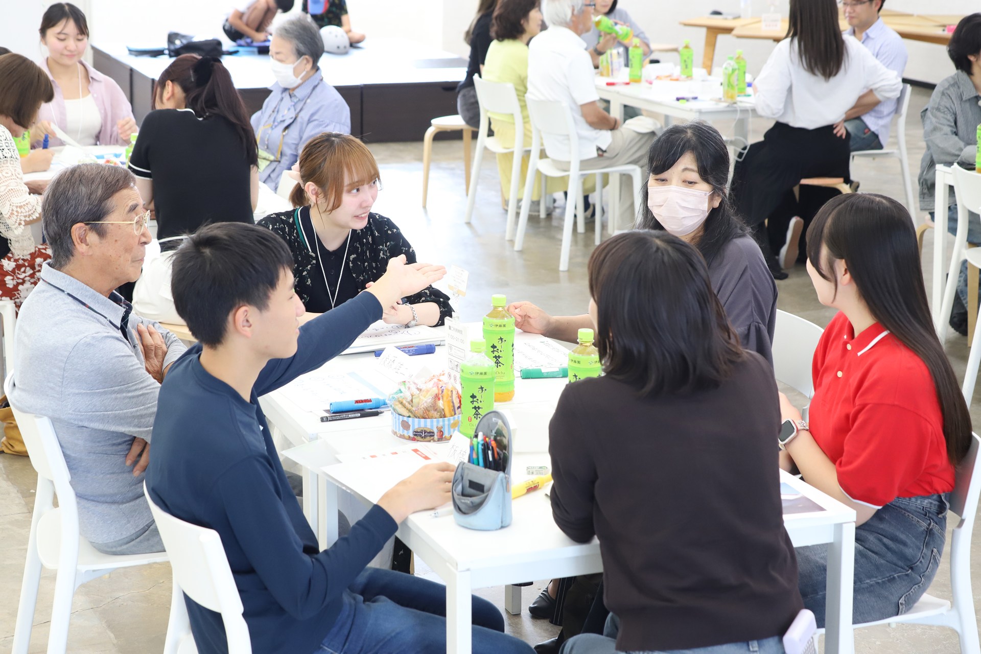 今回の意見交換会には、地域の中高生6名、親世代・高齢者世代の地域住民12名、寺岡Knotsの活動に携わる本学学生14名が参加しました。この意見交換会は、寺岡・紫山地区における参加型のまちづくりを目指し、交流イベントの企画そのものを体験することで、住民どうしの主体的な交流を促進することを目的としています。意見交換会では、本学学生・中学生・高校生・地域住民のグループを作り、本学学生がファシリテーターとなり、自己紹介・アイスブレイクを交えながらディスカッションを進めました。