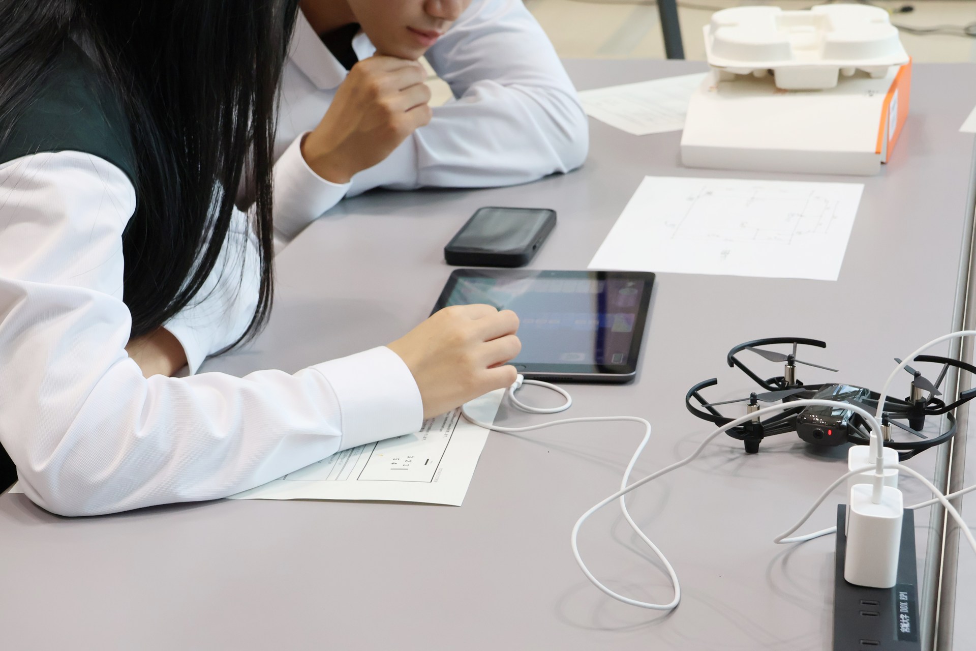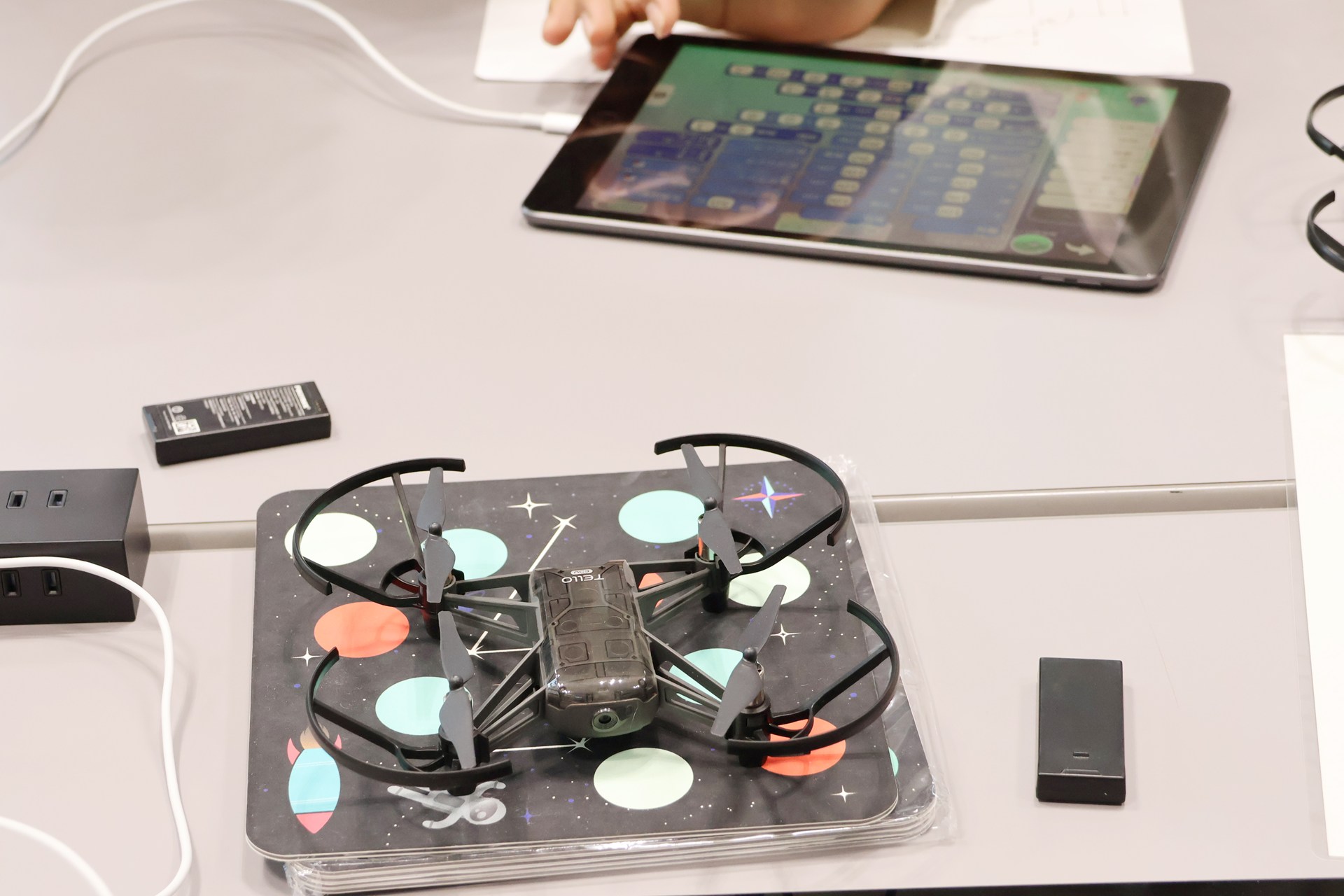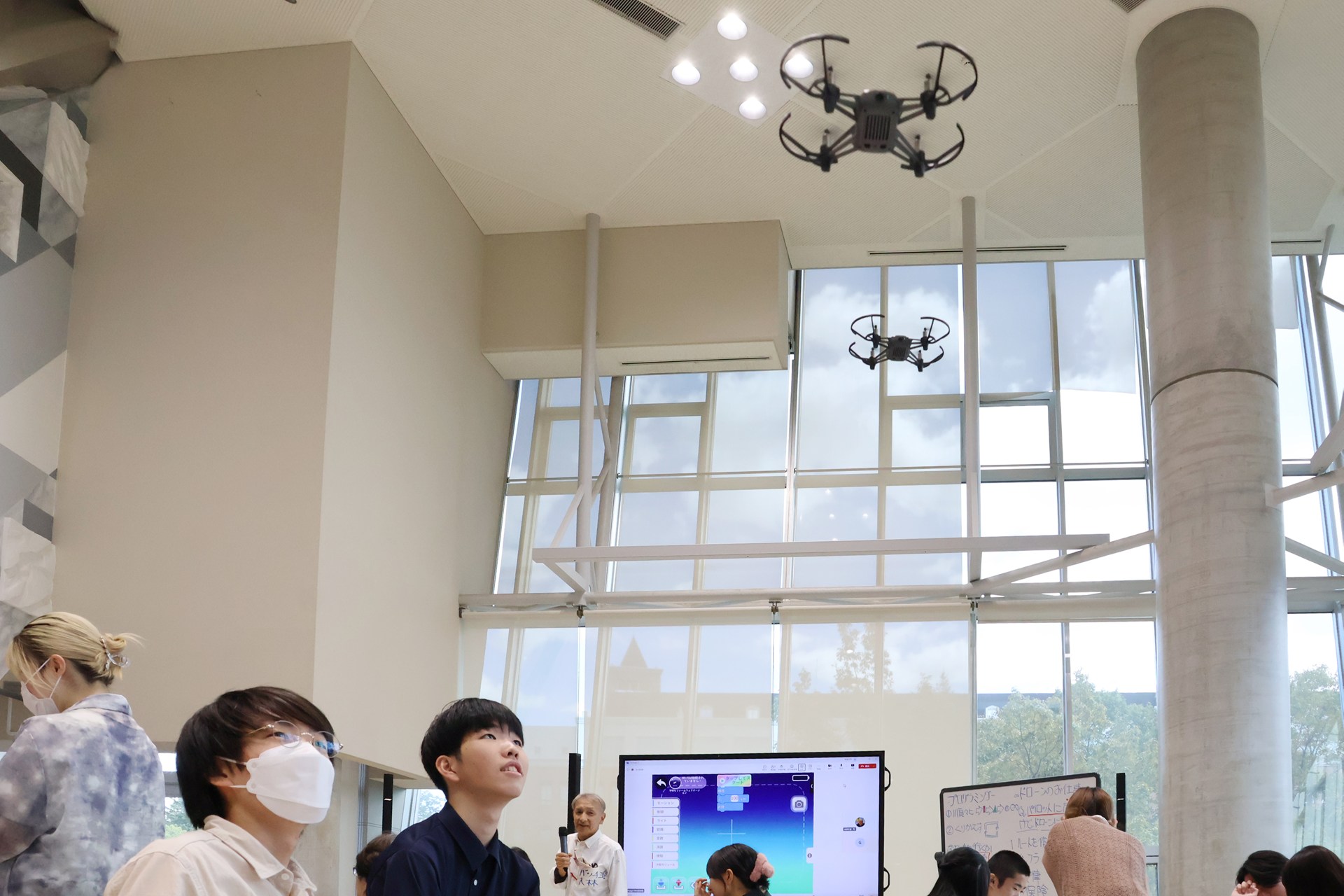 ⼤和キャンパス 交流棟2階の「PLUS ULTRA−」に集まった参加者はまず、ドローン・MESH・Webアプリと最新技術の体験を行いました。これまでのワークショップでも実施してきたノーコードのプログラミングツール「MESH」のコーナーでは、インターネットを介して家電等の遠隔操作を可能にする「SwitchBot」というデバイスが新たに加わり、MESHと組み合わせて日常にどのように活用できるか考えました。