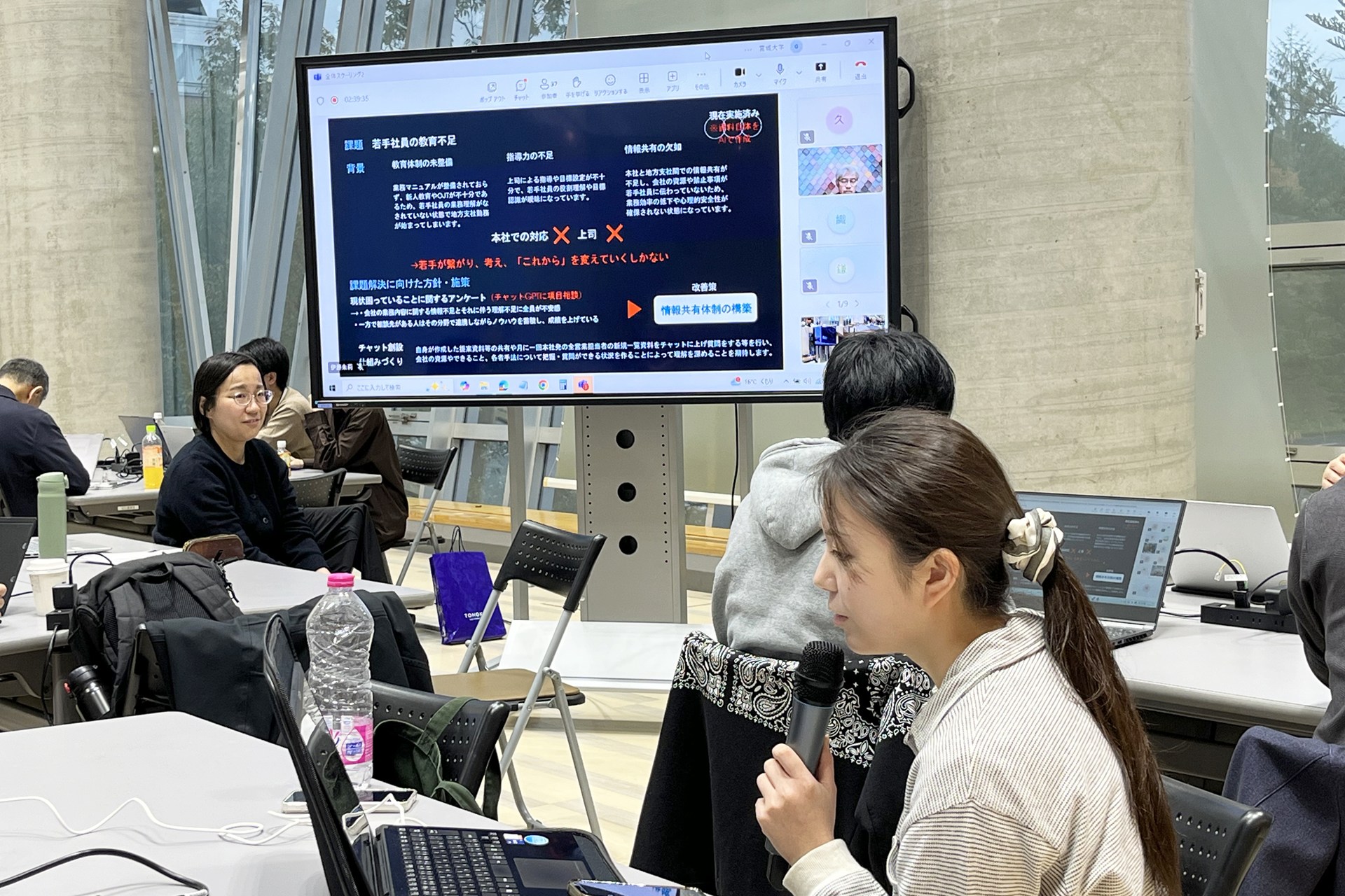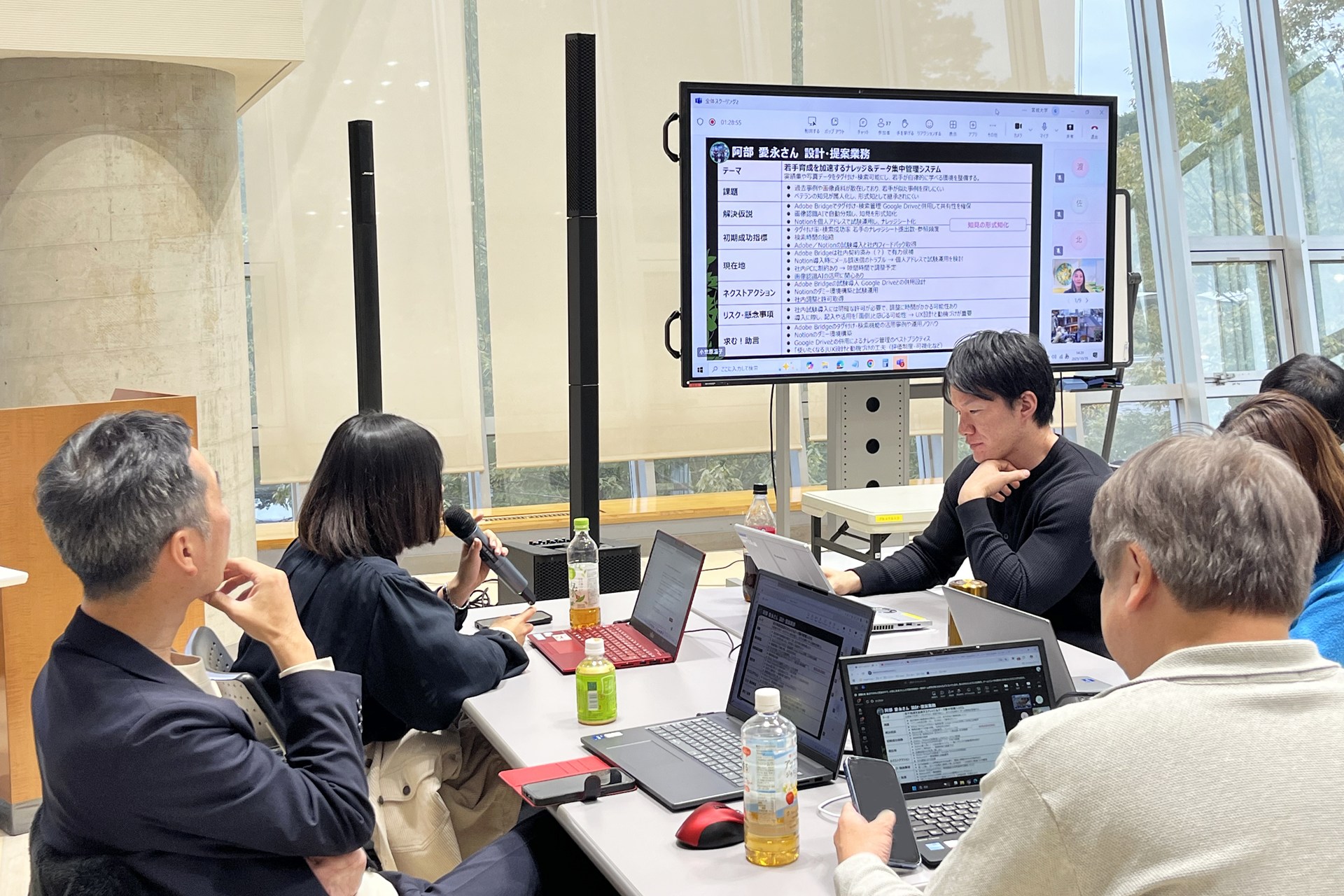 本プログラムでは、受講生が7つのチームに分かれ、各チーム4人前後のメンバーにメンターが1名ずつ配置される体制でPoCの検討を進めています。この日は、各チームから現在の進捗状況を発表し、プログラム開始から8週間が経過した時点での取り組み内容や課題、今後の方向性について共有しました。受講生の業種は、製造業、医療機関、飲食業、林業、情報通信業、大学事務職員など多岐にわたっており、それぞれの業界が抱える特有の課題に対して現場起点の観点からアプローチしています。取り組んでいるテーマも、業務効率化、データの一元管理と可視化、人材育成・教育支援、顧客サービスの向上、安全管理システム、AIやBIツールを活用した意思決定の高度化など、幅広い分野にわたっていることが報告されました。受講生同士が互いの取り組みから新たな気づきを得る機会となりました。