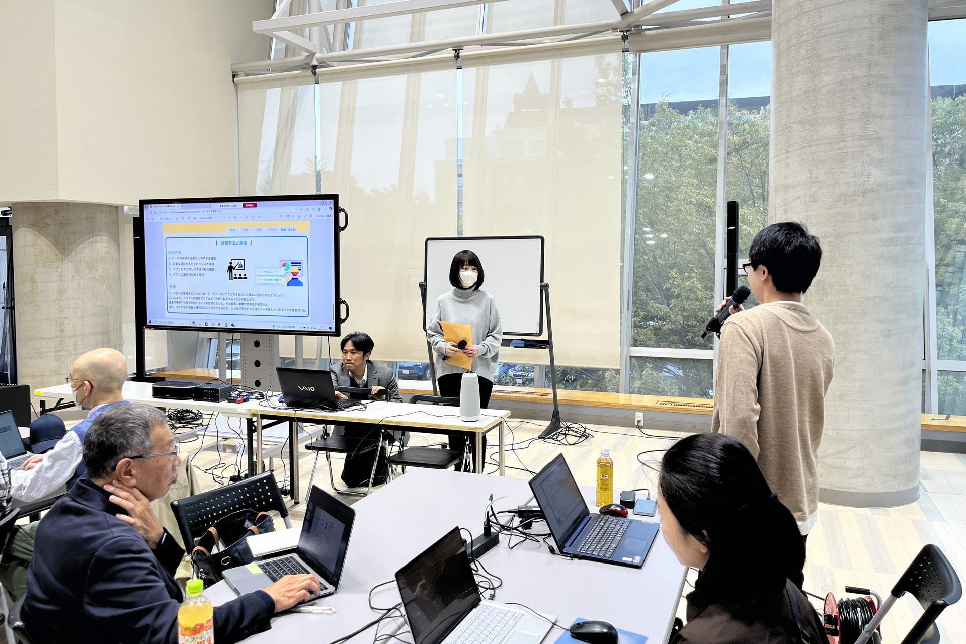 渋田一夫教授から、PoCの本質についての重要な解説がありました。「PoCというのはProof of Conceptの略で、Cはコンセプト、つまり概念を検証するという作業なのです。課題があって、その解決策はこれじゃないかな、あれじゃないかなといろいろ挙げてみる。それを実際に何らかの方法で検証してみる。検証が済んだら、次は別の案を検証してみるという繰り返しです。進めていくうちに実装に重きを置いてしまうことがよくありますが、むしろ検証をするためなら、ペーパープロトタイプ、つまり紙芝居でもよいのです。大事なことは、解決策が正しいかを確認すること、すなわち検証をすることです。」12月の最終発表会に向けてPoCを進める受講生に対し、渋田教授は「実装ではなく検証こそが本質である」というメッセージを強く伝えました。