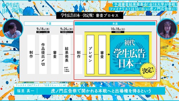 「学生広告日本一決定戦」は、全国の大学生・専門学生が参加し、実在企業の課題に対して広告企画・アイデアを競う日本最大級の学生広告コンペティションです。予選では与件に基づく企画書の提出を行い、審査通過チームが決勝ステージでのプレゼンテーションに進みます。決勝では、審査員の投票によって優勝チームが決定します。第1回となる今回は多数の応募が集まり、学生たちの企画力・表現力が問われるハイレベルな大会となりました。