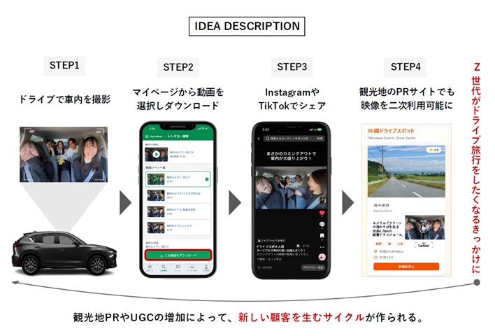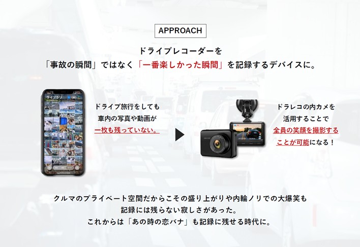 そこで、ドライブレコーダーに着目。ドライブレコーダーを「事故記録」ではなく“車内の一番楽しかった瞬間を記録するデバイス”に変えるというアイデアを提案しました。社内カメラを活用することで、車内の盛り上がりや笑いなど“普段残らない思い出”を可視化し、保存可能に。さらに記録された動画を振り返る体験によって、クルマの魅力を“特別な体験ができる場所”へと拡張します。その結果、「クルマがある生活っていいかも」というZ世代の気持ちを自然に喚起する新しい体験価値の創出を提案しました。