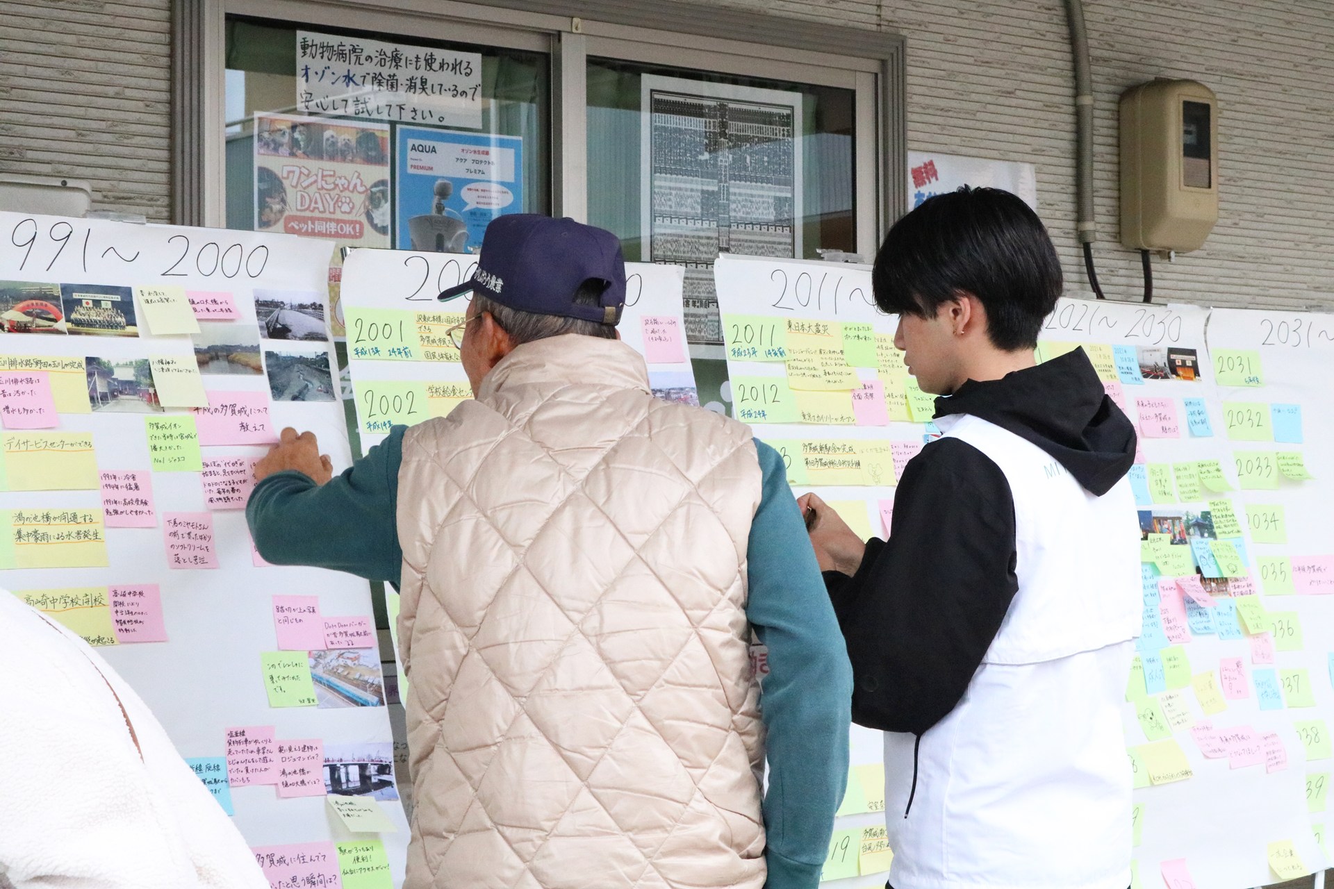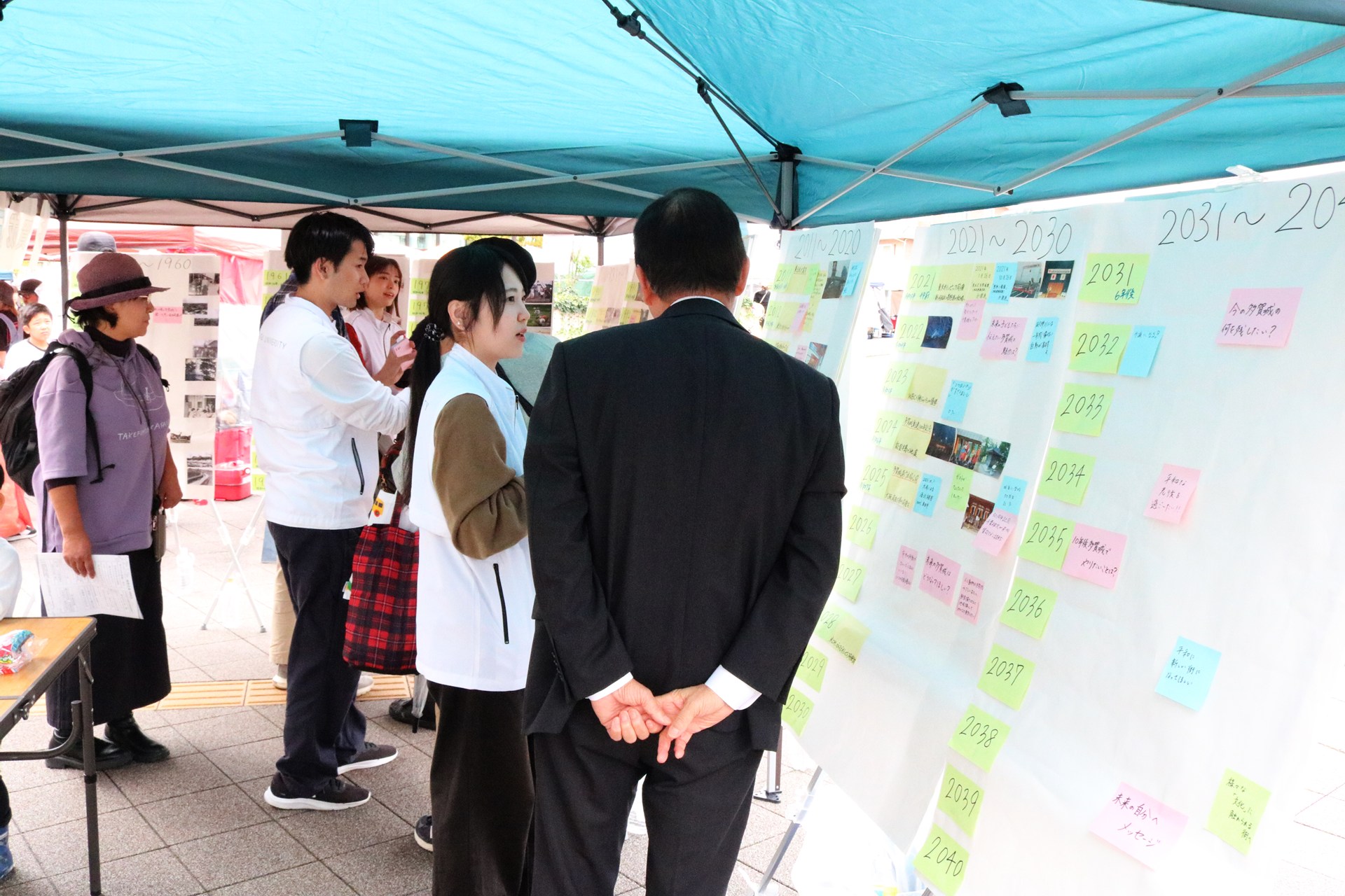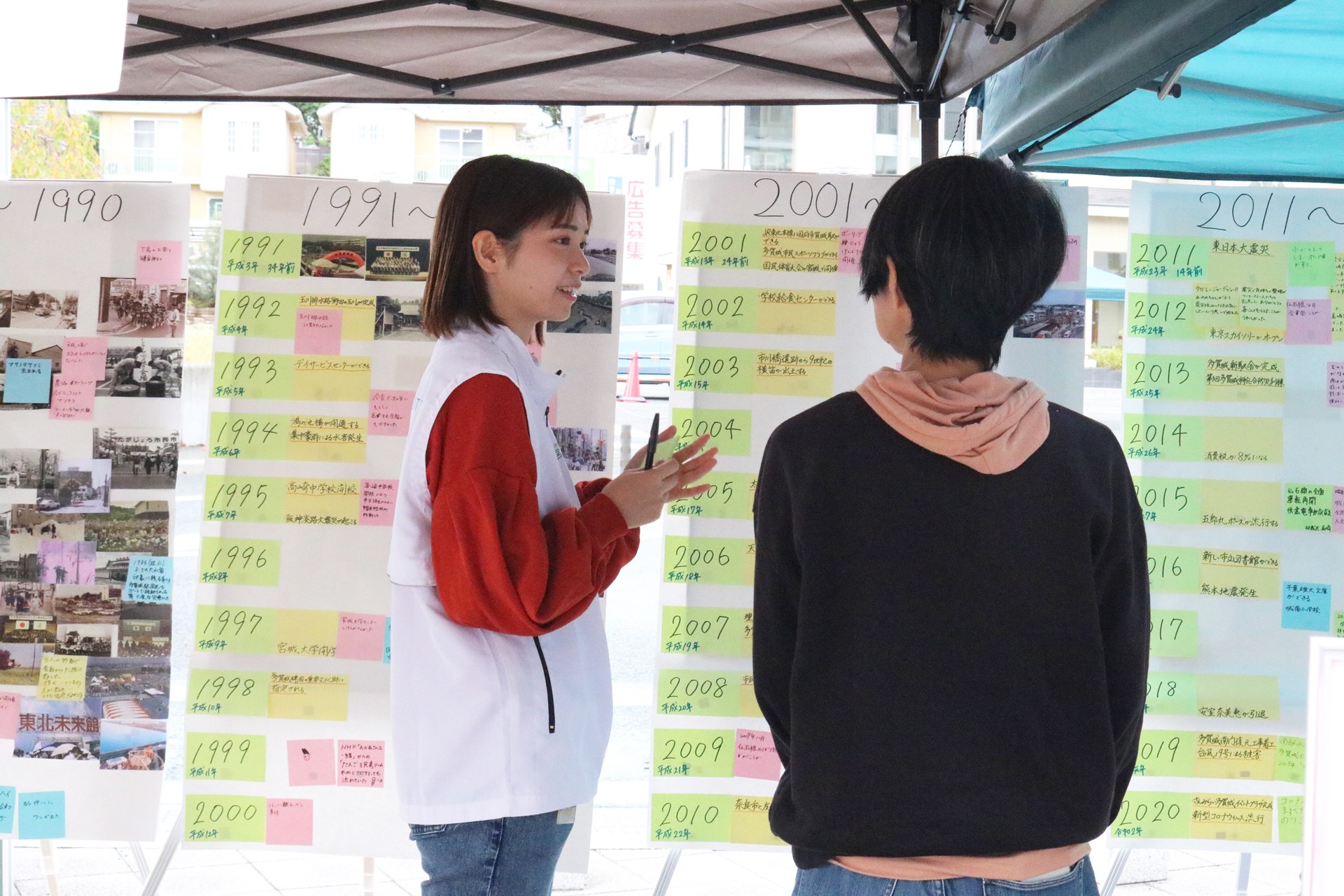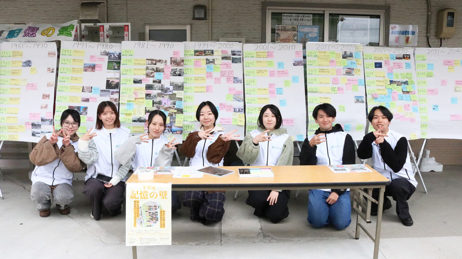 まちと人の移り変わりを暮らしの記憶として可視化し、世代を越えた住民同士の交流促進・愛着形成につなげようと、参加型アートプロジェクト「多賀城記憶の壁」を企画・実施しました。1950年代以降の市内の写真と出来事を整理した年表に、思い出やコメントを自由に書いて付箋で貼り、参加者と一緒に制作していきます。たがマルシェ(10/12)や高橋商店会はしご市(11/9)への出展、多賀城市市民活動サポートセンターでの展示(10/3~11、10/13~19)を行い、地域に暮らす方々の声からまちの歴史を形にしていきました。