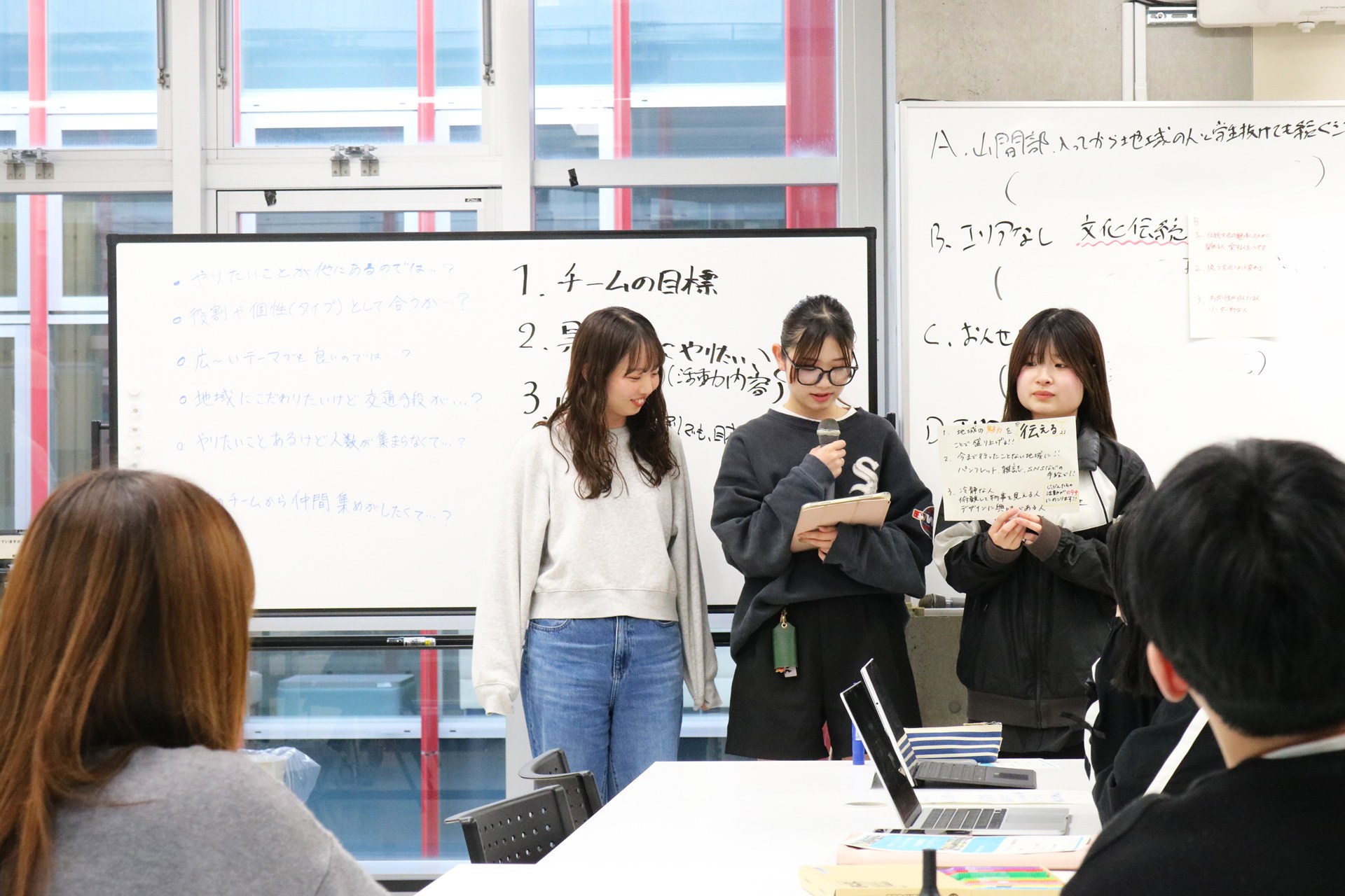 地域での実践を踏まえて、一つの区切りとして学内最終報告を行います。8ヶ月間(4月~11月)地域と向き合って取り組んだプロセスを振り返り、チームでの活動を通して得た学びについて理解を深化させていきました。報告会には、御協力いただいた各地域のカウンターパートの皆様にお越しいただき、学生の取り組みにフィードバックをいただきました。学生たちにとって、地域でのプロジェクトの実践に至る一連のプロセスを経験し、地域の様々なステークホルダーとの関係の構築やプロジェクトの進め方について、多くの学びや気づきを得る機会となりました。
