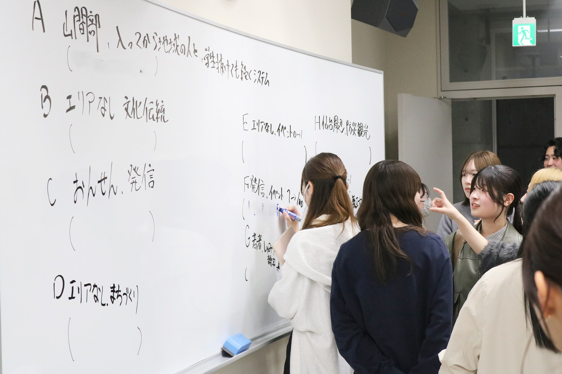 本科目(3年次前期・後期)では、プログラムを通じた学修の集大成として、学生自身の主体的なフィールドワークを中心に、フィールドのカウンターパートと連携しながらプロジェクトを立案する経験を通じて、地域と共創するプロセスについて学びを深めます。講義はPBL(Project Based Learning)形式で実施し、今年度は事業構想学群の学生29名が履修し、5つのチームに分かれてプロジェクトの企画立案・実施に取り組みました。