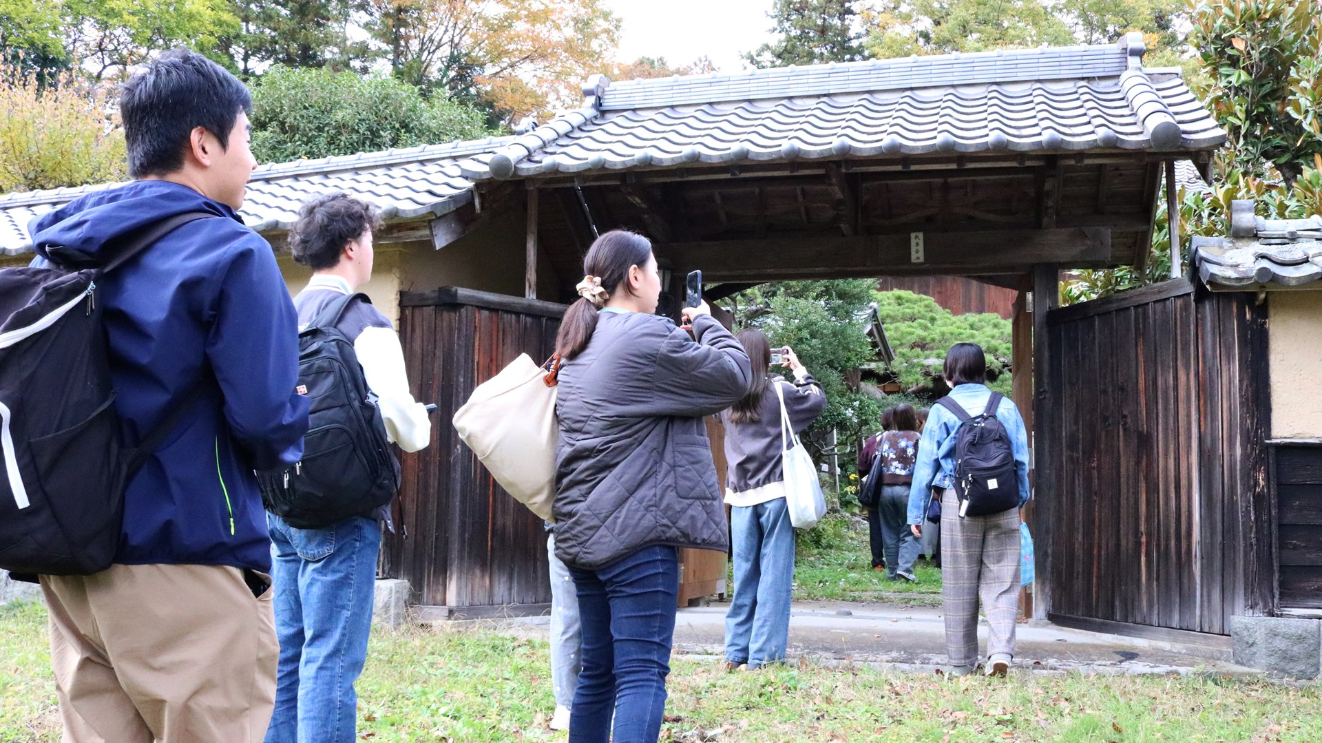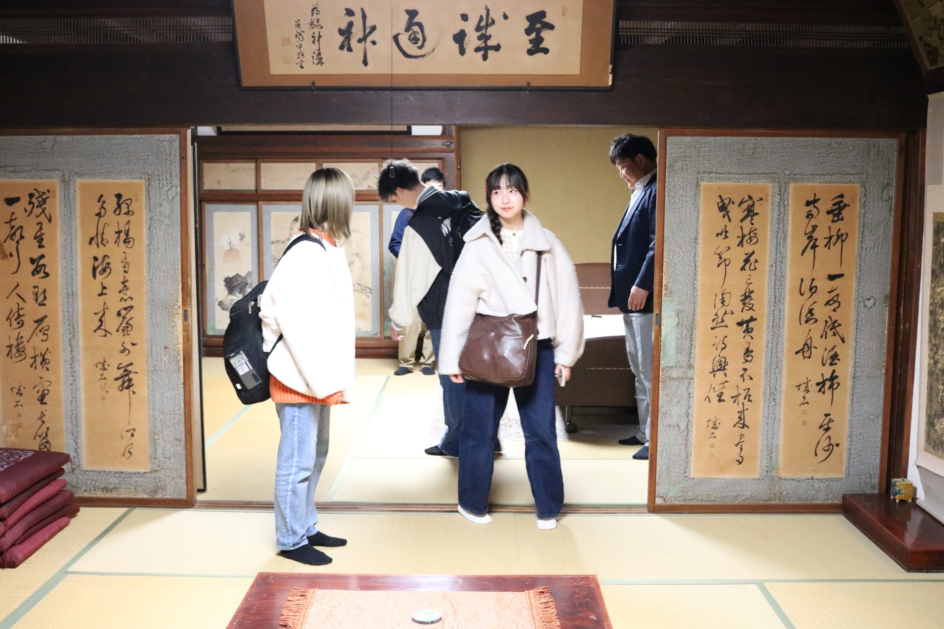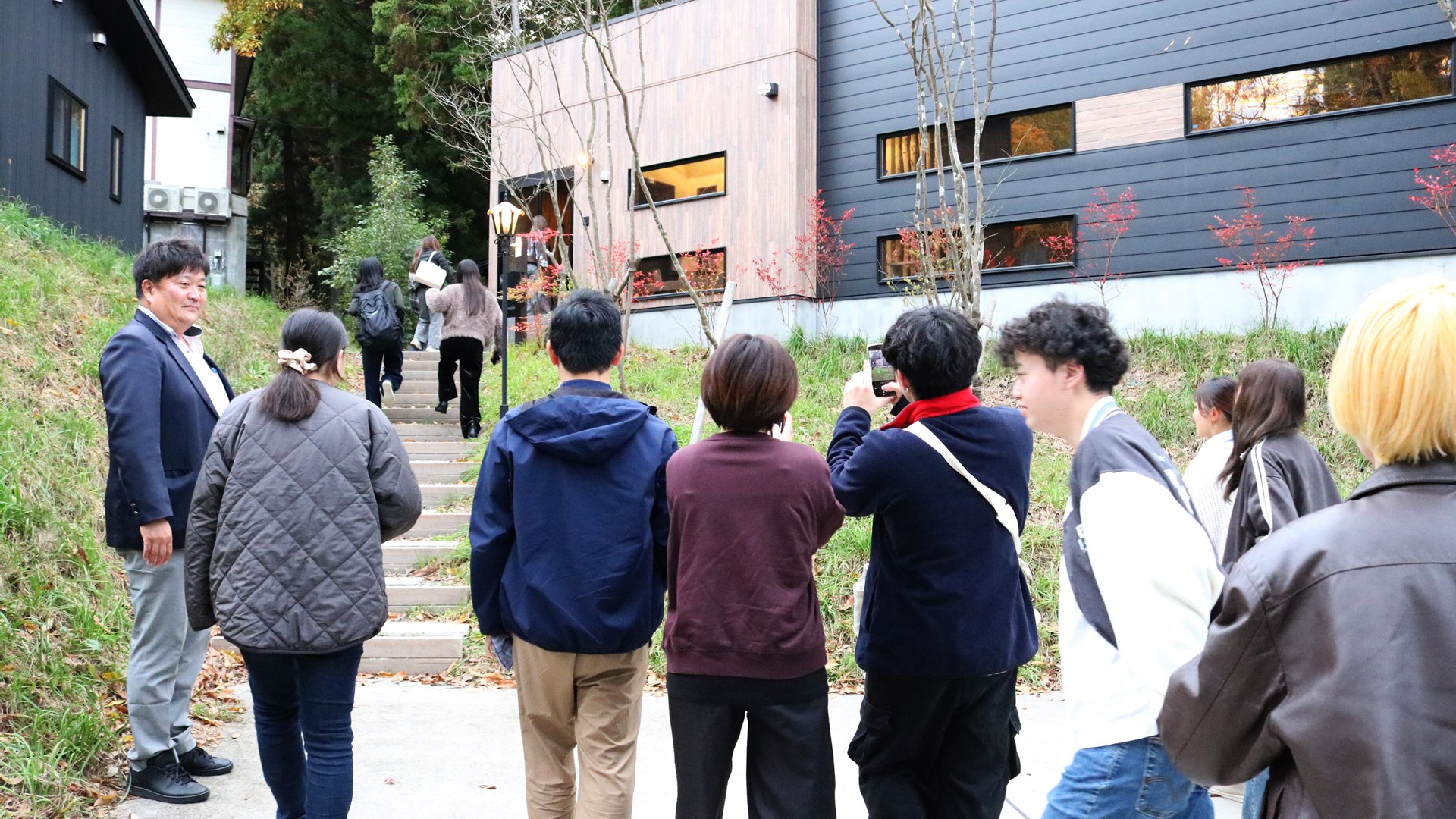 学生たちは、株式会社ガイアの専務取締役を務める宇田川氏と永倉氏の案内のもと、我妻住宅の敷地に入り、瓦葺きの母屋の中や庭園を歩き、現在の様子を見学しました。母屋には書架が並び、格式ある和室や襖の書画、2階には庭園を見渡せる回廊があります。広大な敷地を管理するうえでの課題について説明いただきました。我妻住宅を見学したあとは、別荘を一棟貸しの宿泊施設として活用しているガイアリゾート蔵王山水苑へ向かいました。天然温泉付一棟貸し別荘「蔵王 玄-Gen-」を見学し、山水苑の敷地内をバスで回りました。ガイアリゾート蔵王山水苑は、東北初となる「アルベルゴディフーゾ(Albergo Diffuso)国際認証」、世界初となる「オスピタリタ・ディフーザ(Ospitalità Diffusa)」の認証を取得しており、地域全体をホテルに見立て、観光・福祉・農業等の分野を横断する地域づくりを展開しています。現地フィールドワークを通して、我妻住宅の現在の様子や、株式会社ガイアの事業と地域づくりに対する想いに触れました。