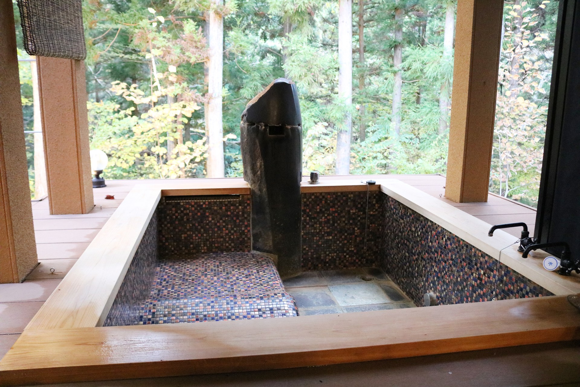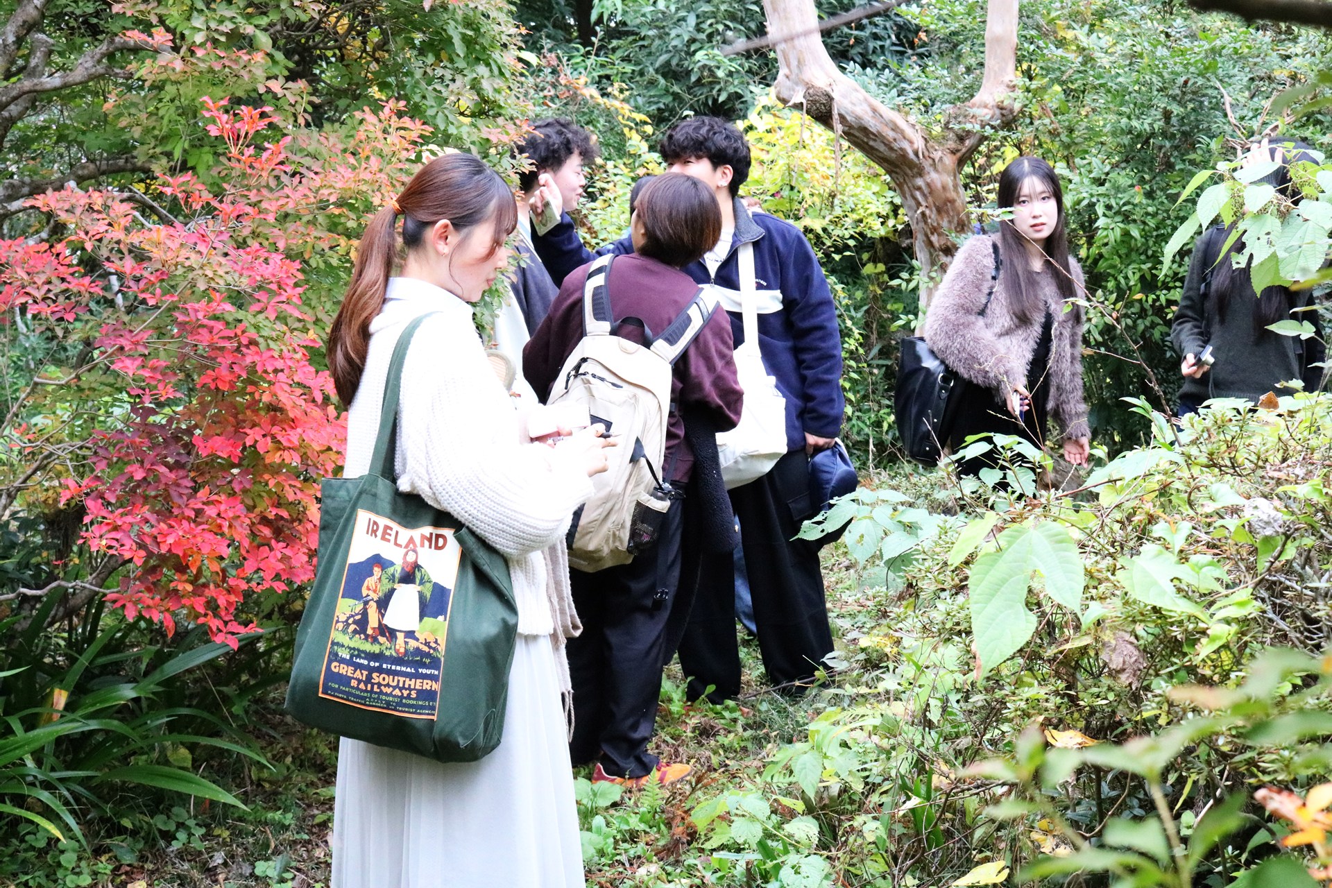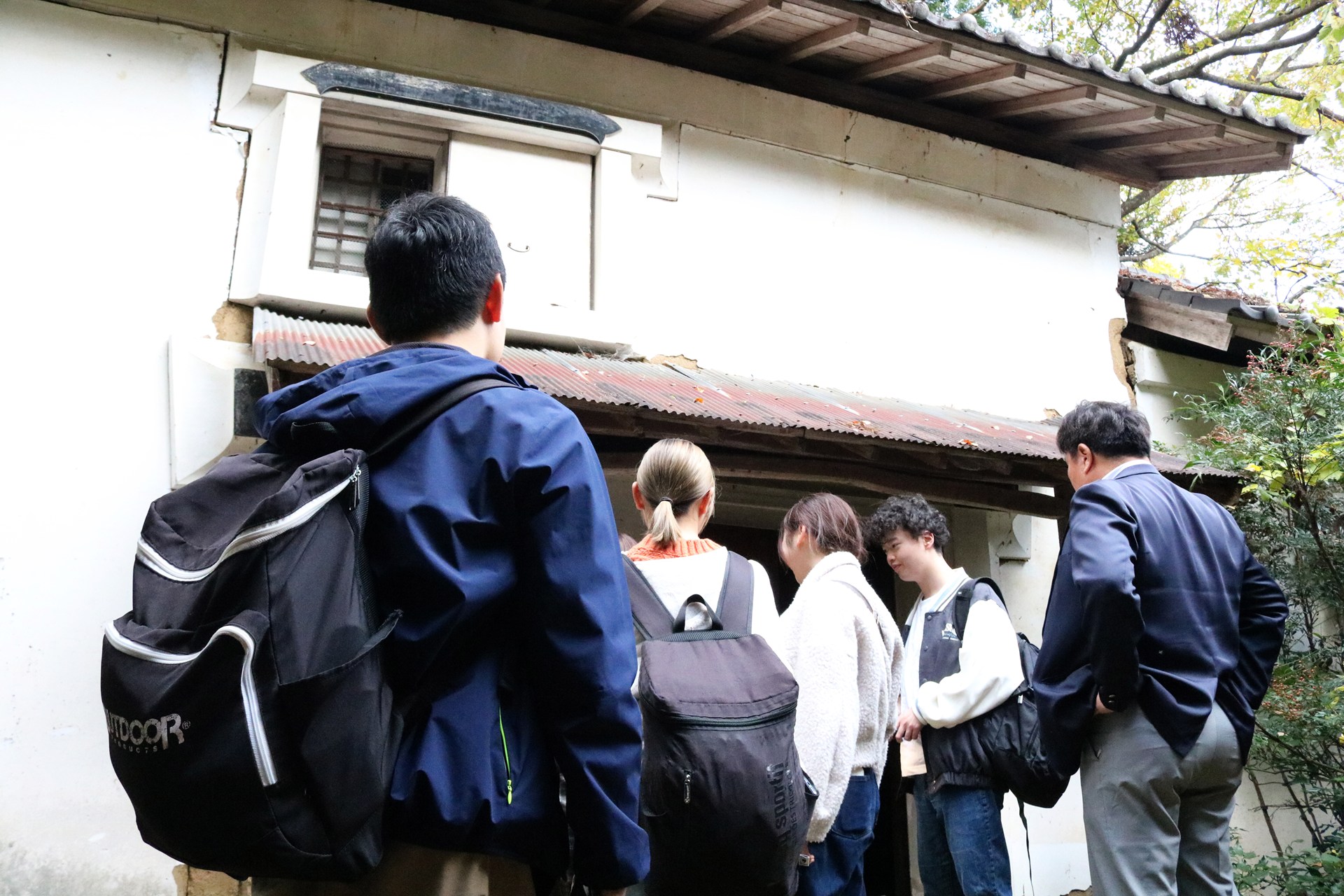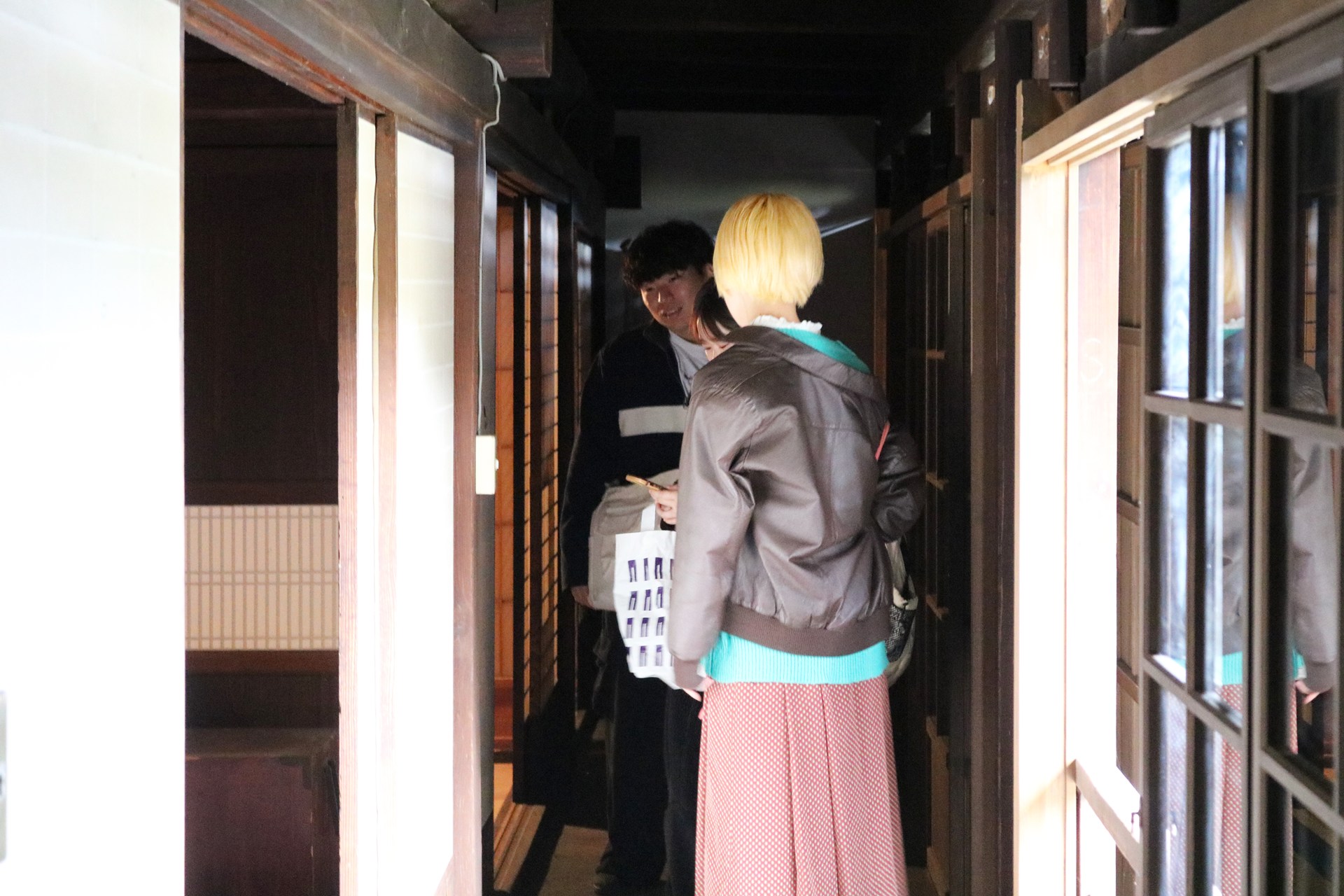 学生たちは、株式会社ガイアの専務取締役を務める宇田川氏と永倉氏の案内のもと、我妻住宅の敷地に入り、瓦葺きの母屋の中や庭園を歩き、現在の様子を見学しました。母屋には書架が並び、格式ある和室や襖の書画、2階には庭園を見渡せる回廊があります。広大な敷地を管理するうえでの課題について説明いただきました。我妻住宅を見学したあとは、別荘を一棟貸しの宿泊施設として活用しているガイアリゾート蔵王山水苑へ向かいました。天然温泉付一棟貸し別荘「蔵王 玄-Gen-」を見学し、山水苑の敷地内をバスで回りました。ガイアリゾート蔵王山水苑は、東北初となる「アルベルゴディフーゾ(Albergo Diffuso)国際認証」、世界初となる「オスピタリタ・ディフーザ(Ospitalità Diffusa)」の認証を取得しており、地域全体をホテルに見立て、観光・福祉・農業等の分野を横断する地域づくりを展開しています。現地フィールドワークを通して、我妻住宅の現在の様子や、株式会社ガイアの事業と地域づくりに対する想いに触れました。