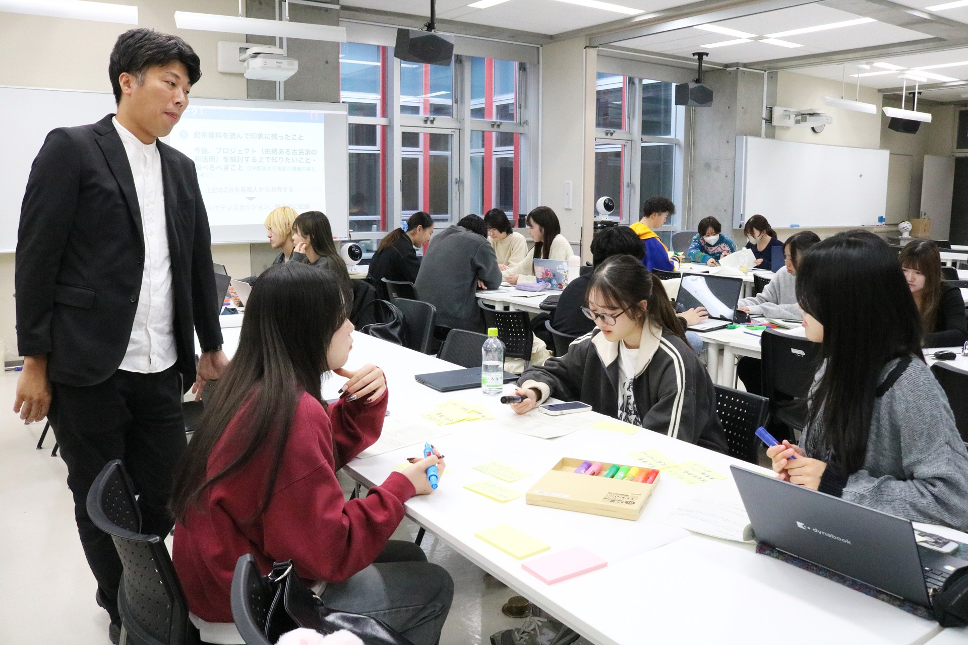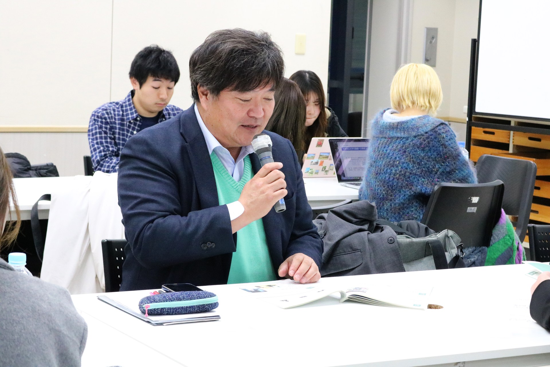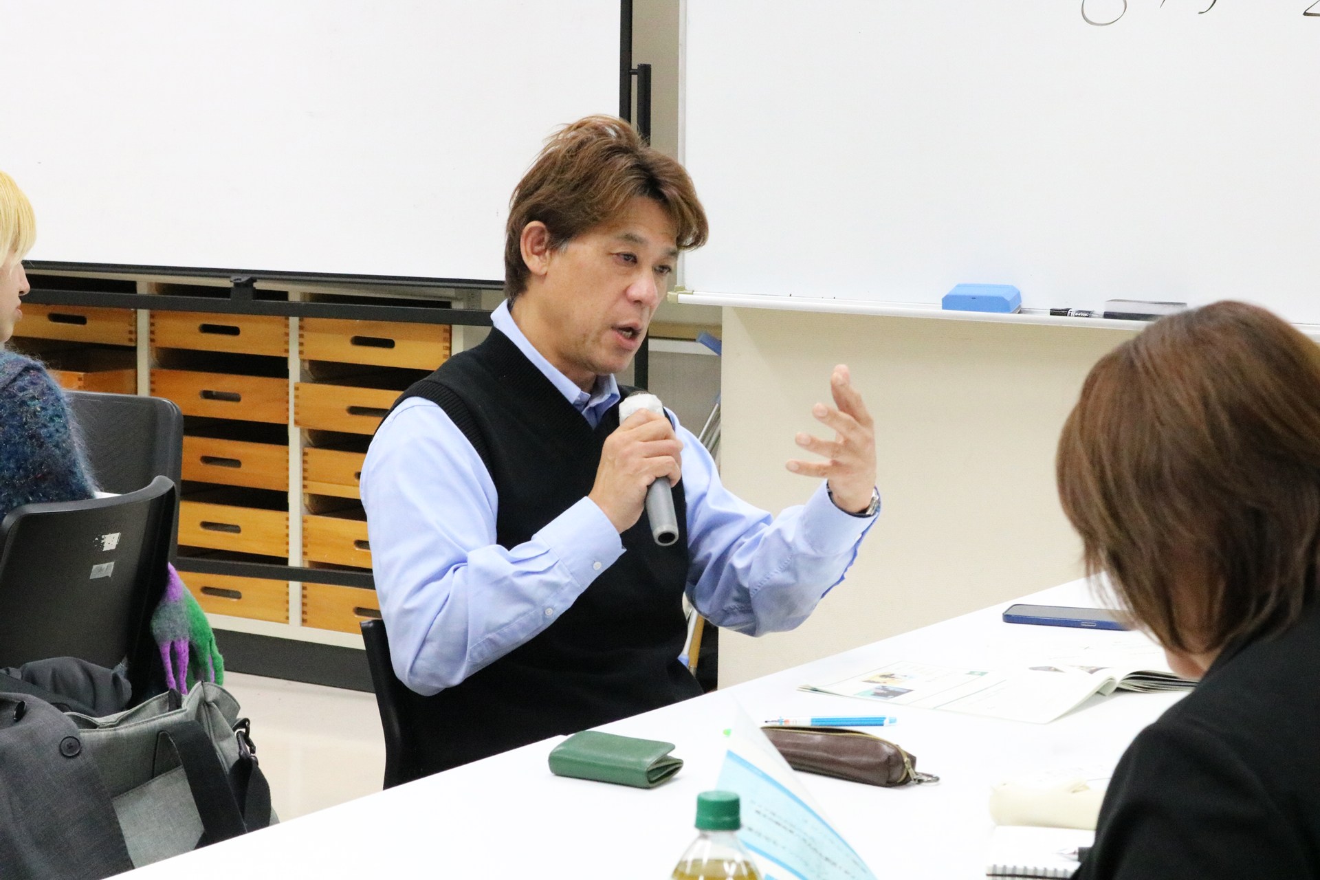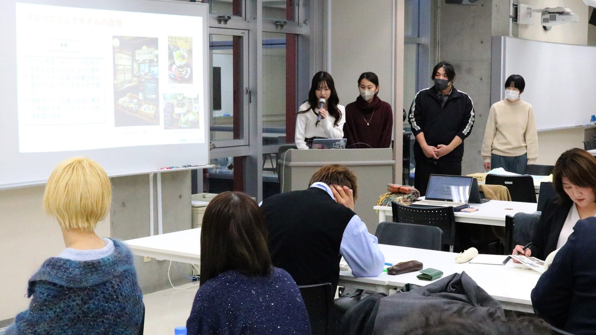 12月24日の最終講義では、株式会社ガイアの代表取締役を務める相澤氏、専務取締役の宇田川氏と永倉氏に向けて、プロジェクト計画の発表を行いました。我妻住宅の歴史が感じられるようなカフェの運営や、静かな環境を活かした合宿企画等の幅広い活用策やプロジェクト計画が発表されました。株式会社ガイアの3人から各グループの発表に対して講評をいただき、相澤氏からは「すぐにでも実践できるようなプロジェクト計画もあった」、「今後、我妻住宅をさまざまなの挑戦のフィールドとしたい」というコメントをいただきました。