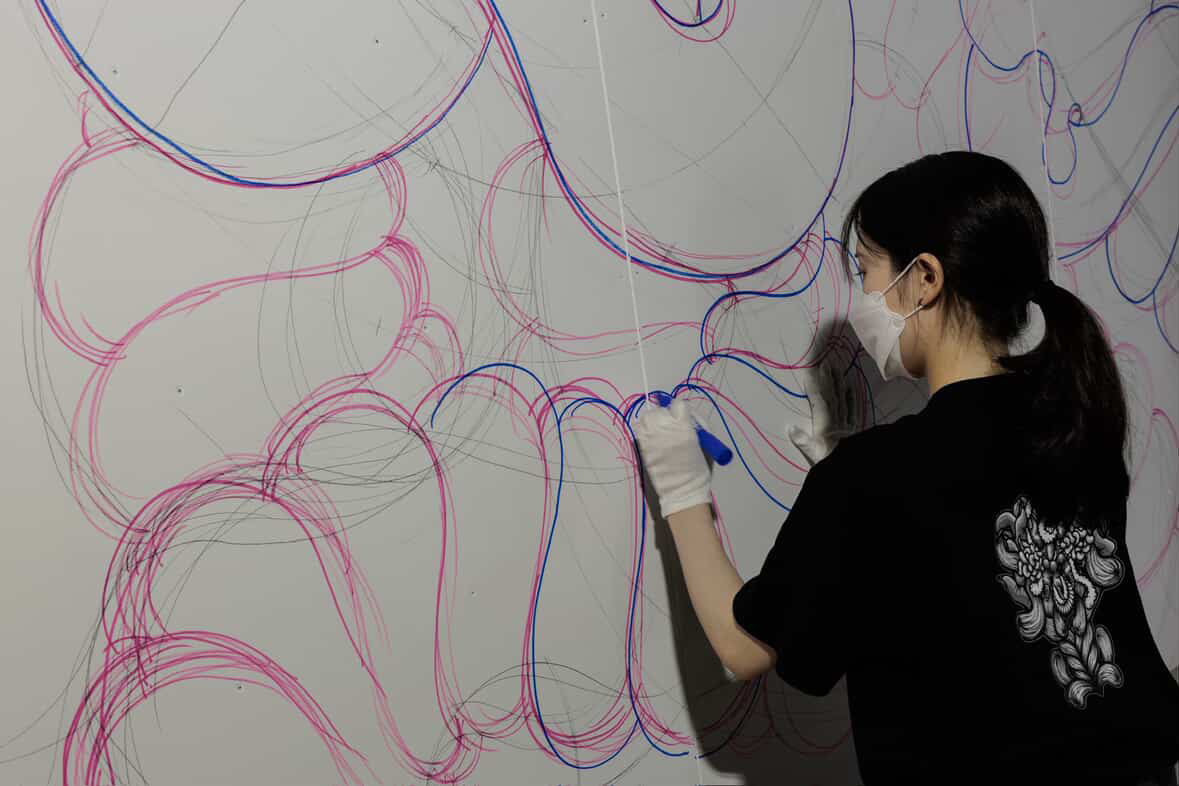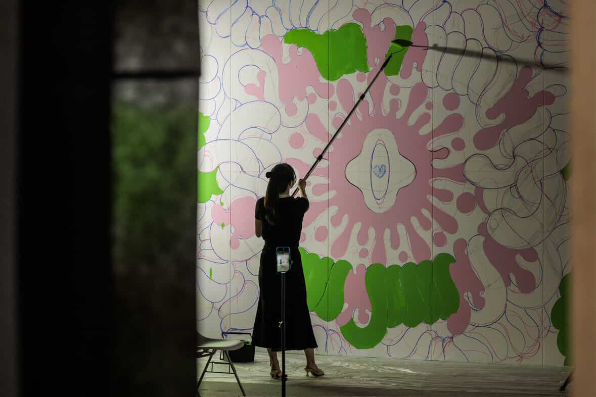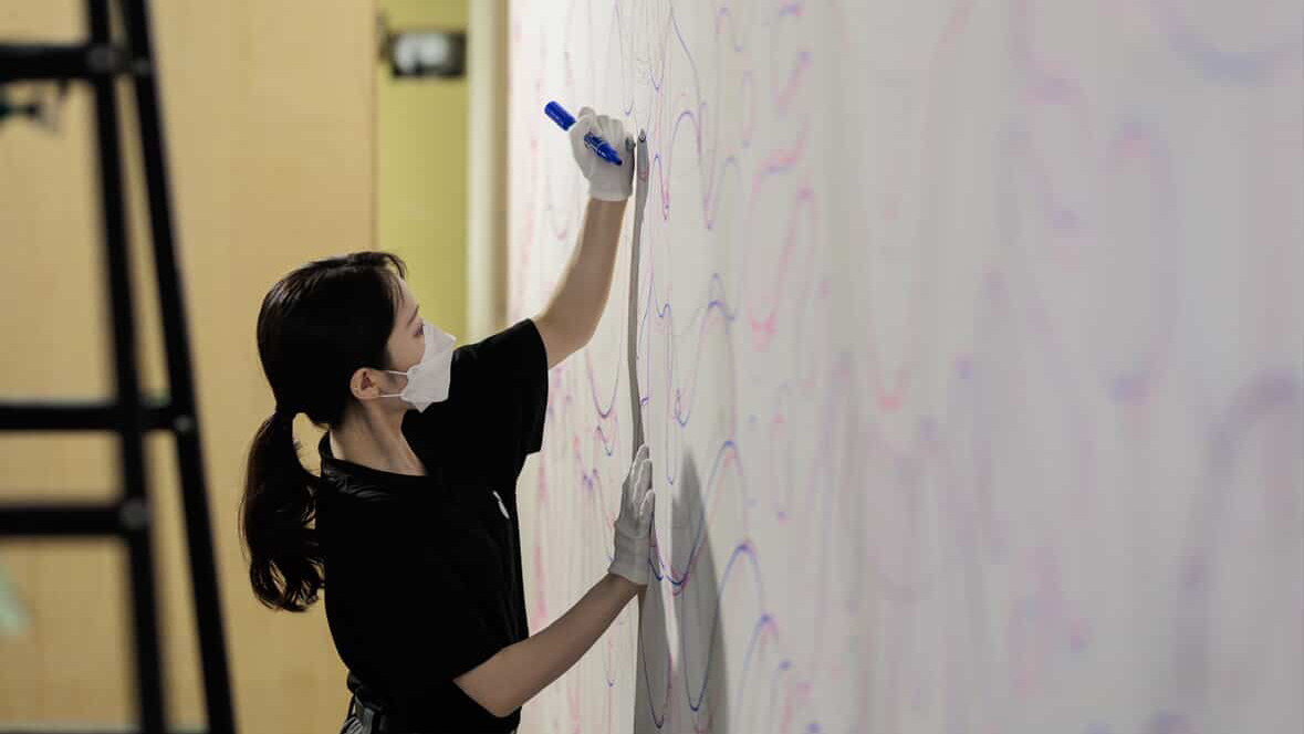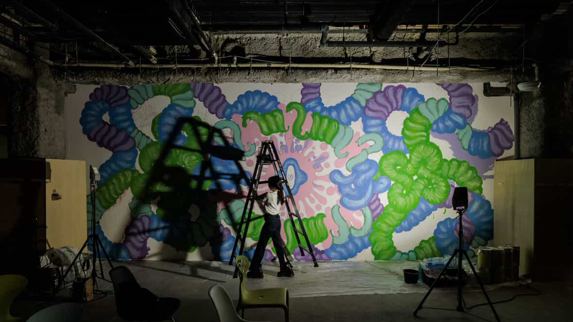 小田嶋さんは現在仙台を拠点に抽象画家として活躍され、今年度7月26日~8月11日の間にBiVi仙台駅東口チネ・ラヴィータ跡地で開催された、「CINE FANTASMA」においても、21年間絶えることなく紡がれてきた"灯"を消さないように、そしてこれからの更なる発展を願って描かれた壁画「灯(ともしび)」を展示いただきました。(撮影は本学事業構想学部卒業生の佐藤早苗(sanas photo works)さん)