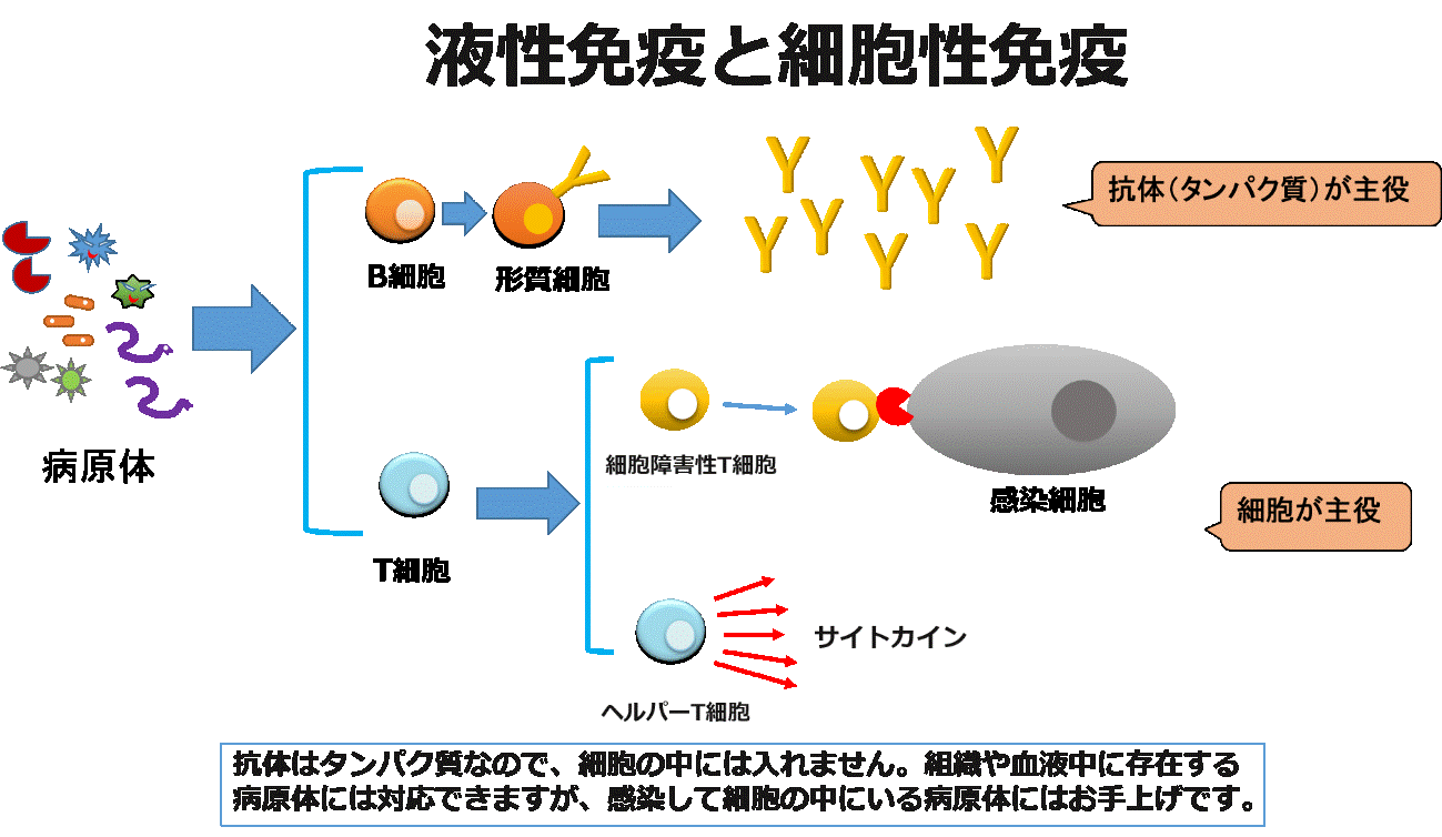 免疫系には、液性免疫と細胞性免疫の大きく分けて2種類があります。液性免疫の中心になる抗体はタンパク質なので、分子量が大きく、感染細胞の中までは入れません。血液中に出てきているウイルスなどには対処できますが、感染細胞をたたくには、抗体では無理なのです。そういうとき、働いてくれるのが細胞性免疫です。ですから、感染症をきちんと防ぐには、液性免疫と細胞性免疫の両輪が必要です。