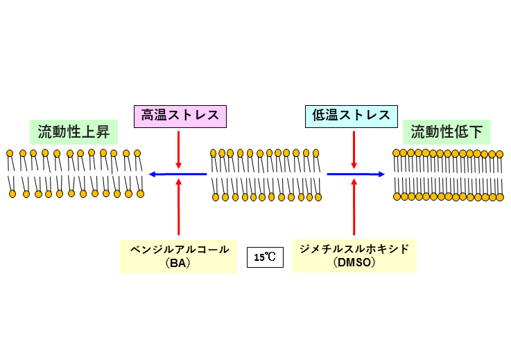 変温生物の細胞では、高温ストレスにより細胞膜を構成する脂質分子の間の距離が広がることで膜自体が柔らかくなります。逆に低温ストレスは分子間の距離を縮めるので膜が固くなり、流動性が低下します。変温生物の環境応答は、このように細胞膜の物理状態の変化を認識することで発動され、その変化を元に戻すと同時に環境耐性を獲得する生理応答が引き起こされます。これがストレス応答という現象です。三上研究室では、すでに他の生物で見出されている環境応答機構の基本原理を参考として、スサビノリが環境変動を認識した場合、その情報が細胞膜から細胞内シグナル伝達経路を介して核に伝えられ、環境耐性能獲得に必要な遺伝子を発現させる一連の流れがあるのではないか、という仮説を立て、今回は特にストレス検知システムに関する検証を行いました。