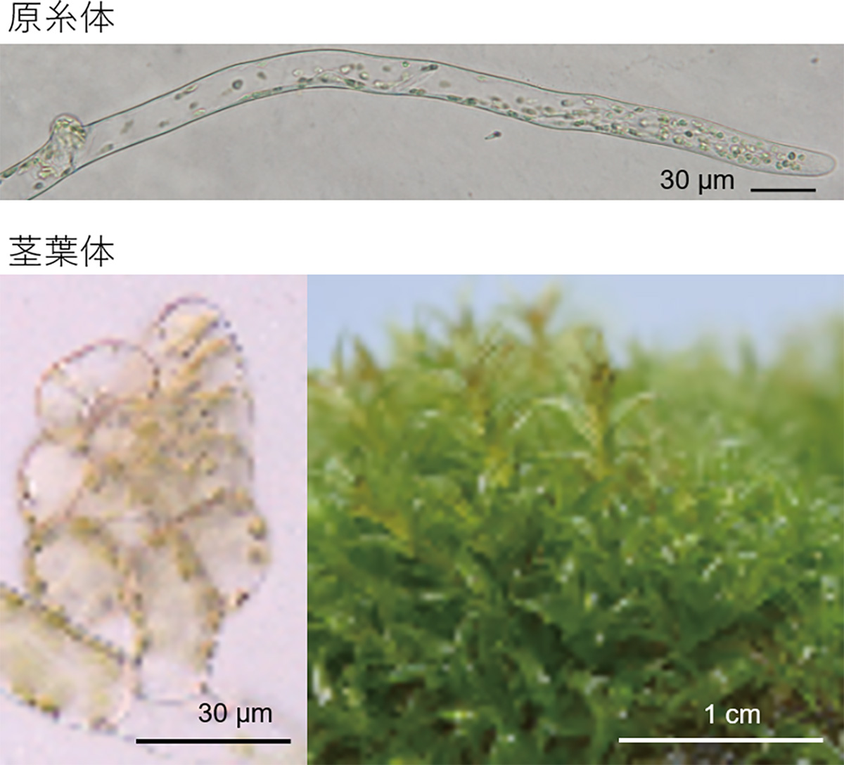 コケ植物は、植物陸上化の初期段階でほかの植物と分かれた植物で、そのうちヒメツリガネゴケは、コケ植物のモデルとして実験によく使用されています。このヒメツリガネゴケは、細胞の観察が簡単で、遺伝子の組換えが容易であることから、細胞伸長や細胞分裂を研究するモデル系として使われています。