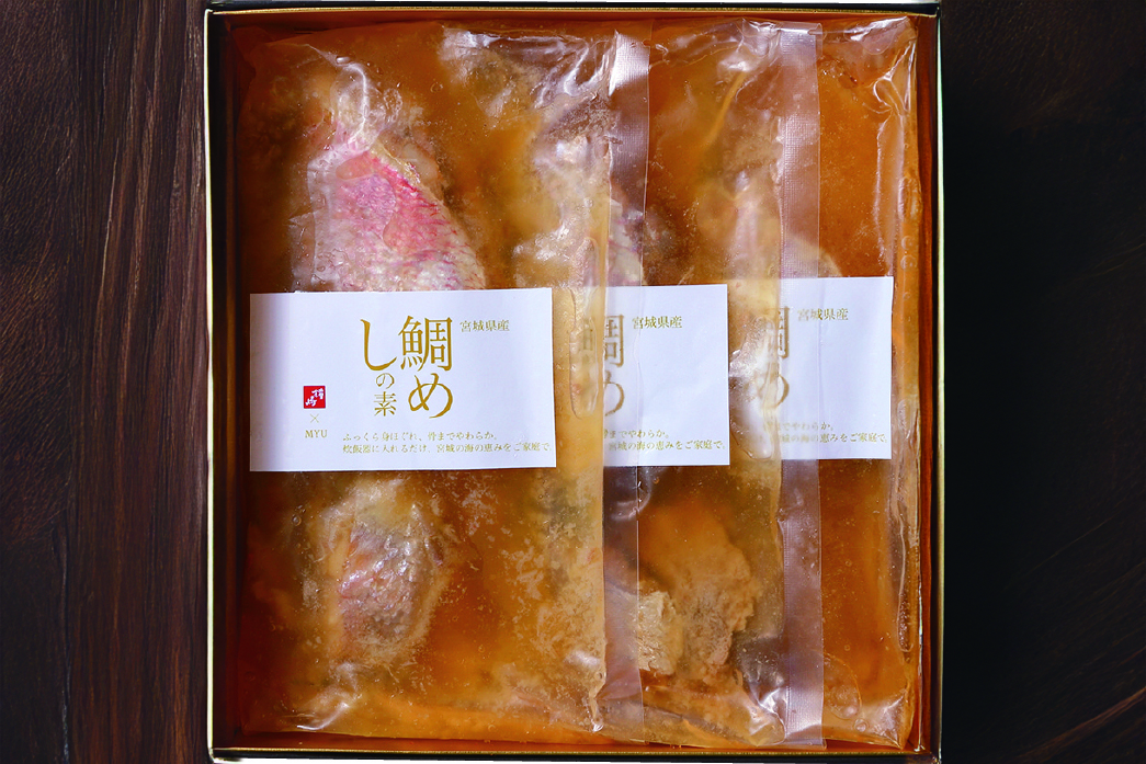 笹かまぼこの「鐘崎」と宮城大学が連携し、宮城の海の恵みを活かすプロジェクトから生まれた一品です。これまで市場に出回ることの少なかった宮城県産のチダイを使い、“もったいない” を“おいしい” に変えました。職人が丁寧にさばいたチダイを特製の調味液に漬け込んでおり、お米と一緒に炊くだけで、旨みたっぷりの本格的な鯛めしが完成します。骨まで柔らかく、魚本来の風味をまるごと味わえる炊き込みご飯は、お祝いの席にも華を添える贈り物です。今回は、宮城大学食産業学群の学生が素材を吟味し、つくり易いレシピ開発に挑戦し、木津初音さん、相原吉良さん、角田萌々香さん、油井杏樹さん、吉野華穂さんが開発に参画しました。