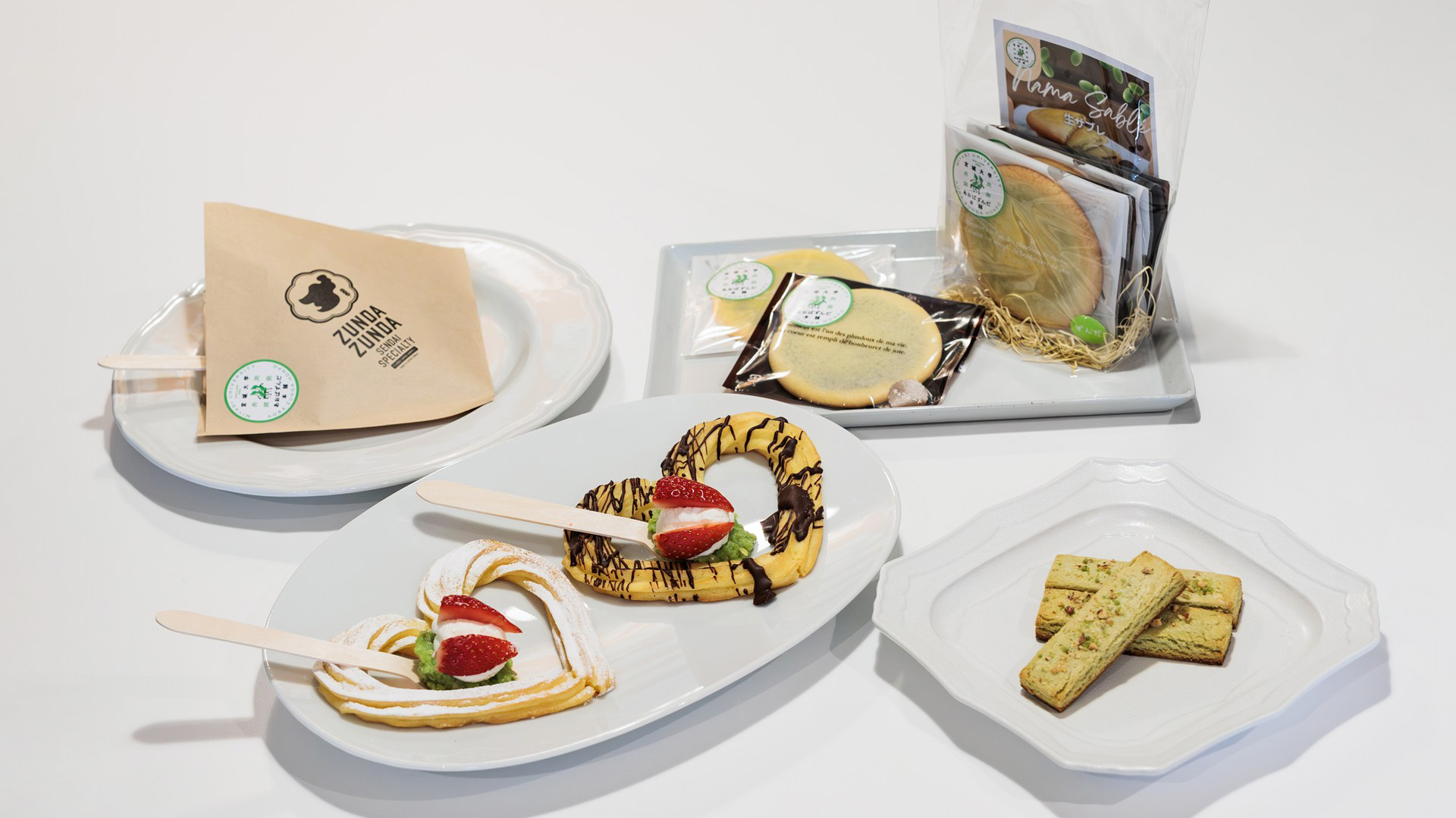 | ②『もっちり焼きチュロス ZUNDA 添え』( みやこがねもち、ミヤギシロメ使用) 宮城大学学生発案の商品 特徴:ハートの形をした焼きチュロス、クリスマス限定商品 販売予定期間:12/12(金)~12/25(木)に、ZUNDA ZUNDA CAFE 仙台一番町本店にて | |