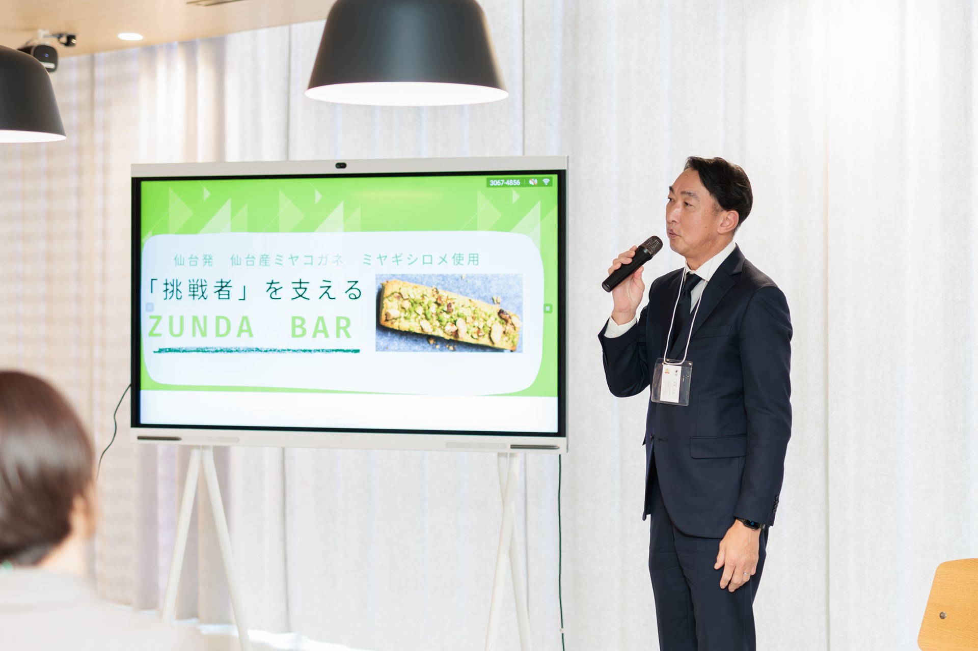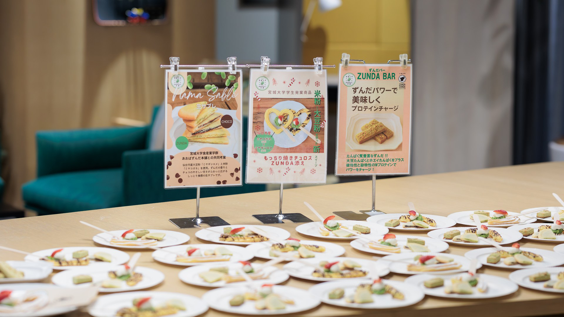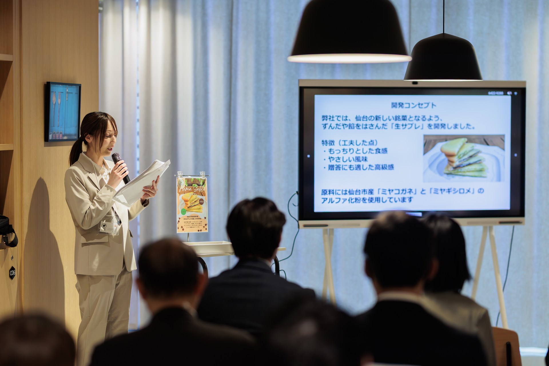 | 内容 | 1. 開会 2. 挨拶(仙台市農業振興課) 3. あおばずんだ本舗株式会社代表挨拶(代表取締役社長 髙橋正宏 氏) 4. 商品開発報告(宮城大学 食産業学群 准教授 庄子真樹) 5. 商品に関するプレゼンテーション(宮城大学食産業学群 学生4 名) 6. 試食3 種 7. 質疑応答 8. 閉会 |