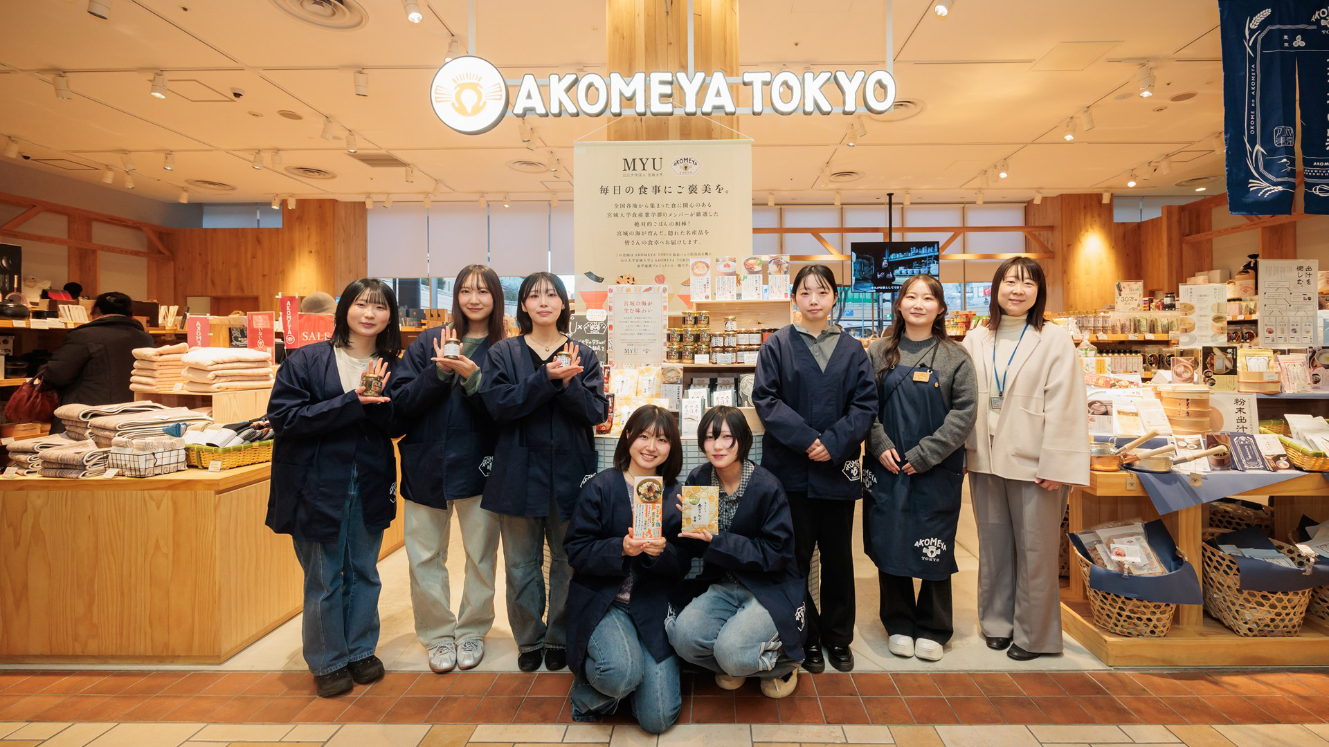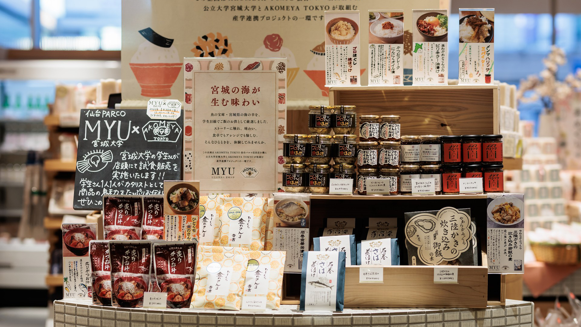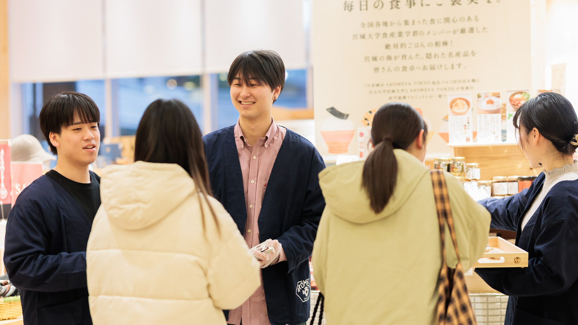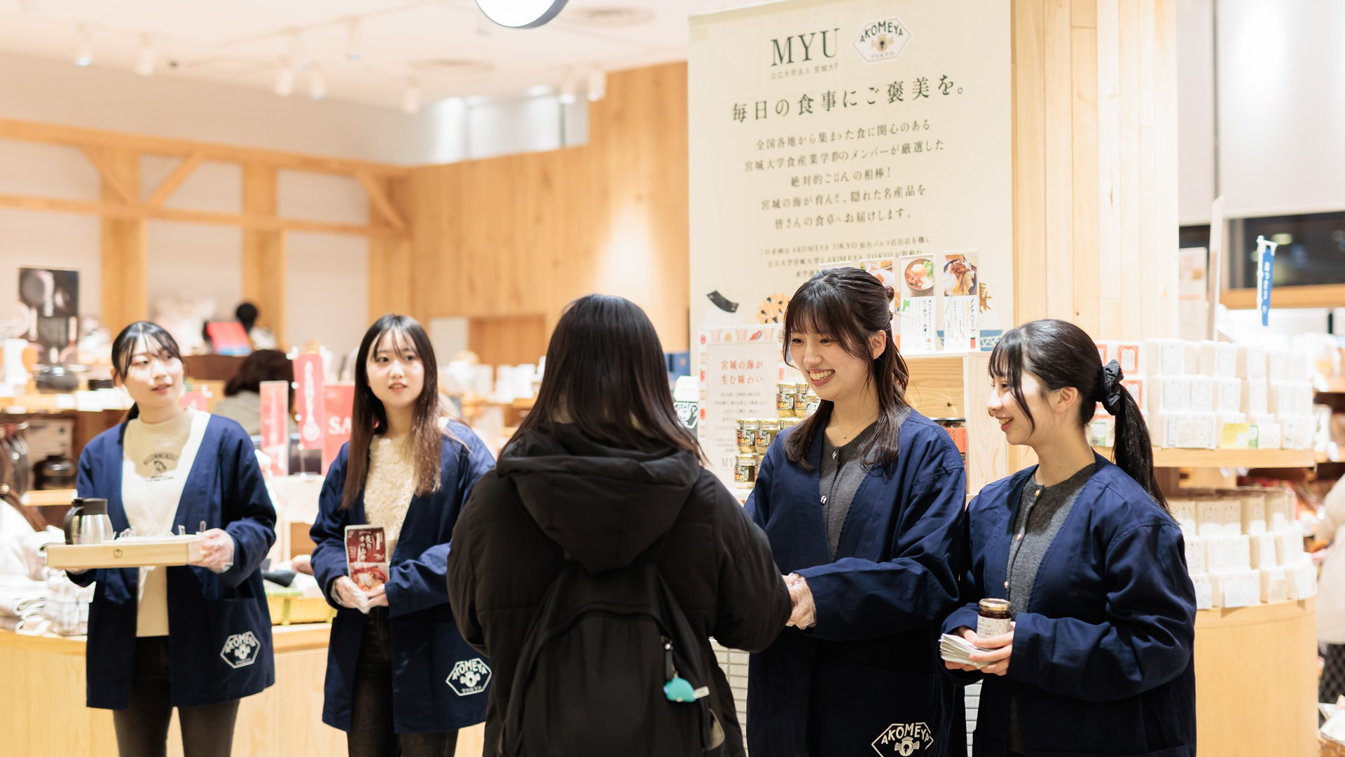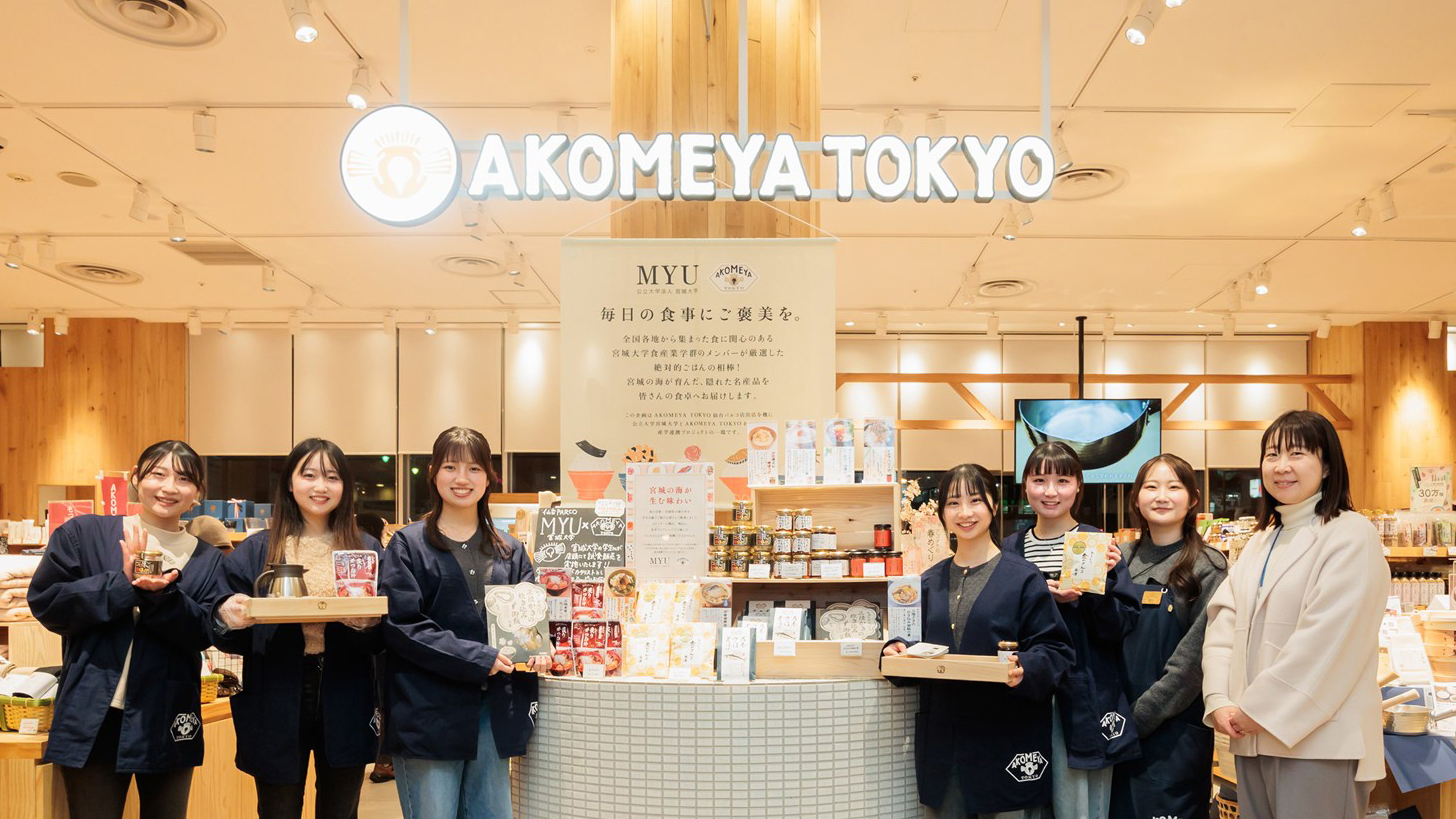宮城大学では、地域課題を解決する研究と社会連携を推進し、これらに基づいた教育により地方創生とその発信を先導しうる人材を育成しています。食産業学群の授業「食品マーケティング演習」は食産業学群の3年次後期開講の選択科目で、食産業を事例とした、商品(コミュニケーション)企画の立案に関して演習形式で学びます。昨年に引き続き、今年も食産業学群の学生たちが、AKOMEYA TOKYOとの産学連携プロジェクトとして、宮城県の地域資源を活用した商品販売を行いました。