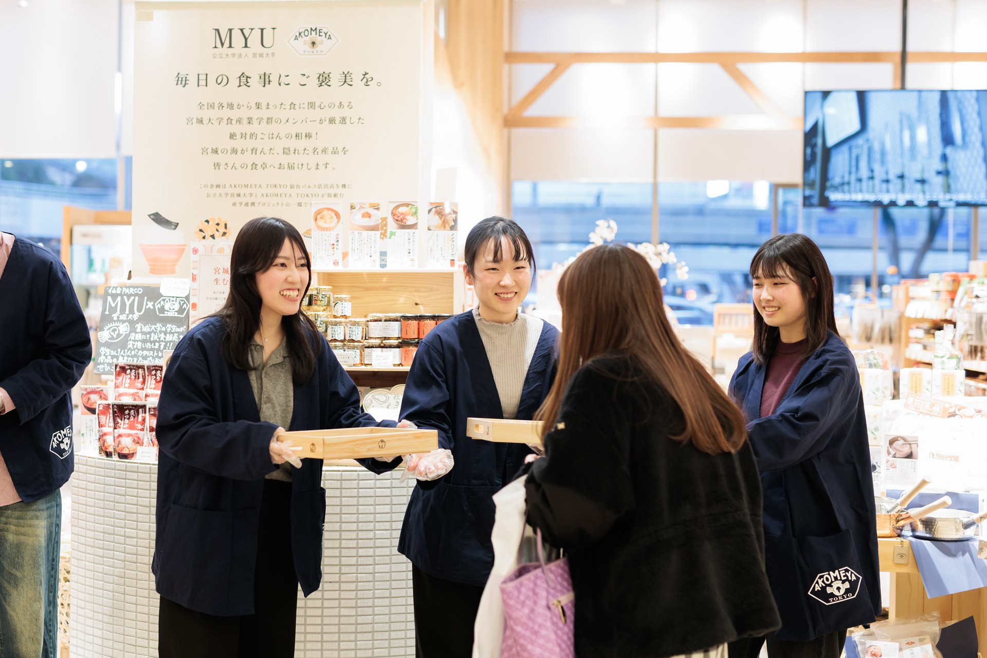 AKOMEYA TOKYO は、全国各地から厳選したさまざまな種類のお米を中心に、ごはんと相性抜群のごはんのお供や和食の中心にある出汁や調味料、食器・調理道具などを扱い、東京を中心に 36店舗 + オンラインショップを展開するライフスタイルショップです。学生たちはこれまで、AKOMEYA TOKYO が目指す社会や地域との関わり、マーケティング戦略や商品政策を学び、地域や作り手の経済的利益だけではなく、地域資源の活用や食文化伝承などの「社会的価値の実現を目指す」という共通ビジョンのもと、食産学生が宮城県の食材を発掘するバイヤーとして、前年から継続したい商品と新たに「AKOMEYA TOKYO 仙台パルコ」で販売したい商品を提案しました。販売会当日は、有志学生による商品ストーリーも踏まえた接客販売を実施しました。たくさんのご来場ありがとうございました。