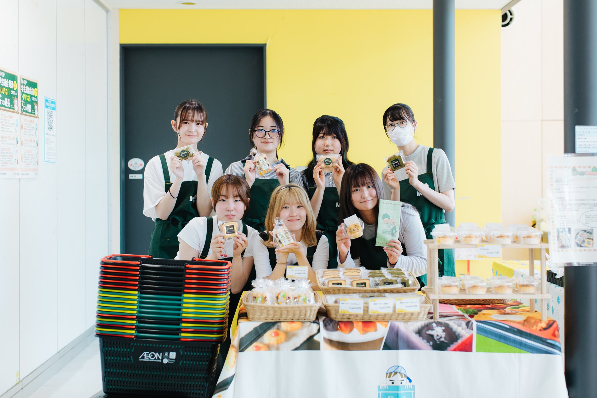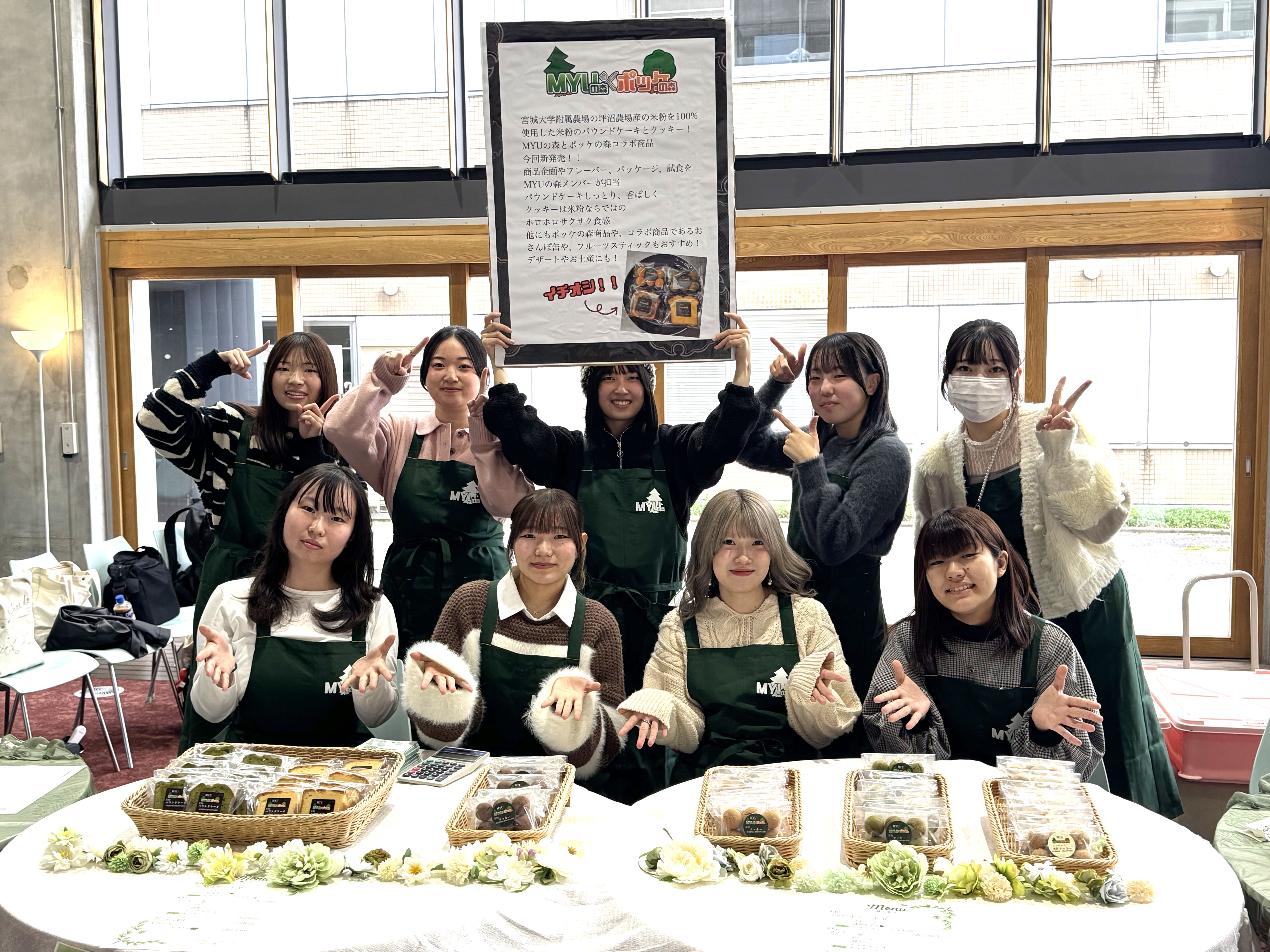 MYUの森は、宮城大学の学生36名で活動するエシカルボランティアサークルです。「みんなが美味しく楽しく幸せになれるよう、エシカル消費に貢献していきます」を活動の抱負に掲げ、障がい者福祉施設「ポッケの森」さんのスイーツ作りへの参加や、地域のお祭り(ミニポッケ祭り・太白区民祭りなど)のスタッフボランティアとして積極的に活動しています。障害のある方々が作るスイーツのエシカル消費を推進し、工賃の向上に貢献することを目的としており、これまでに宮城大学農場のお米を使った米粉のオリジナルスイーツの企画・開発を行うなど新しい取り組みにもチャレンジしています。