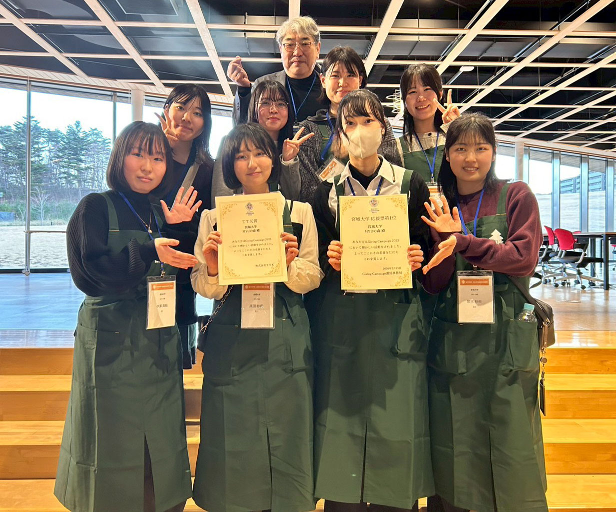 宮城大学のエシカルボランティアサークル「MYUの森」が、学生の研究活動や課外活動の応援・支援を目的としたオンラインチャリティーイベント「Giving Campaign 2025」において、宮城大学内で最も多くの応援票を集めた団体として選出されるとともに、株式会社TTK様の企業賞を受賞しました。