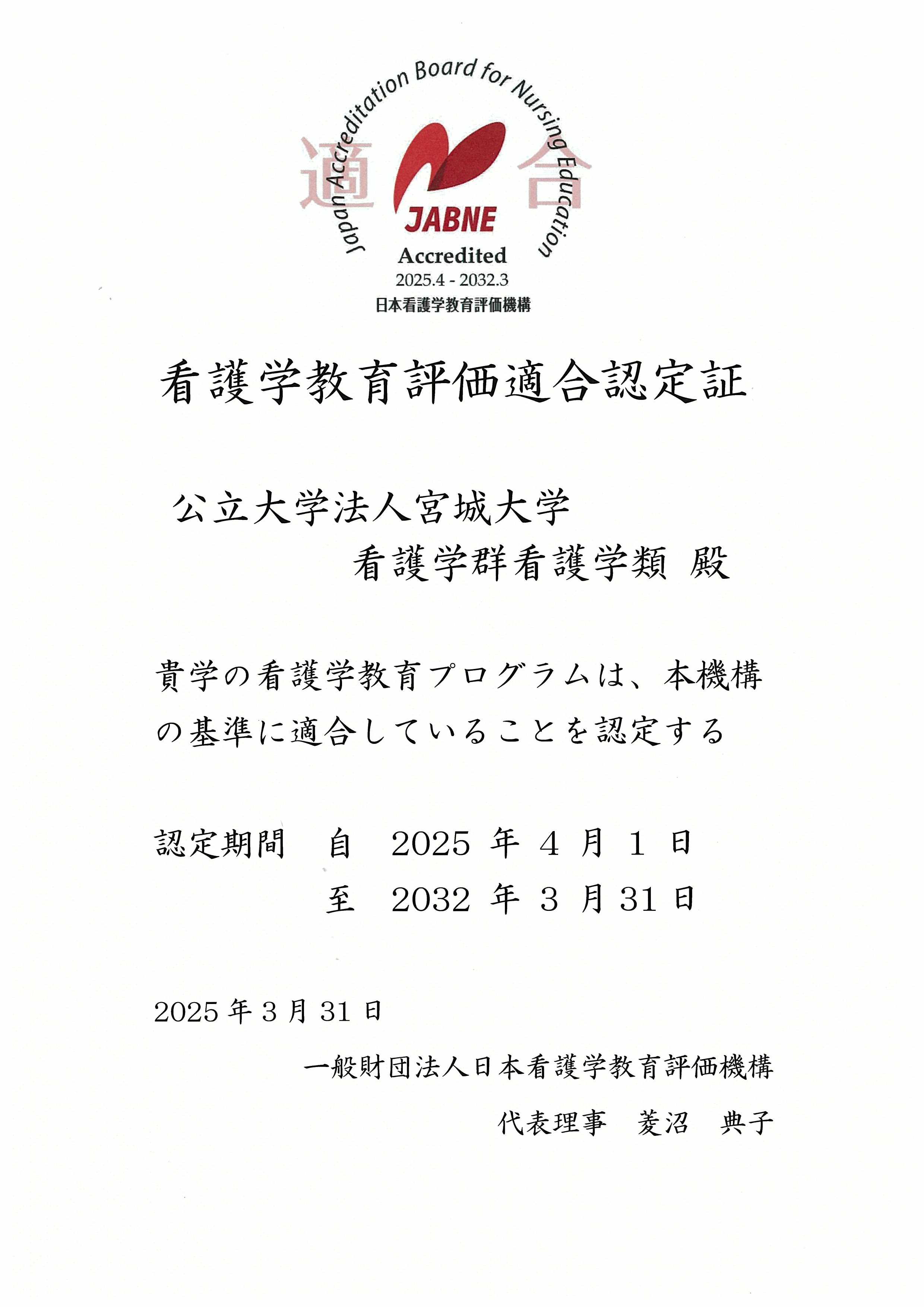 2024年度に一般財団法人日本看護学教育評価機構(通称:JABNE)が実施する日本看護学教育評価を受審し、宮城大学看護学群看護学類の看護学教育プログラムが、当該機構の定める評価基準に「適合」していることが認定されました。