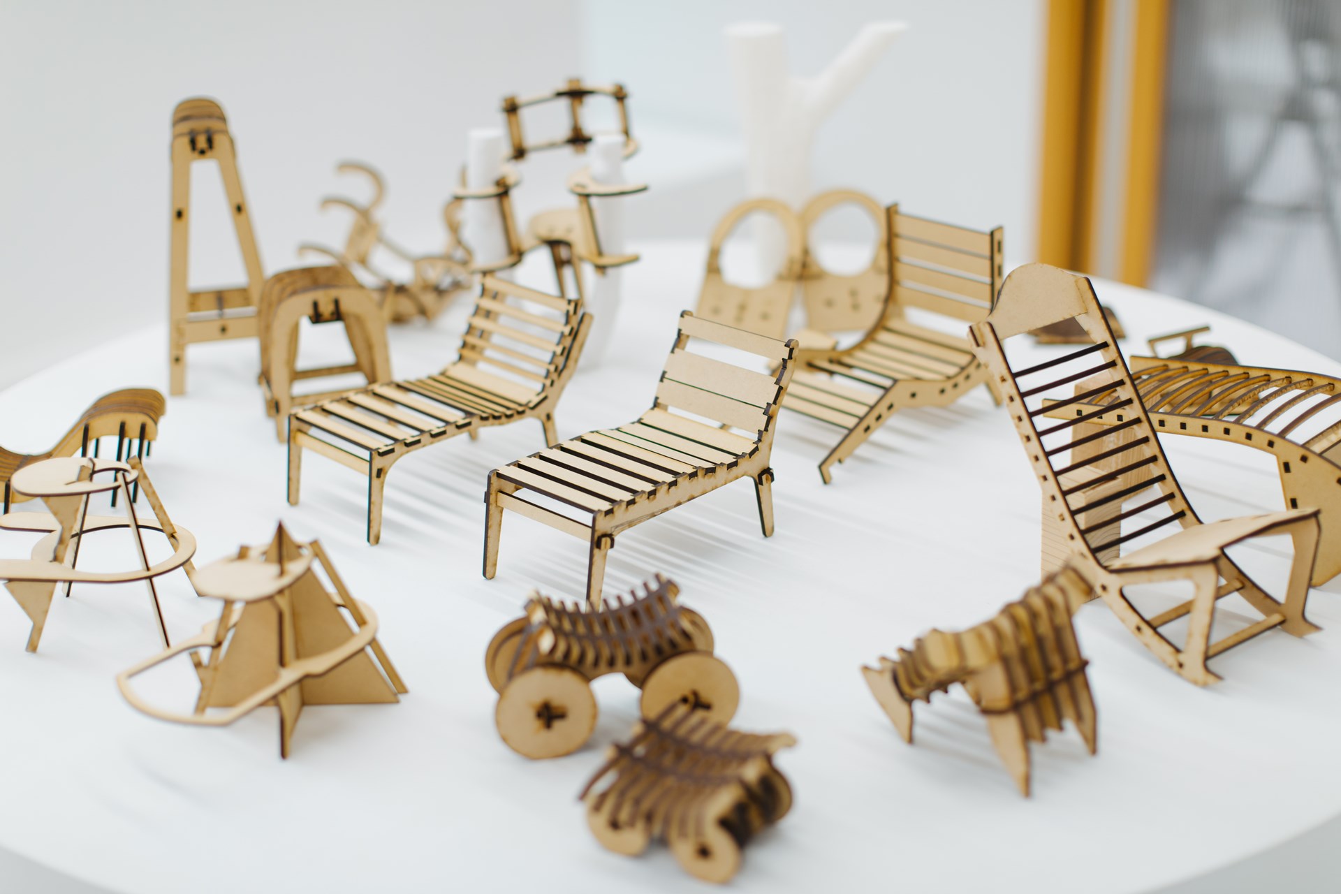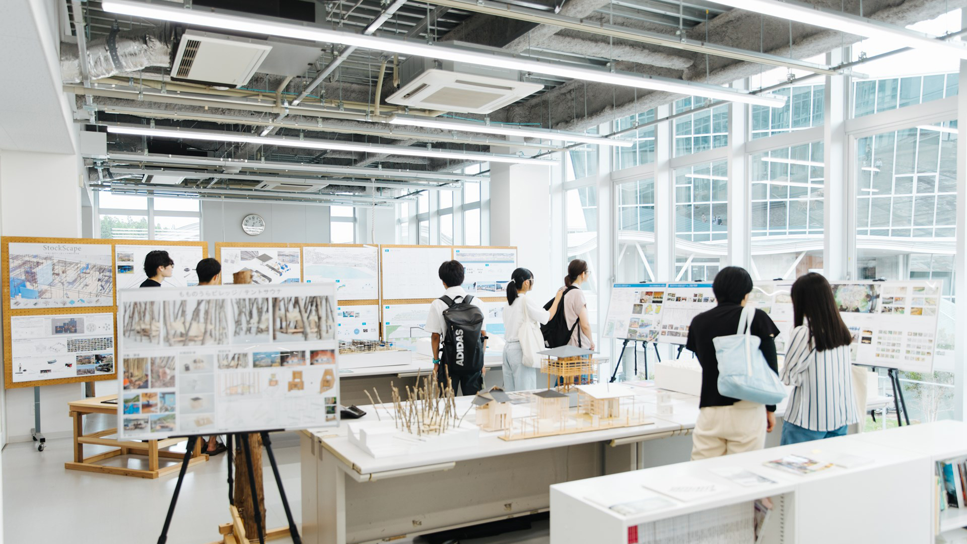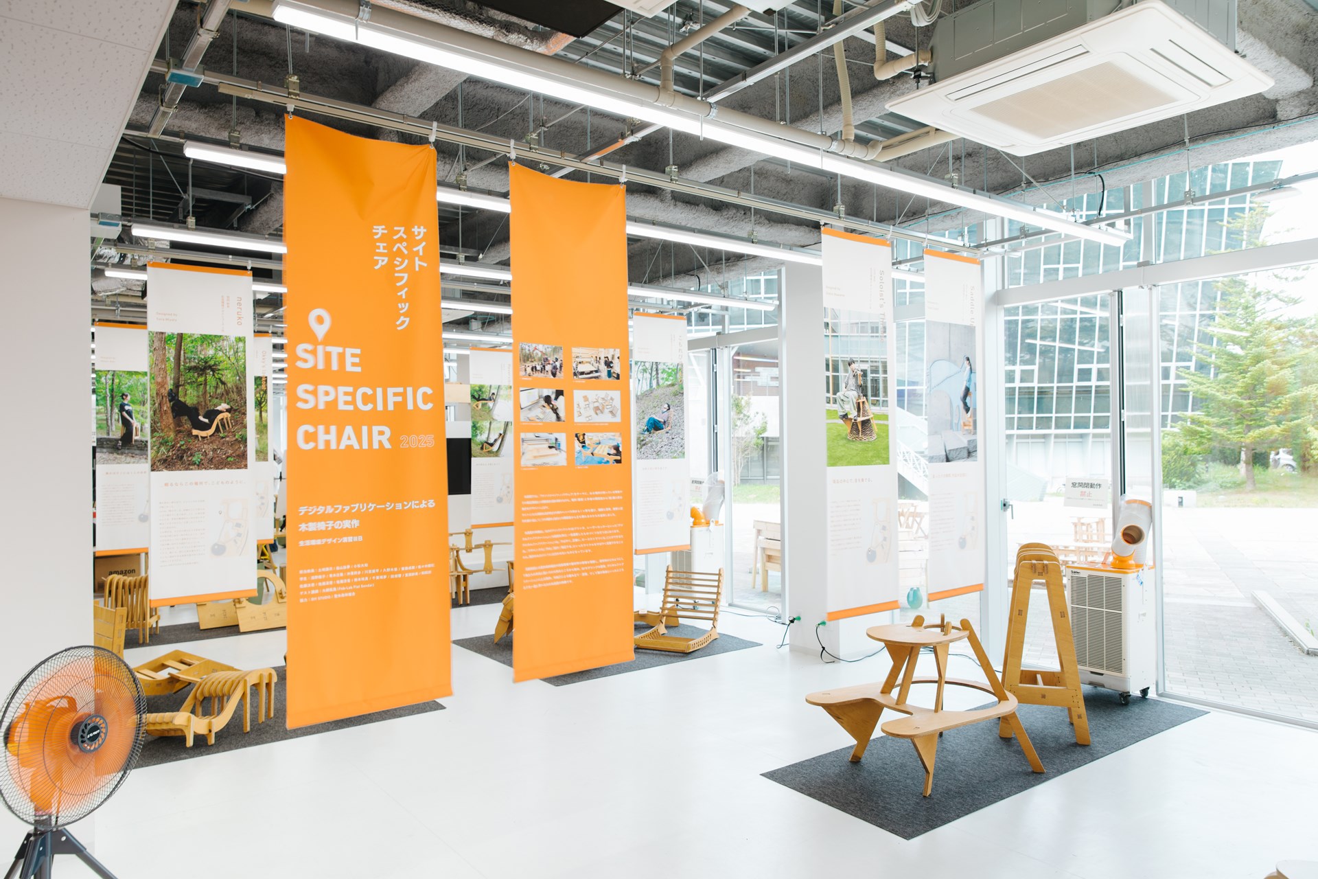 価値創造デザイン学類の活動を紹介します。1F オープンスタディでは、CAD 設計とデジタル木工加工機を駆使して宮城県登米市産の杉材を用いた椅子を制作するプロダクト演習の成果や、デザインに関する課外活動の成果を展示しています。2F では、生活環境デザインコースの学生たちの設計作品、都市・建築・インテリアデザインやまちづくりに携わる研究室の活動を展示しています。3F の感性情報デザインコースの演習展示では、インタラクティブなメディア作品(“わ” てん -「◯」展)を展示しています(一部は交流棟で展示)。