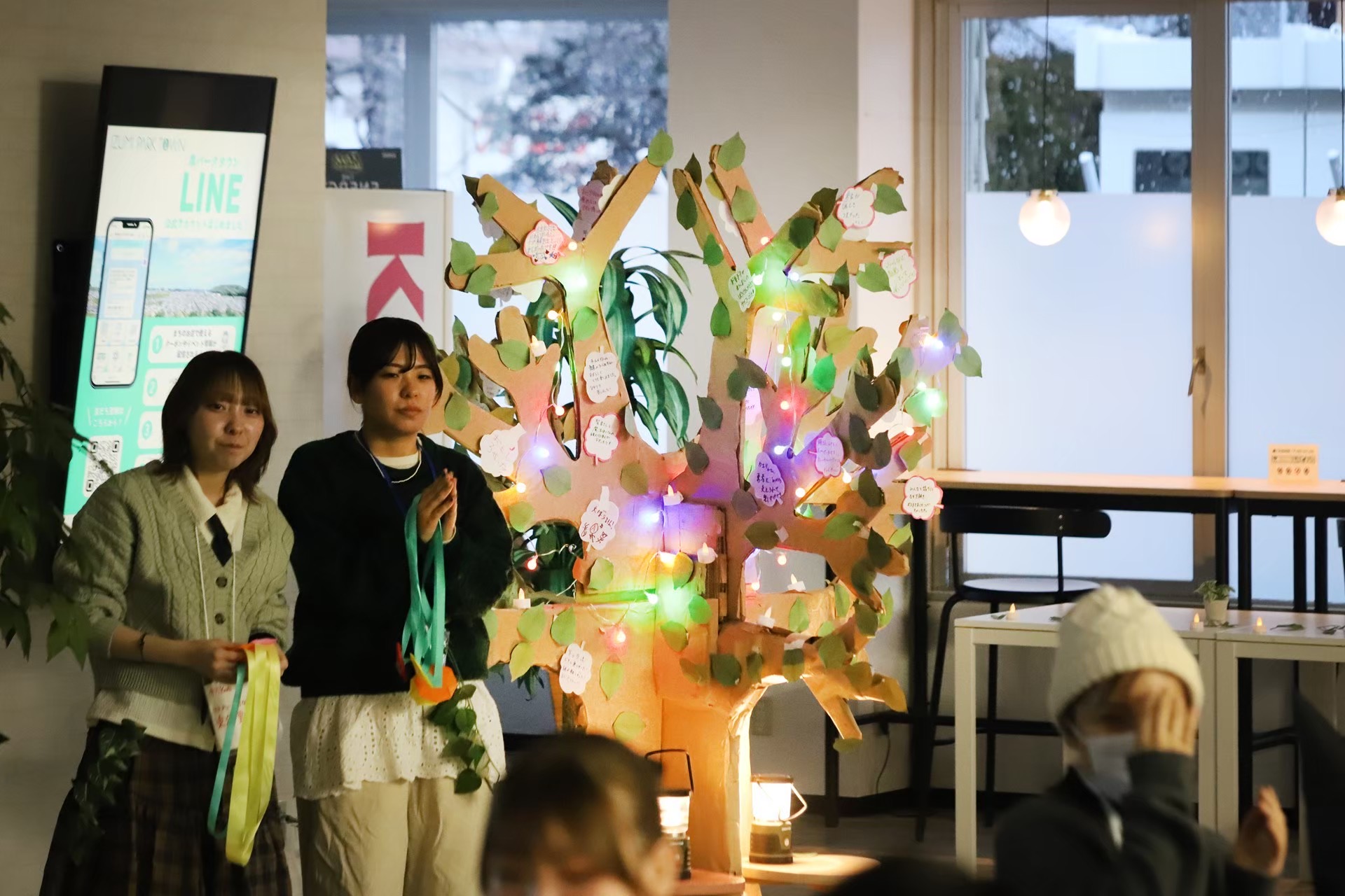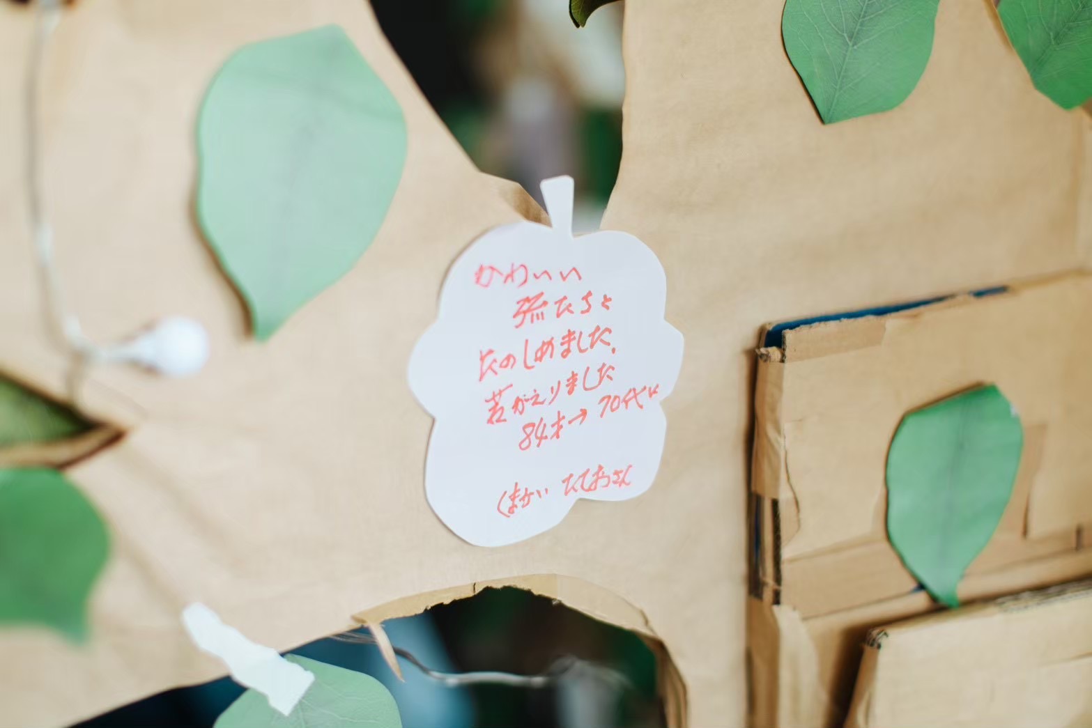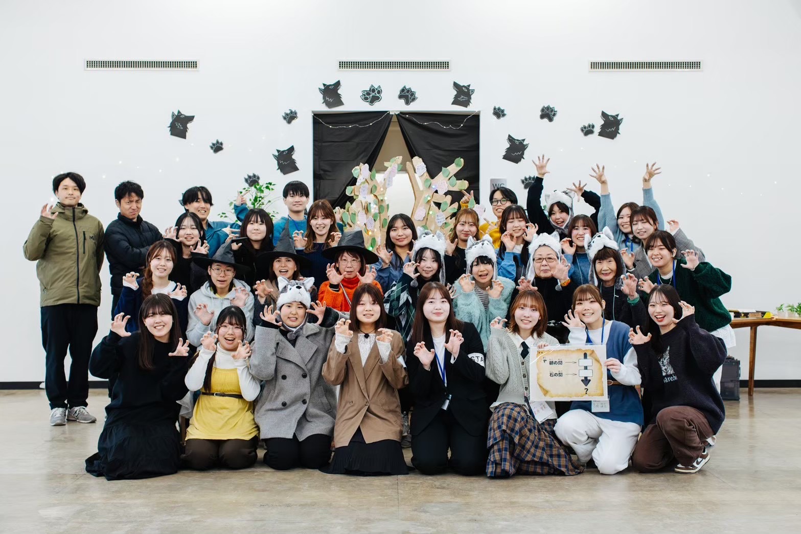 当日は学生と運営住民がペアを組み、イベント参加者に謎を出題しました。リハーサル同様、迫真の演技で謎解きの世界観を創りあげることができました。参加者は子どもから高齢者まで幅広い世代にわたり、各チームが一生懸命謎解きに挑戦する様子が見られました。チームの団結力を深めるためにイベント冒頭にミニゲームが行われ、初対面の方々同士でも緊張をほぐすことができました。謎解きのラストにはラスボスの狼からの難問の出題もあり、チームで協力して回答していました。全ての謎を解き終えた参加者には「想いの葉」として葉っぱが配られ、それぞれのまちへの想いを書いてもらい、木に飾ってもらいました。