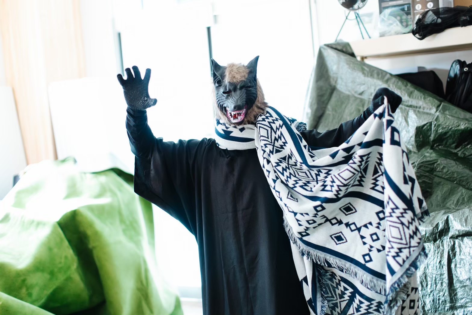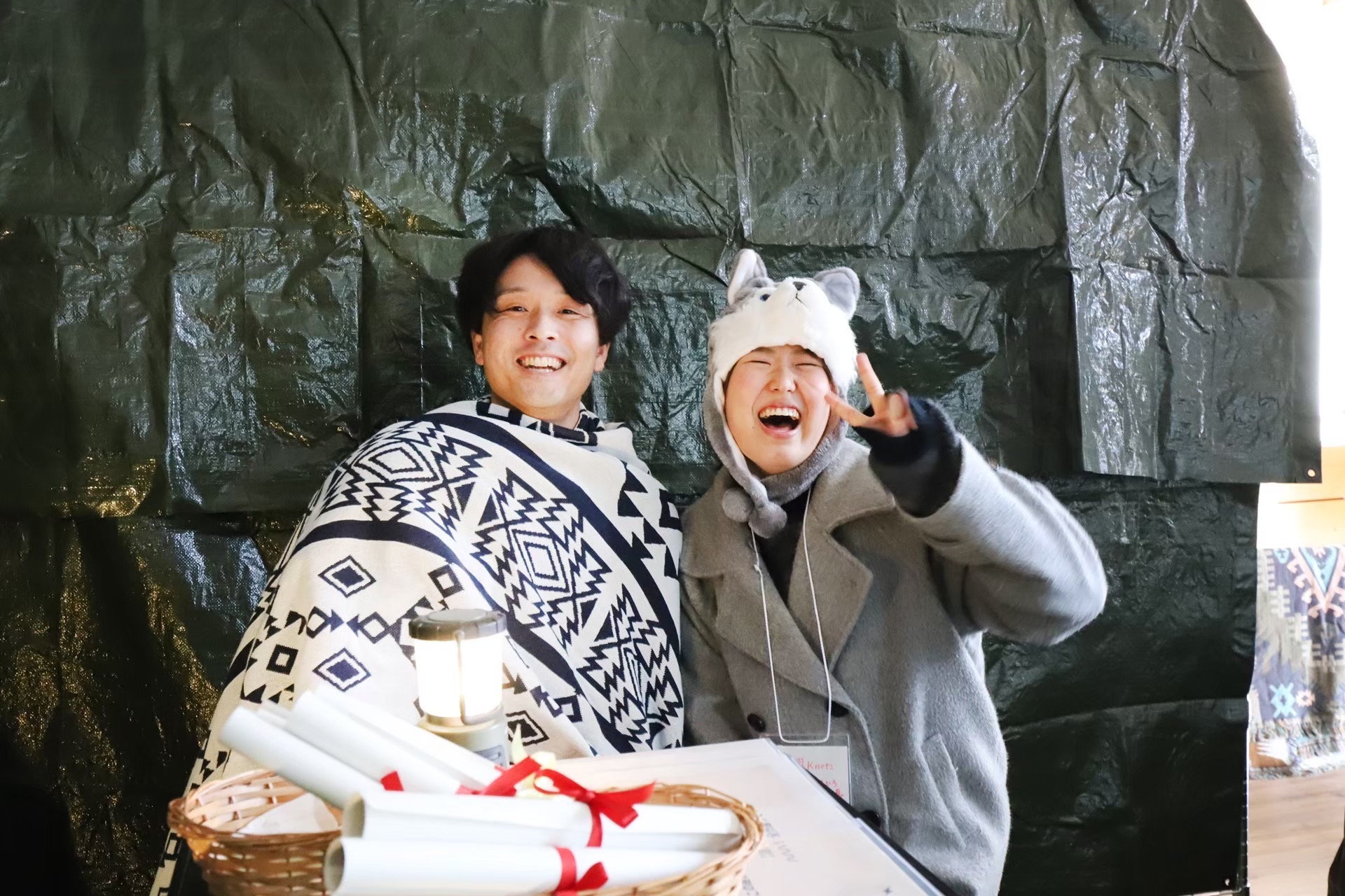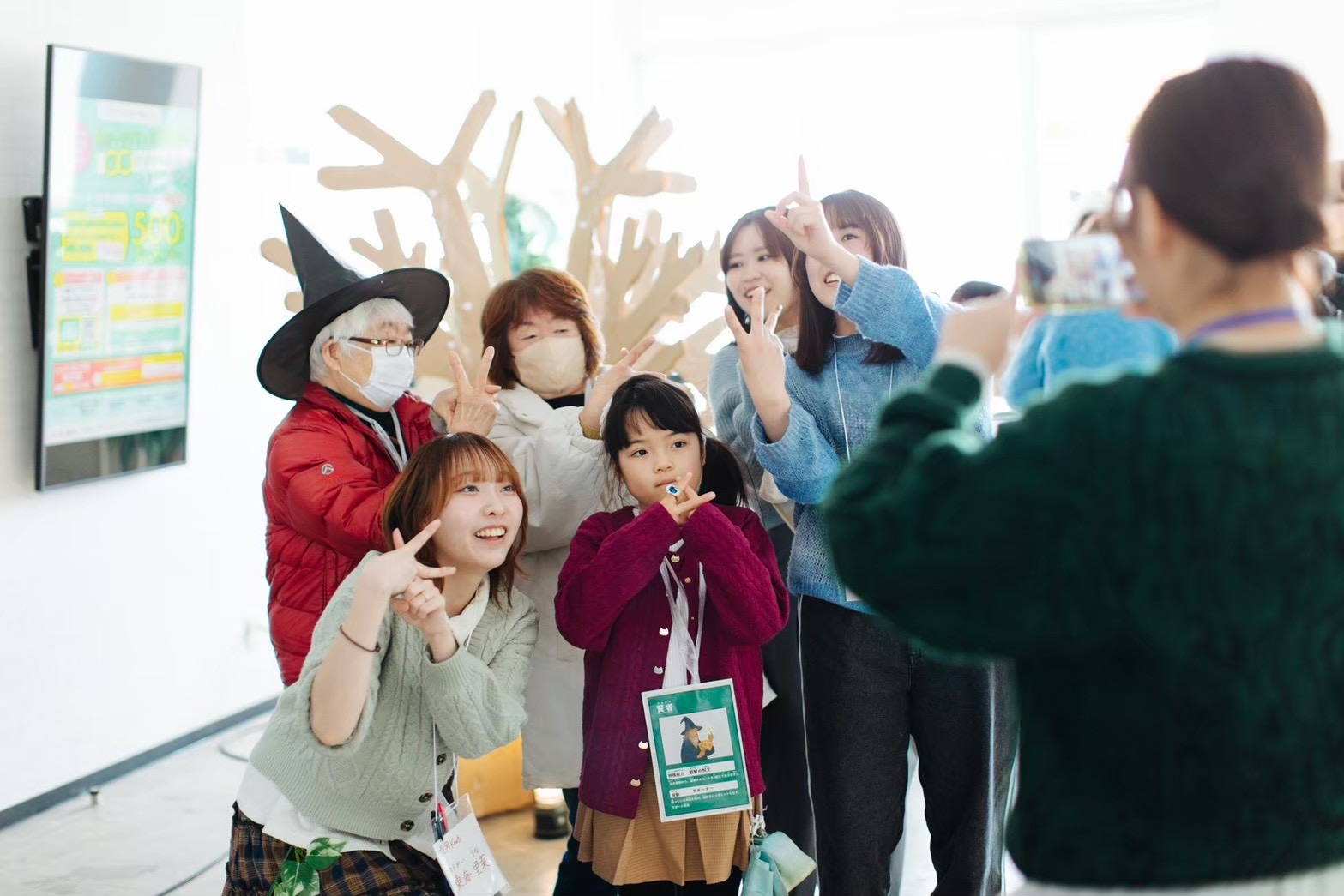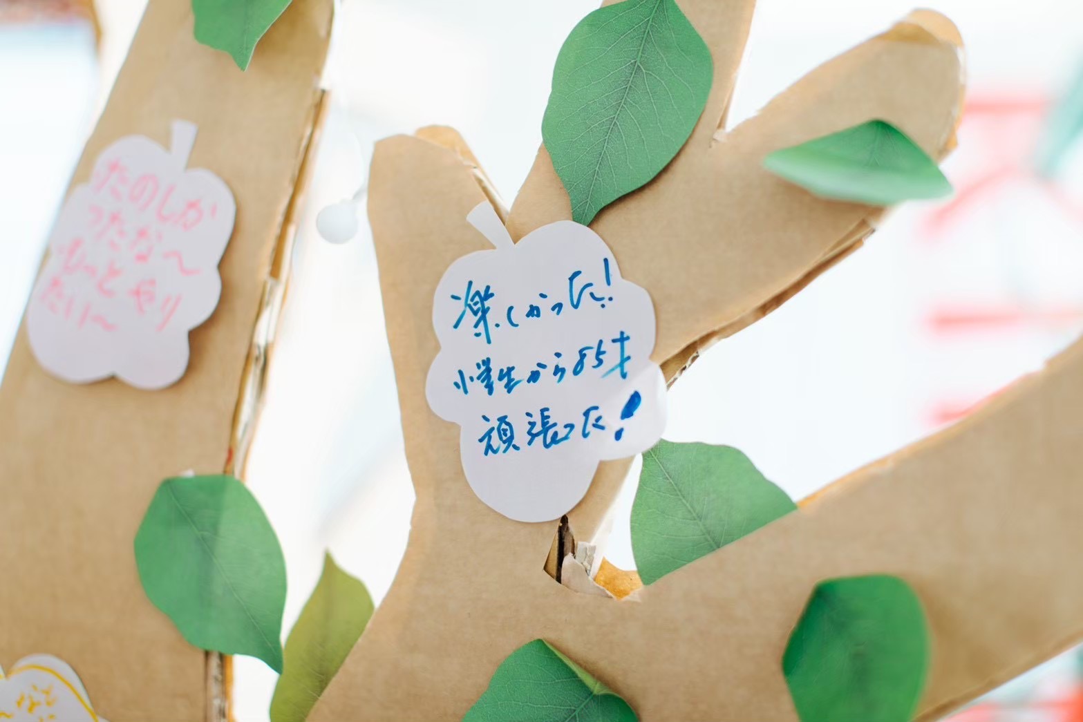 当日は学生と運営住民がペアを組み、イベント参加者に謎を出題しました。リハーサル同様、迫真の演技で謎解きの世界観を創りあげることができました。参加者は子どもから高齢者まで幅広い世代にわたり、各チームが一生懸命謎解きに挑戦する様子が見られました。チームの団結力を深めるためにイベント冒頭にミニゲームが行われ、初対面の方々同士でも緊張をほぐすことができました。謎解きのラストにはラスボスの狼からの難問の出題もあり、チームで協力して回答していました。全ての謎を解き終えた参加者には「想いの葉」として葉っぱが配られ、それぞれのまちへの想いを書いてもらい、木に飾ってもらいました。