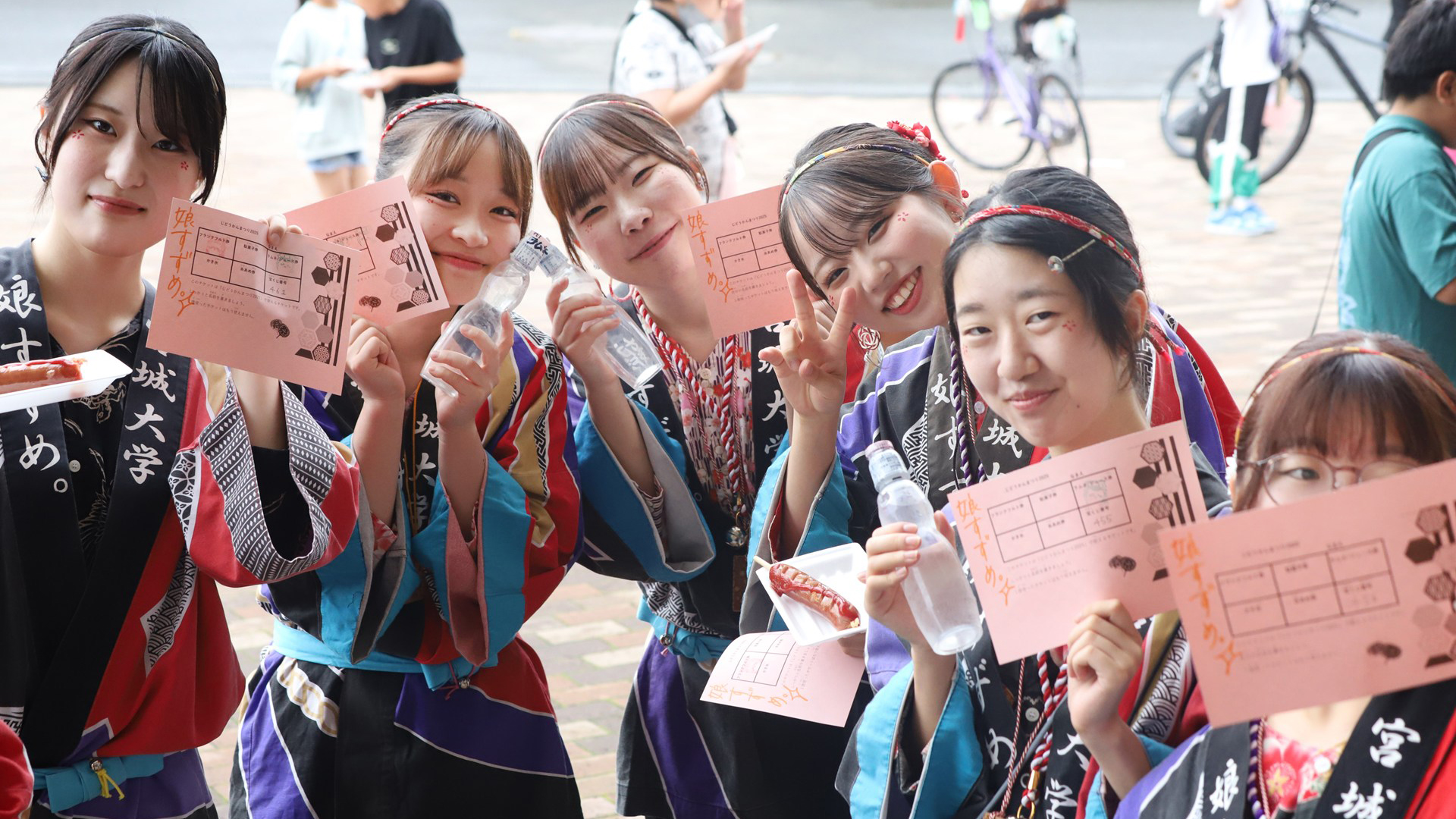 宮城大学すずめ踊りサークル「娘すずめ。」です。結成当初、女性メンバーが多かったことから「娘すずめ。」と書いて「こすずめ。」といいます! 現在は男女合わせて計70名ほどで仲良く元気に活動しています。