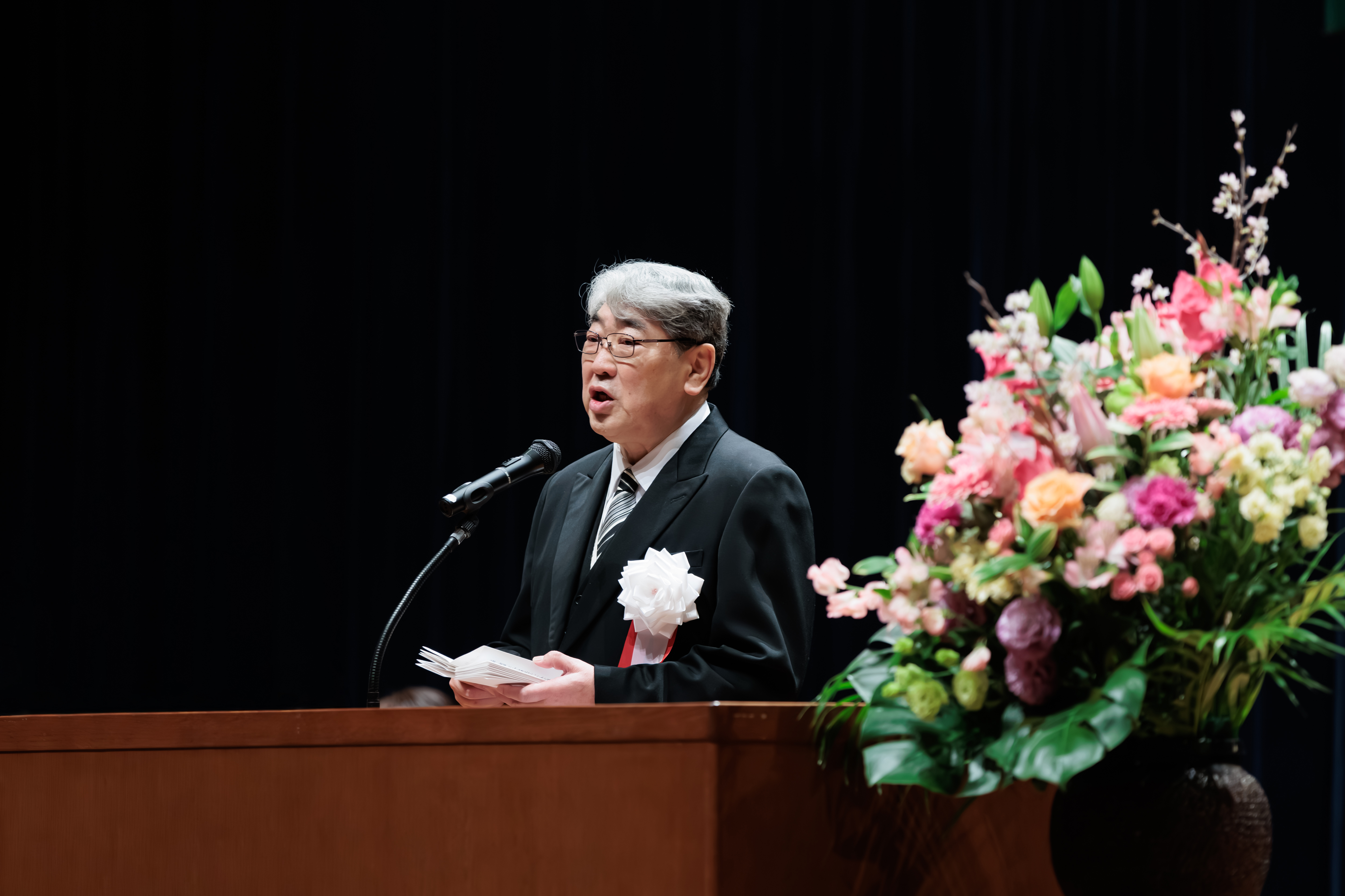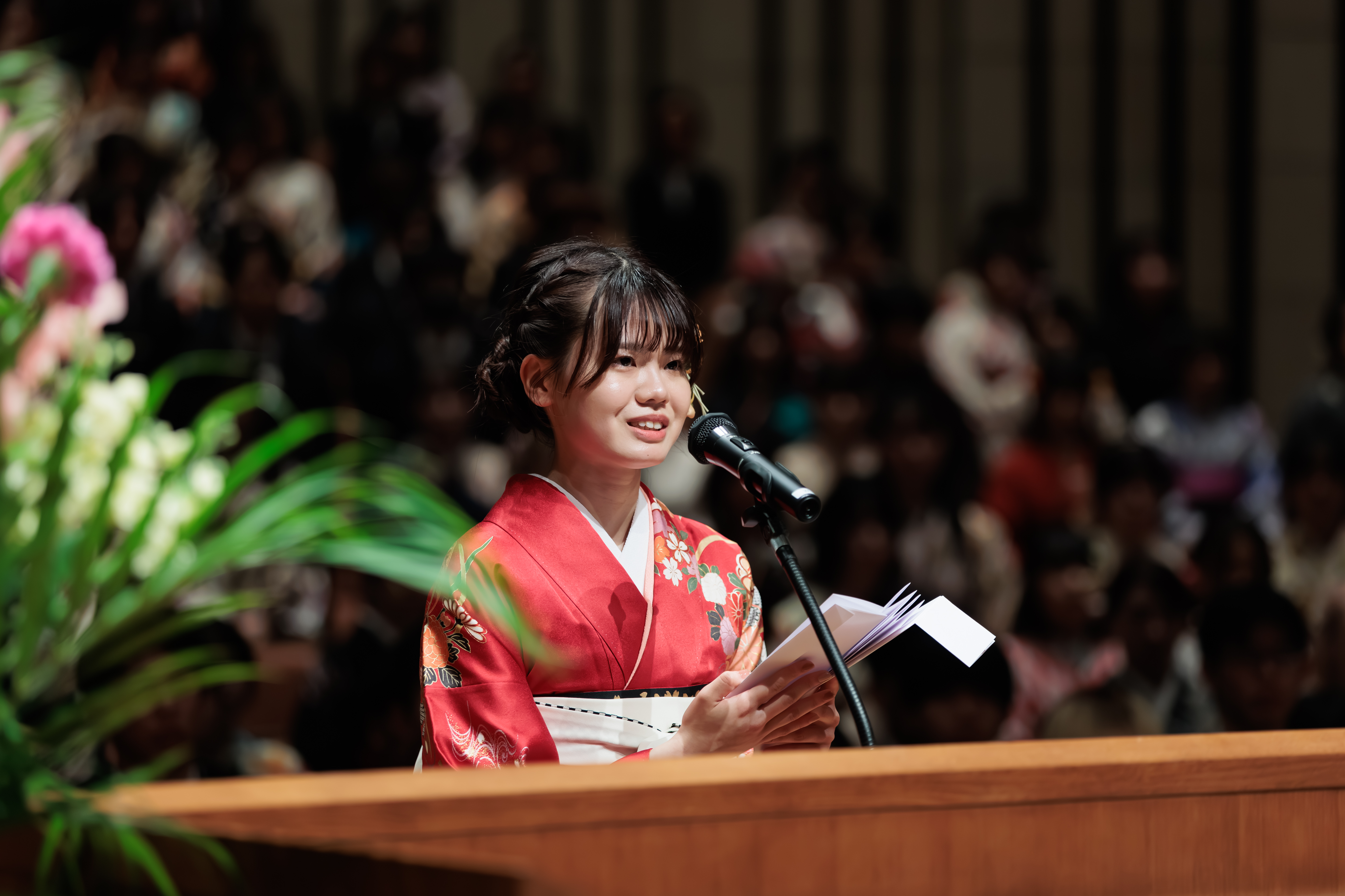 また、この日を心待ちにされ、皆さんをあらゆる形で支えてこられたご家族、関係者の皆さまに大学を代表して深く御礼を申し上げます。皆さまの温かい励ましとご協力があったからこそ、本日の晴れの門出を迎えることができました。