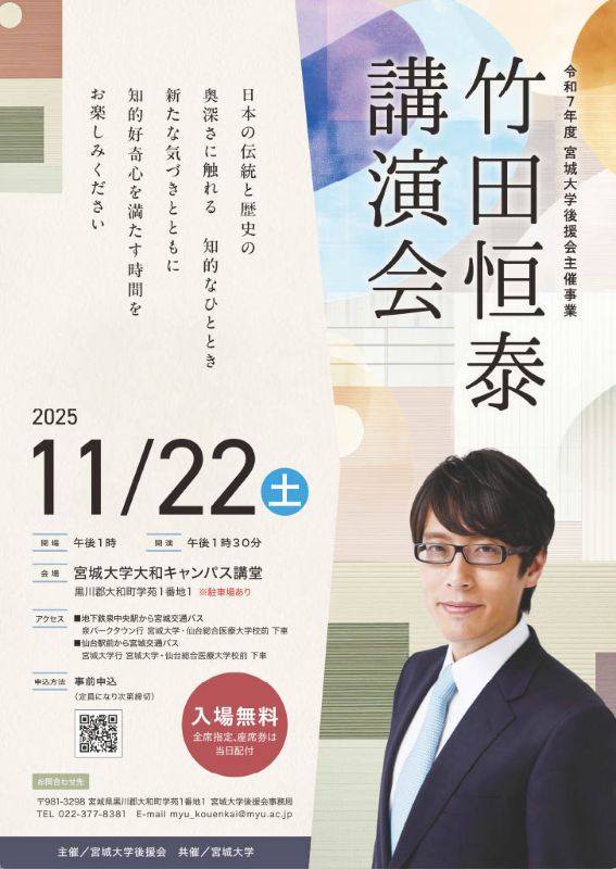 宮城大学後援会では、会員および地域の皆さまへの文化的貢献を目的として、今年度は作家・竹田恒泰氏をお招きし、講演会を開催いたします。