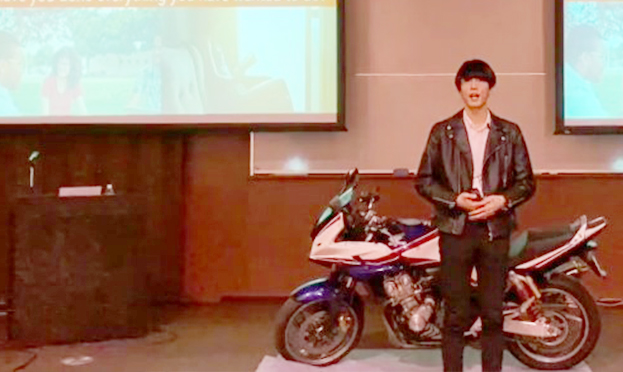 学生たちは、自らの考えや趣味、国際交流など様々なテーマのもと、自身の体験なども交えて発表を行いました。今年度もオンライン開催に合わせて事前にそれぞれが好きな場所で動画を撮影したため、個性豊かなプレゼンテーションとなりました。中には自らのバイクを見せながらプレゼンテーションを行う学生もいました。