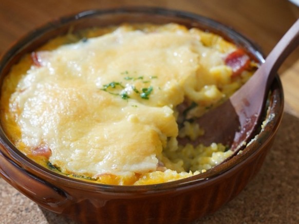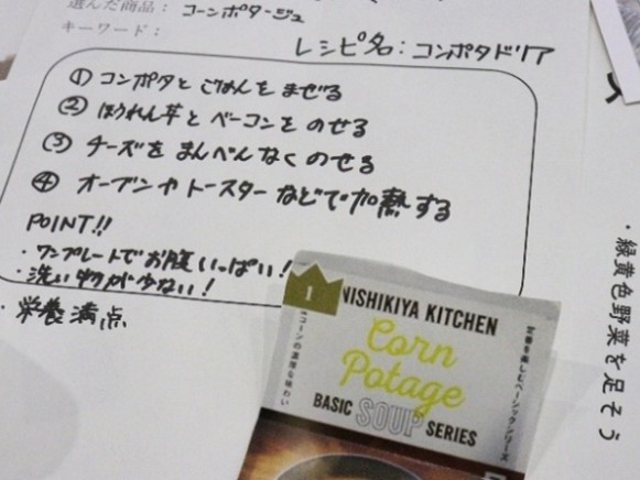 次に、グループごとに考案したレシピについて、レシピ名や作り方、アピールポイントについて発表し、最優秀レシピを選ぶために参加者全員による投票を行いました。投票の結果、最優秀レシピに選ばれたのは、「コーンポタージュ」に「栄養バランス」のお題を組み合わせた「コンポタドリア」です。このレシピは、緑黄色野菜であるほうれん草を加えて彩りと栄養価を高めている点や、普段食卓では脇役のスープが主役メニューに生まれ変わった点が高く評価されました。