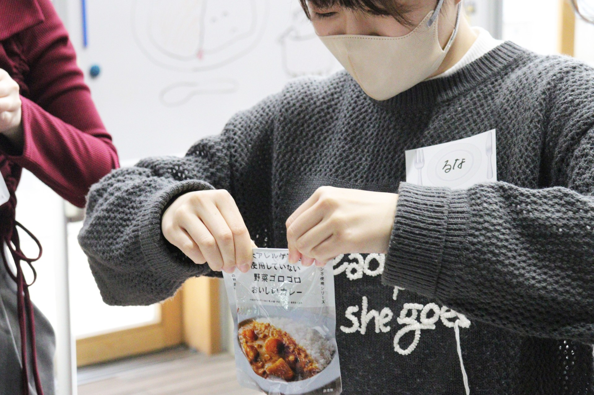 「NISHIKIYA KITCHEN(ニシキヤキッチン)」は、宮城県岩沼市に本社と工場を置くレトルト食品専門店で、 “世界の料理を「カンタン」に。”というコンセプトで約120種類のレトルト食品を販売しています。当日は、同社広報担当の板花未来さんと森智恵さんによる講話と、NISHIKIYA KITCHENのレトルト食品を使ったグループワークを行いました。講話では、同社の人気商品であるインドカレーシリーズの開発秘話や、レトルト食品に使用する素材や製法へのこだわり、ローリングストックの具体的手法と災害時におけるレトルト食品の活用法が紹介されました。さらに、災害時を想定し、はさみがない状況でもパウチをきれいに開封する方法についてレクチャーを受けるとともに、常温のレトルト食品と温めたレトルト食品の食べ比べを行いました。