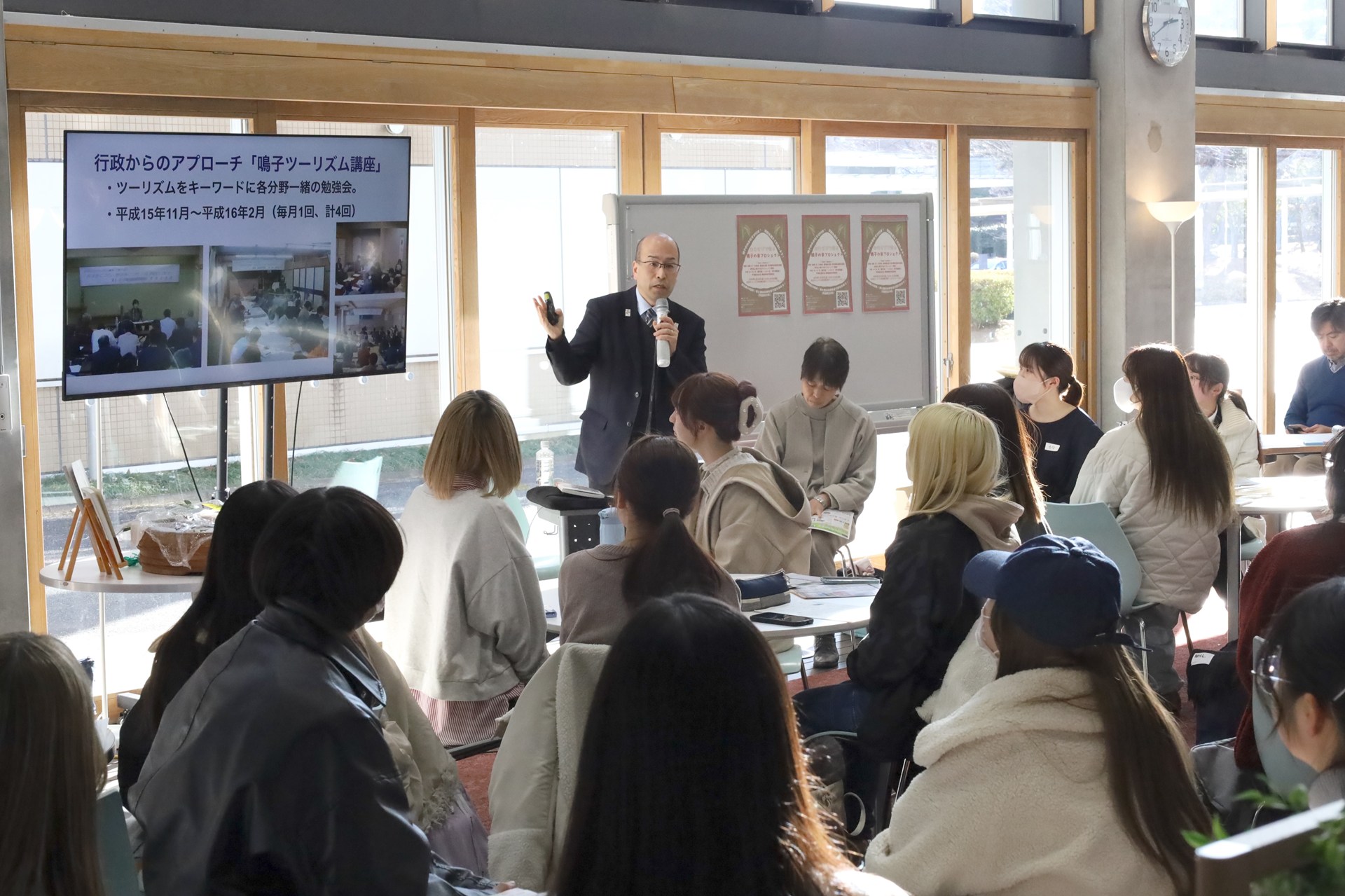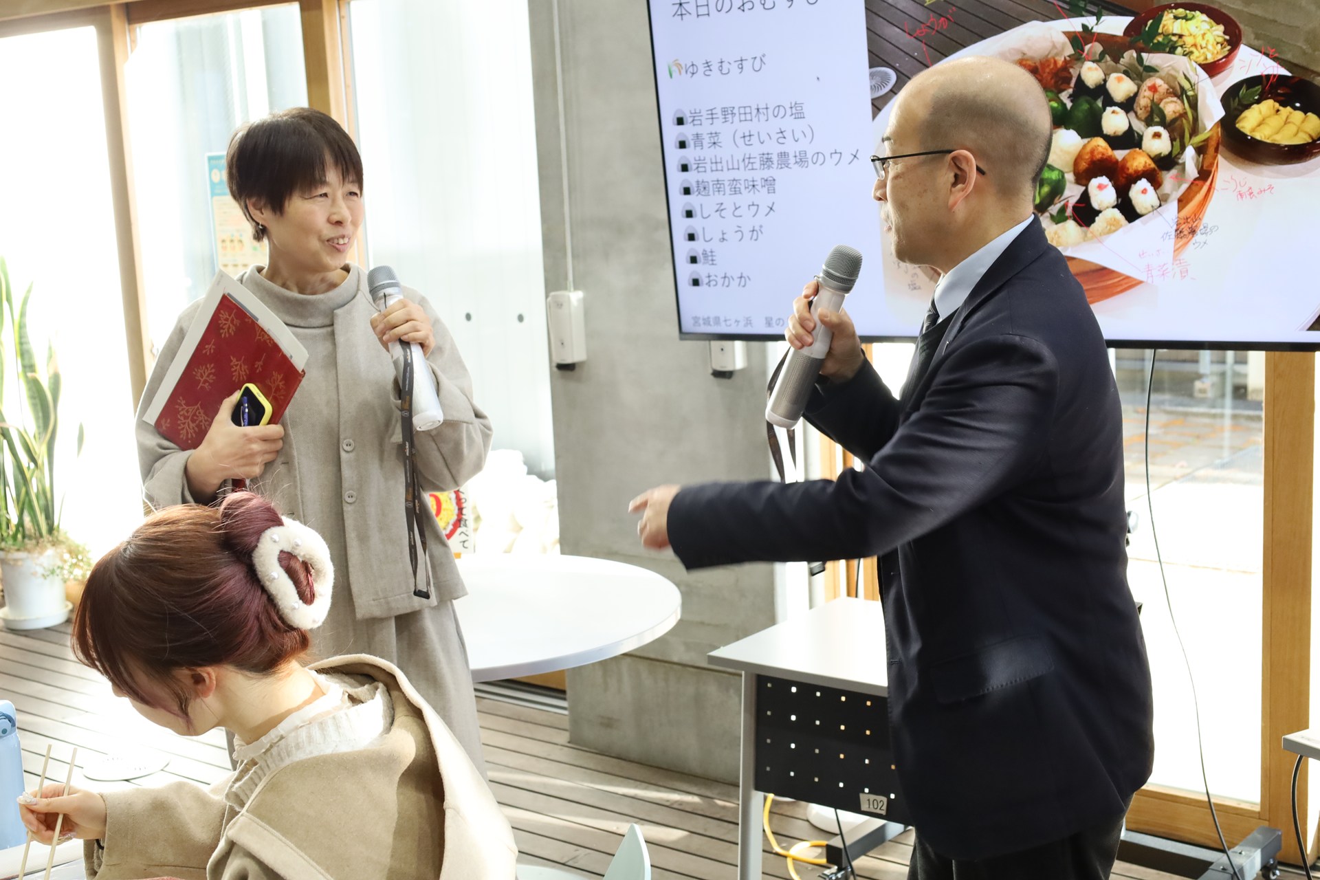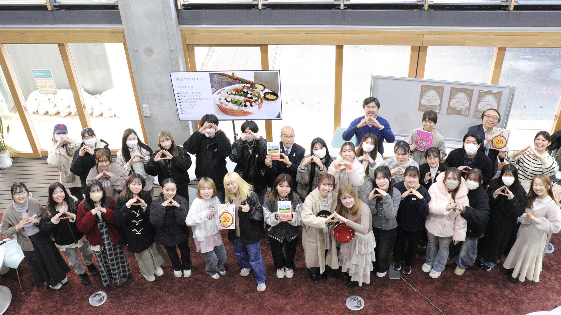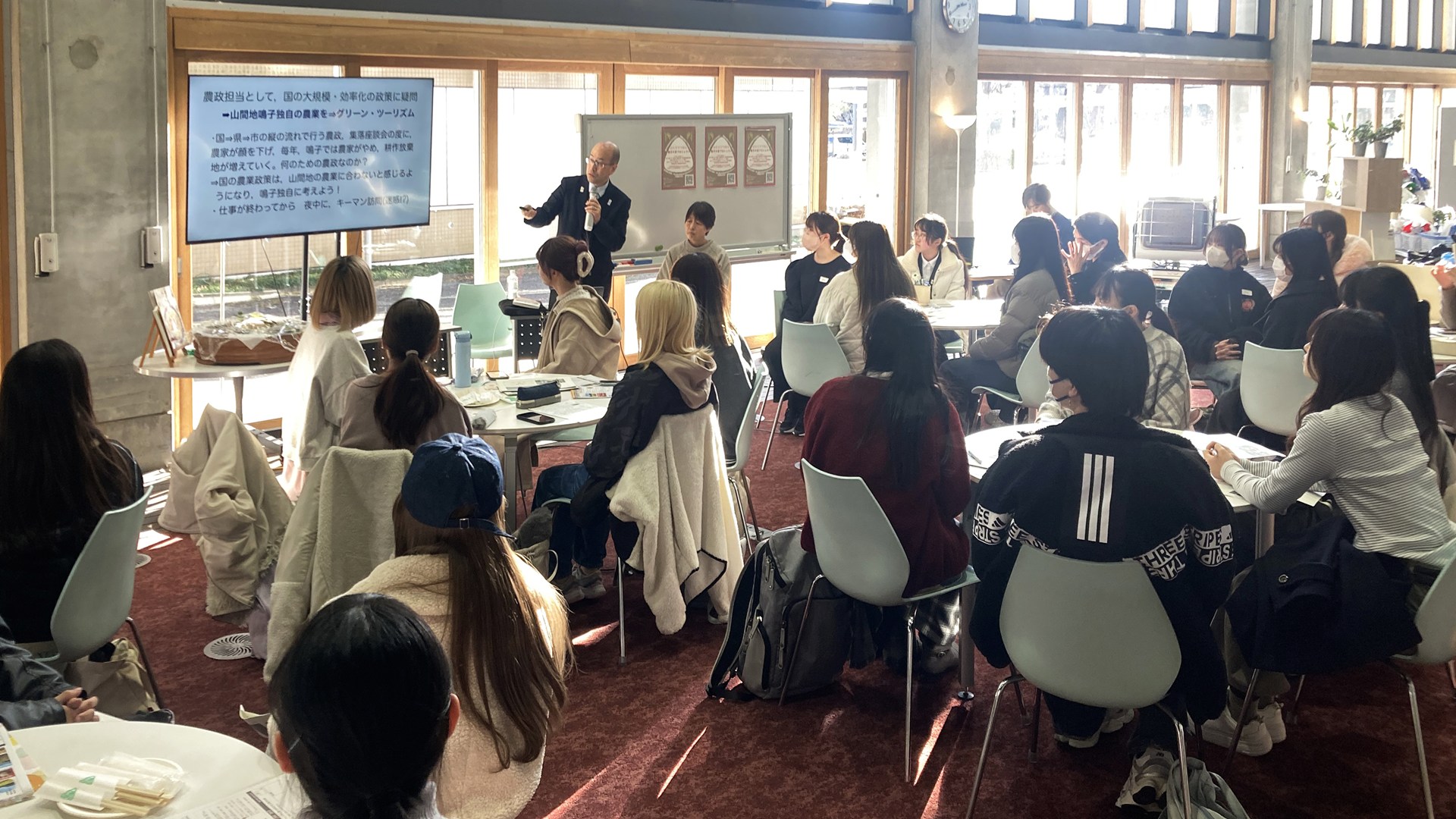 2026年1月30日、本学太白キャンパスのディスカバリーコモンズにて、学生向け勉強会「おむすびで知る 鳴子の米プロジェクト ―『鳴子の米プロジェクト』から食と農・地域の未来を考える―」を開催しました。食料や農業をめぐる環境が大きく変化するなかで、大崎市鳴子温泉地域において、CSA(地域支援型農業)による持続可能な農業・農村づくりを目指し、今年で活動20年目を迎える「鳴子の米プロジェクト」の取り組みを題材に、食と農、そして地域の課題を多角的な視点から考える機会とすることを目的として企画したものです。本イベントは、太白キャンパスのディスカバリーコモンズと研究推進・地域未来共創センター、大崎市が連携して開催したもので、事業構想学群の「事業構想特別講義Ⅳ」ともタイアップし、食産業学群および事業構想学群の学生30名が参加しました。