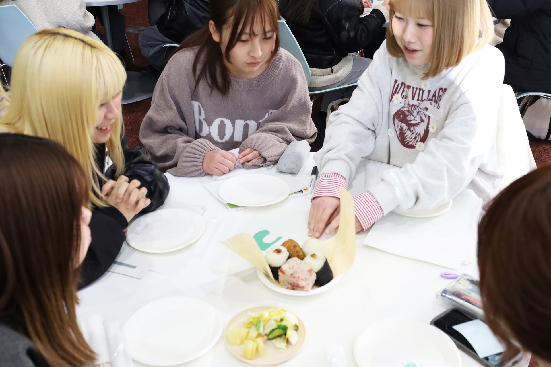 後半は、「鳴子の米プロジェクト」で栽培されている品種「ゆきむすび」のおむすびを味わいながら、学群や学年を超えたグループで意見交換を行いました。おむすびの具材や器・桶などに至るまで、地域の素材や職人の技が生かされていることも紹介され、学生たちは一つのおむすびに込められた物語に触れながら、地域資源を生かした取り組みの意義や、持続可能な地域づくりについて理解を深めるとともに、それぞれの学群の視点から多角的に食と農を考える貴重な機会となりました。